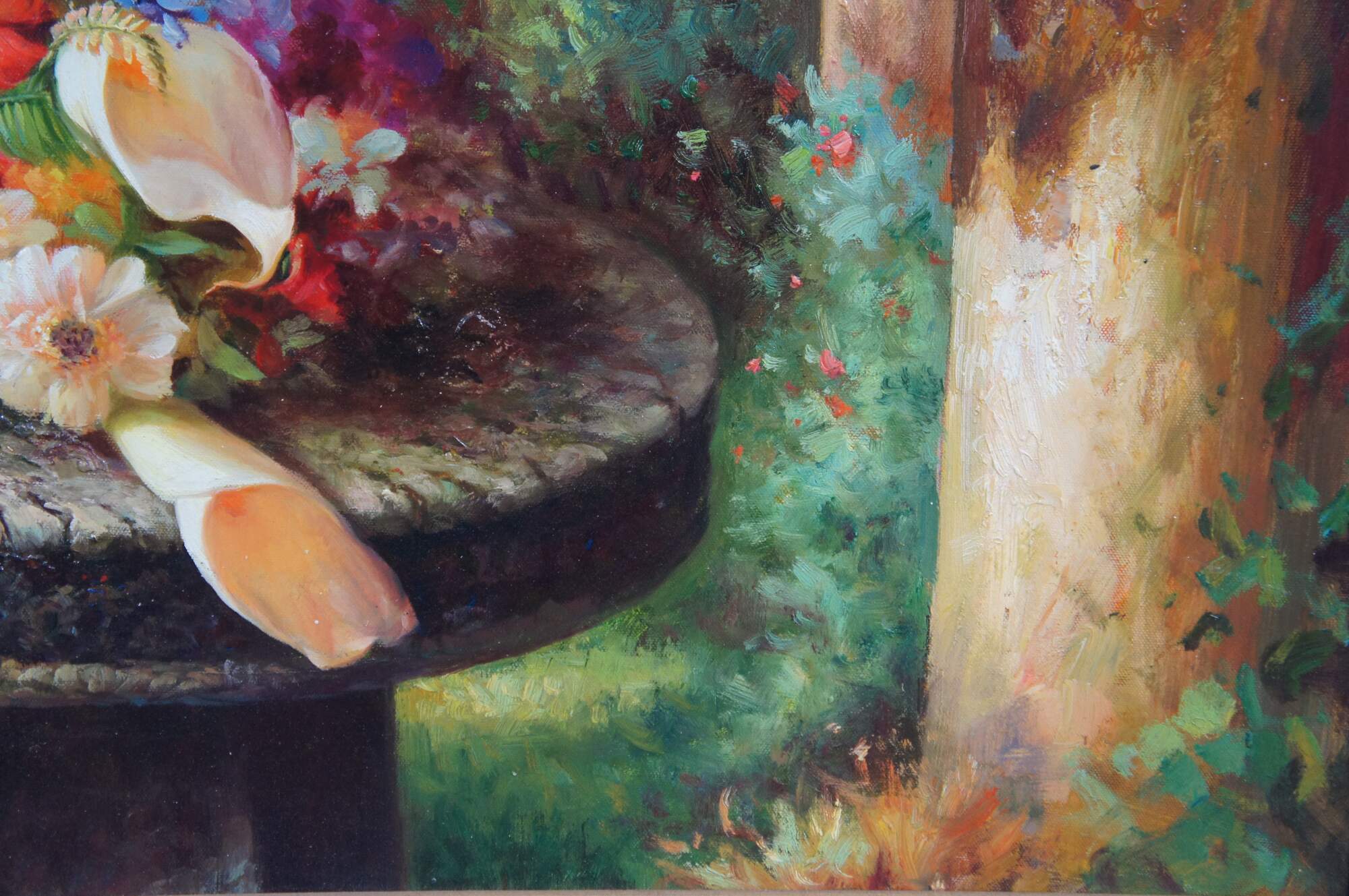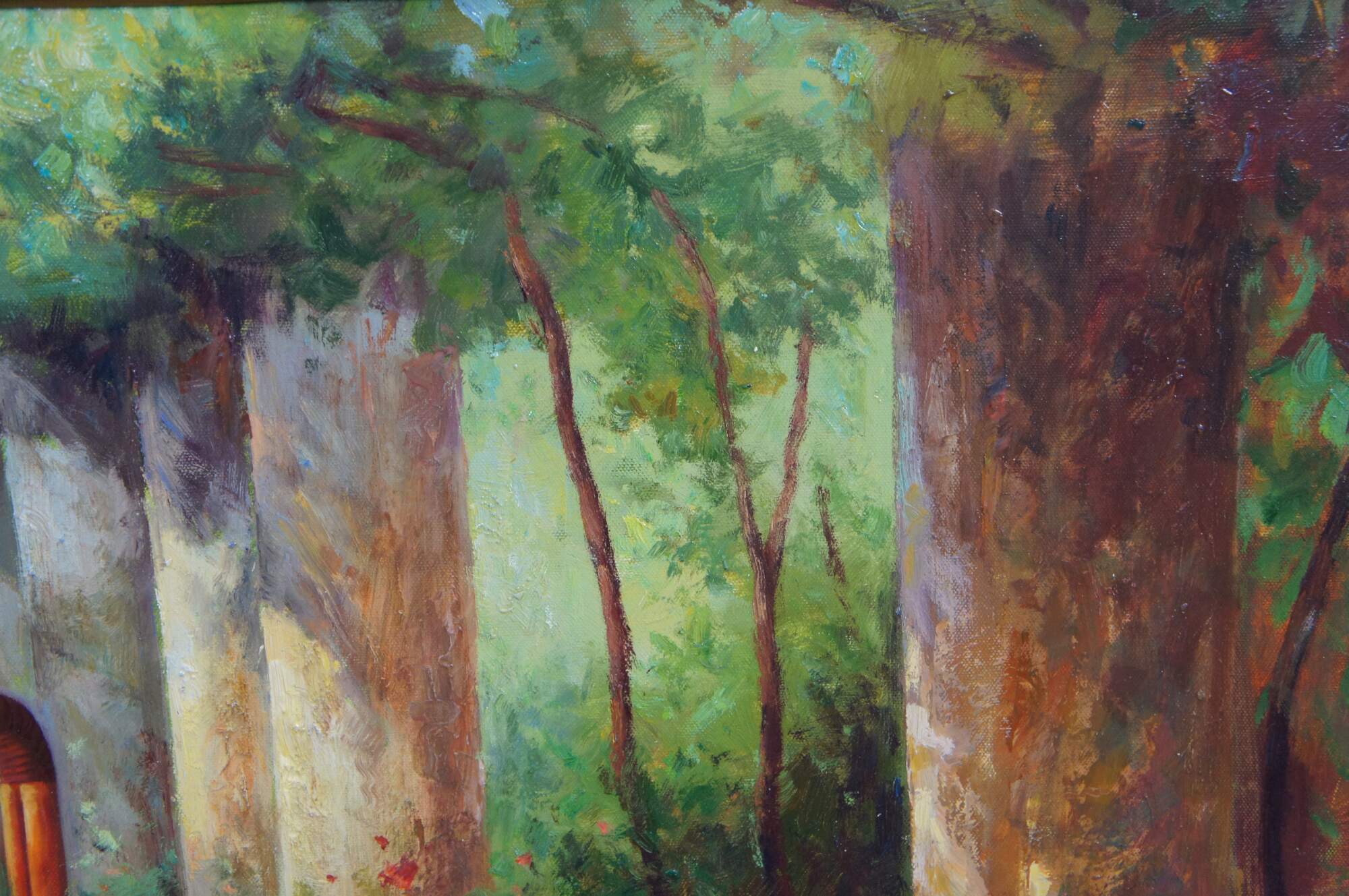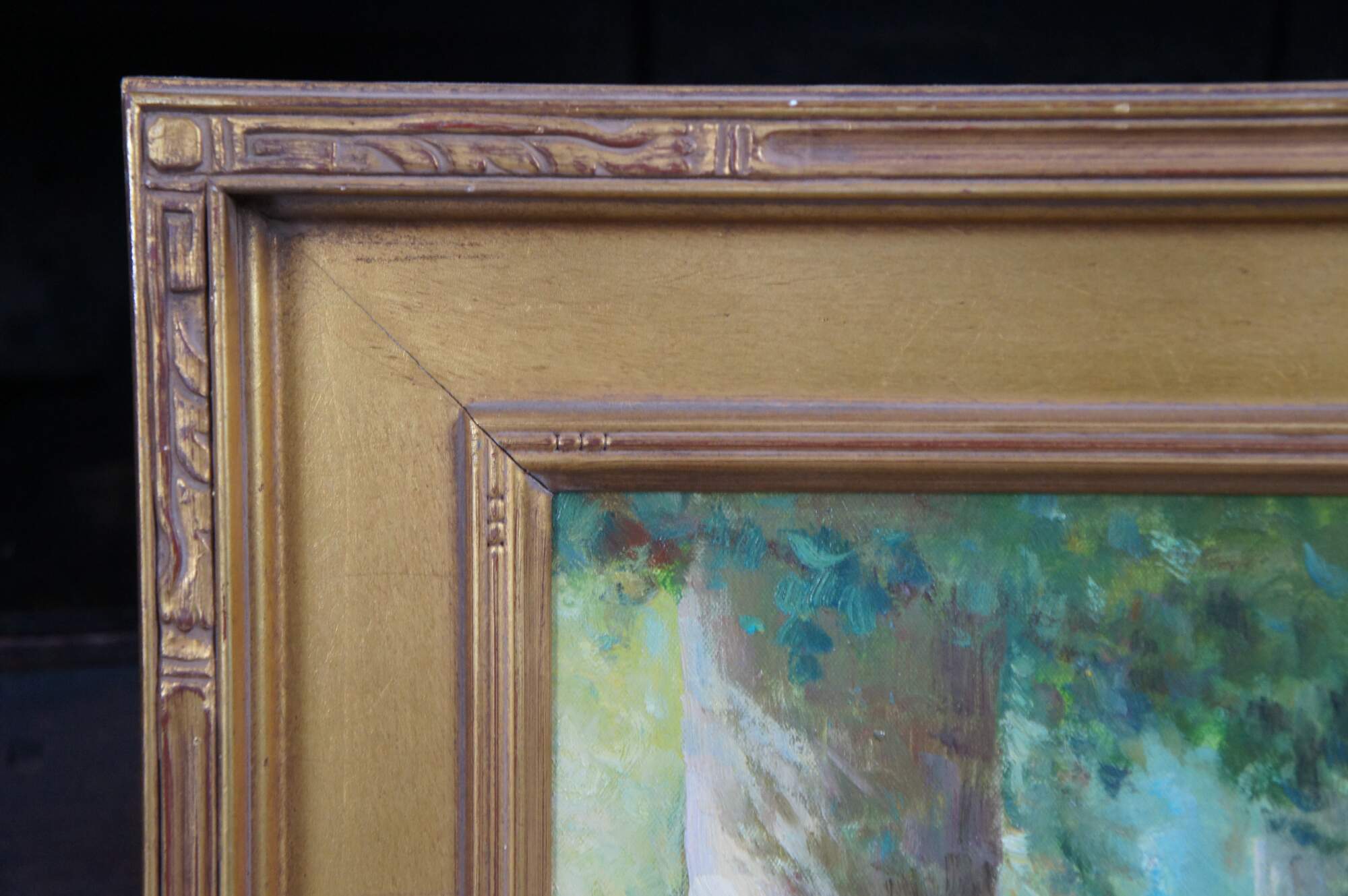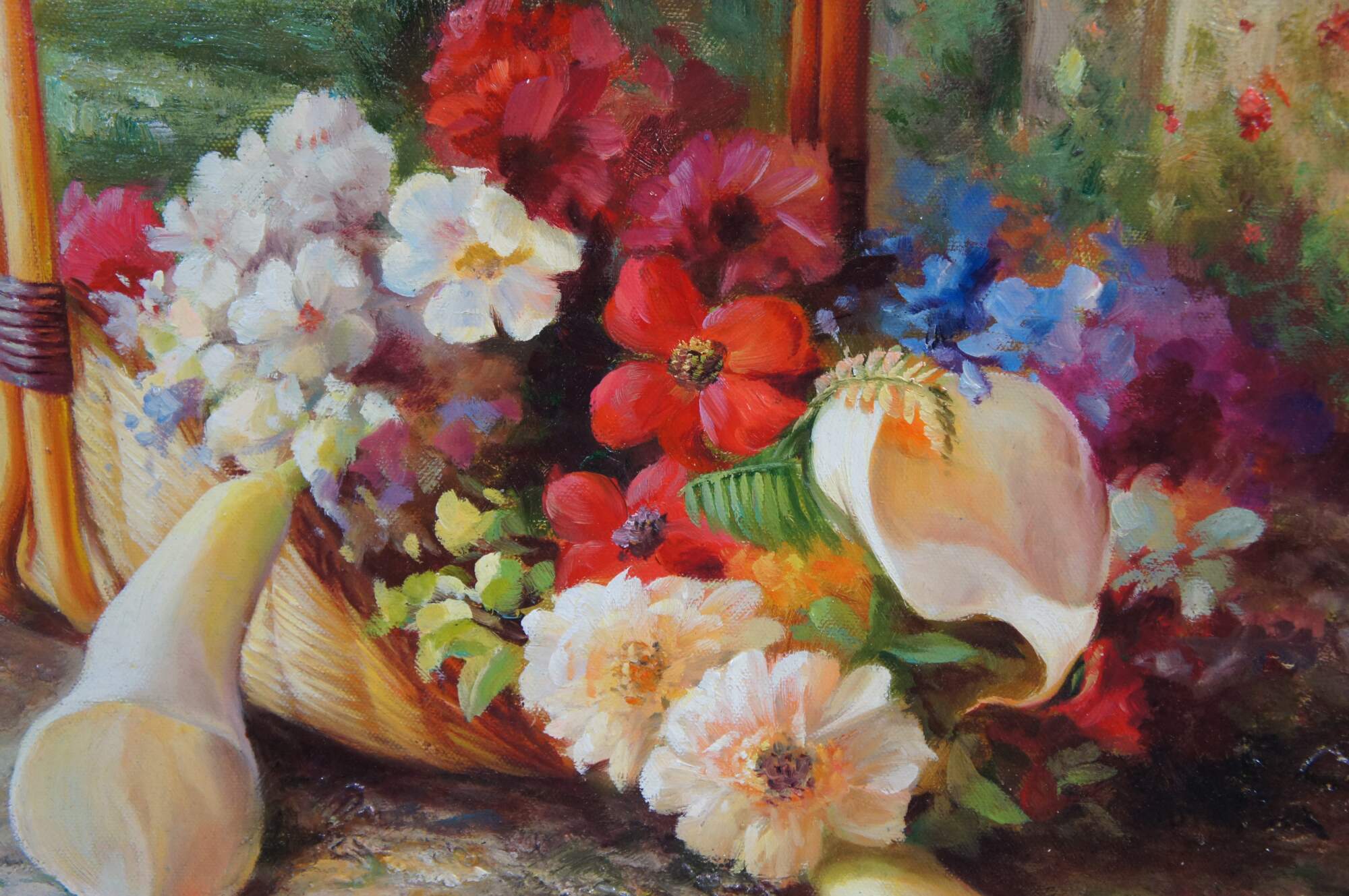 Vintage Le Nain Pierre still life oil painting on canvas featuring an impressive French garden scene with columns, trellis, and a basket of flowers.