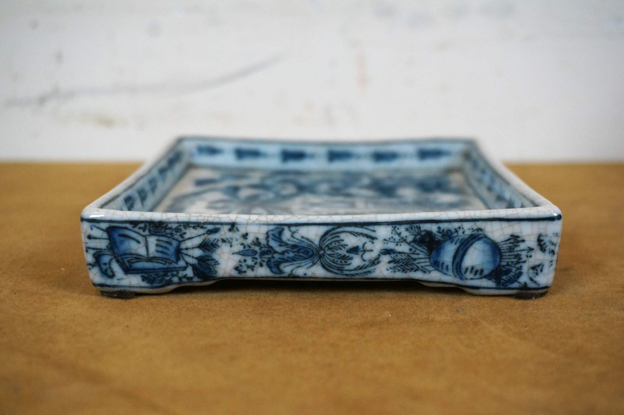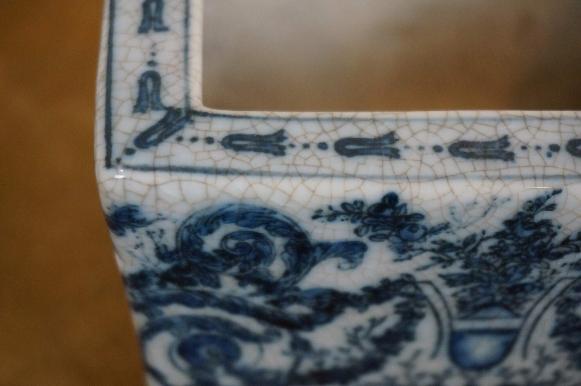 Late 20th century rectangular porcelain planter and underplate by United Wilson. Blue and white Chinese Export design of folitae, flowers and horns, finished with factory distressed crazing. Distributed by Floral Emporium Inc.