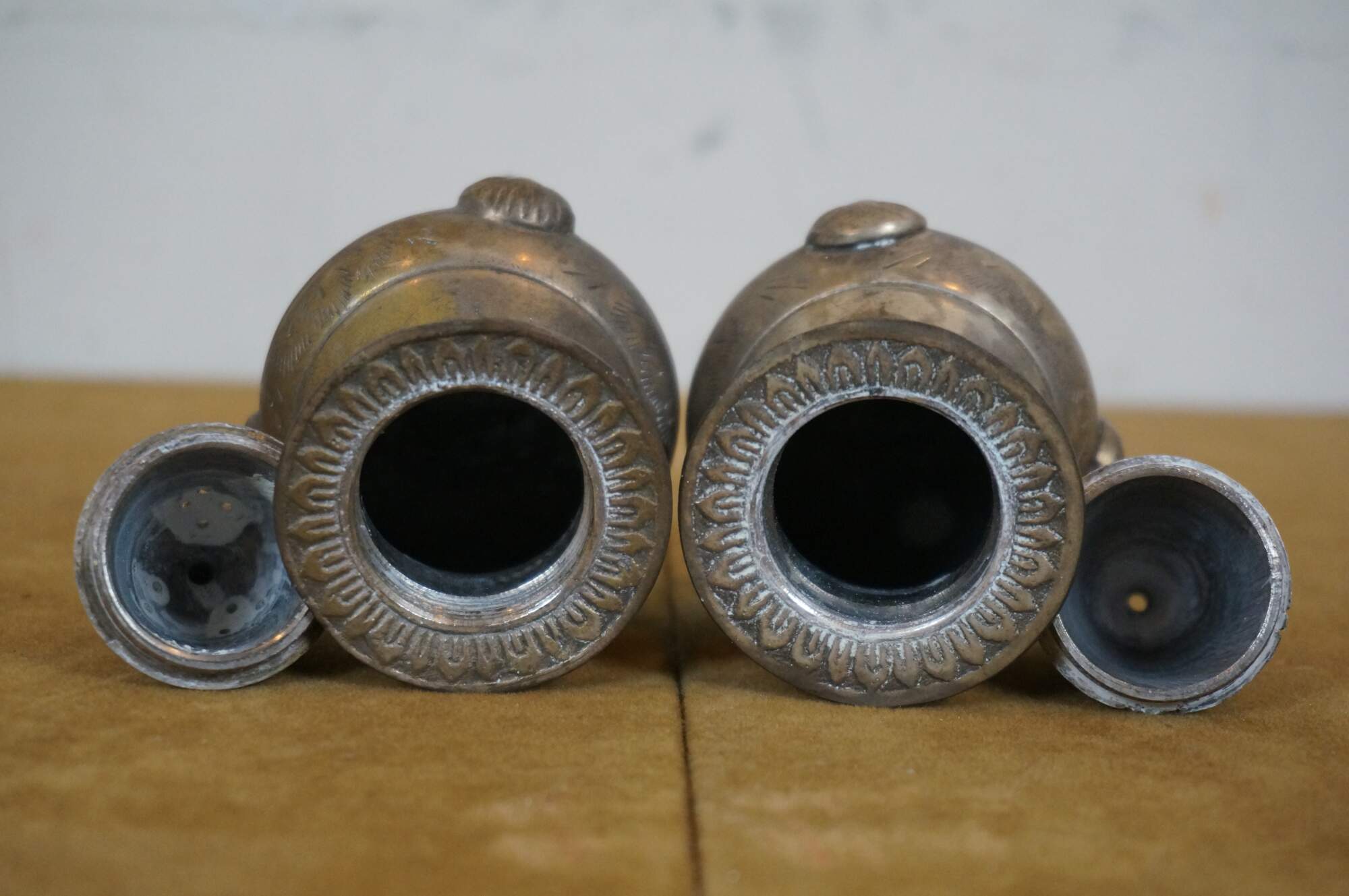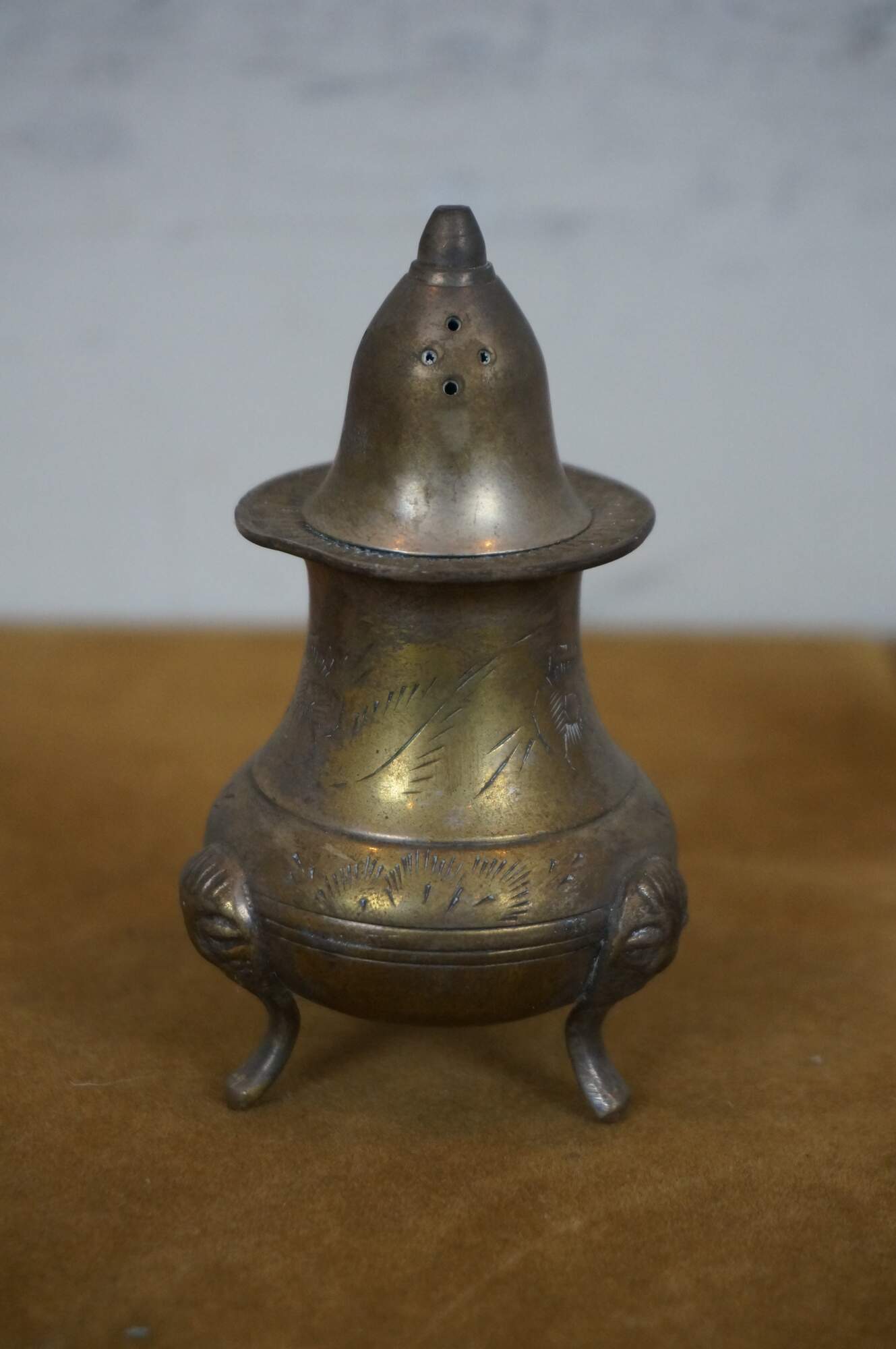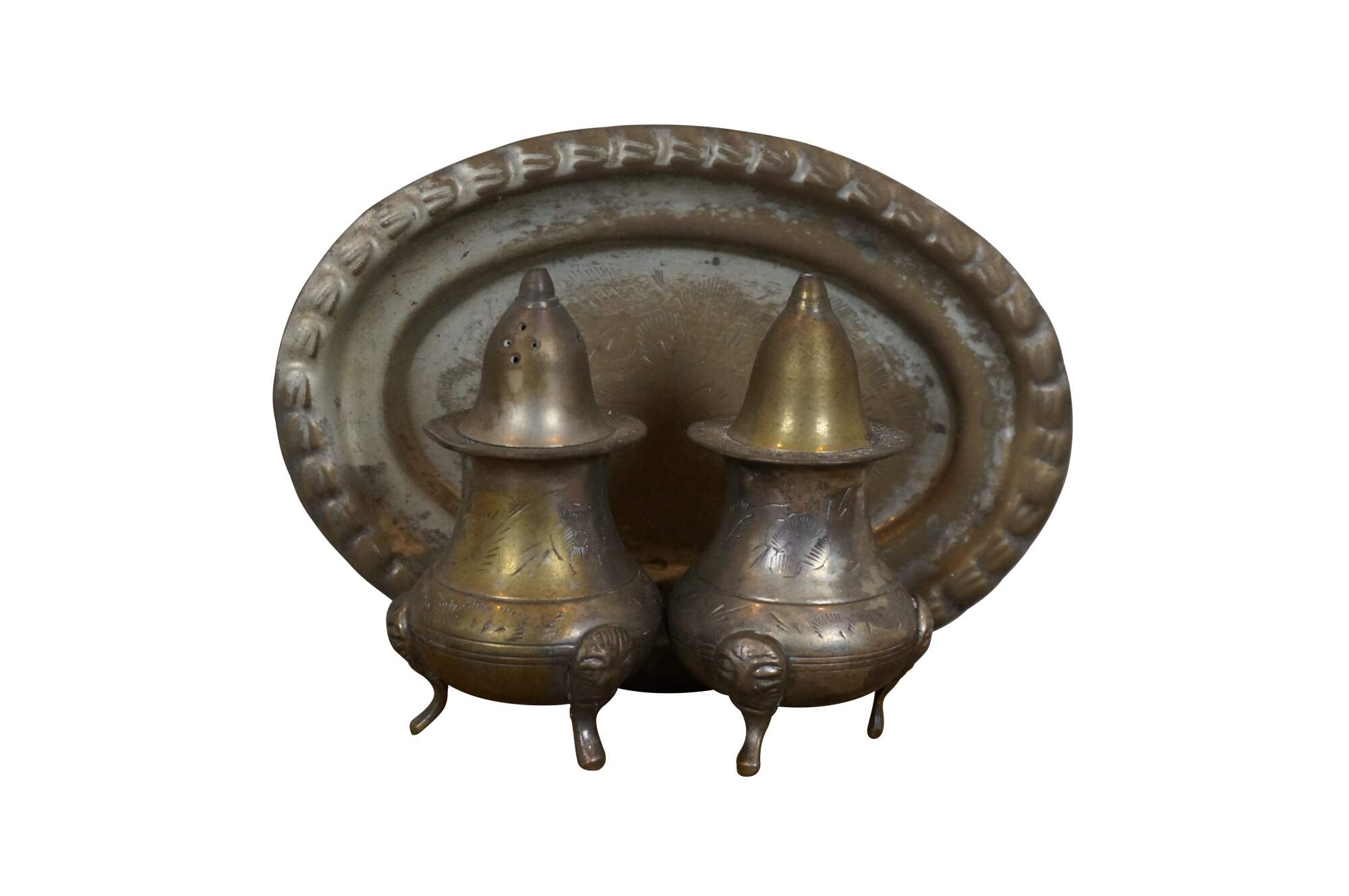 Charming 20th century three piece silverplate cruet set, including a pair of footed, screw top salt and pepper shakers with lions head feet and an oval underplate, etched with a simple Indian floral design. Brass finish. Marked EPNS on base.