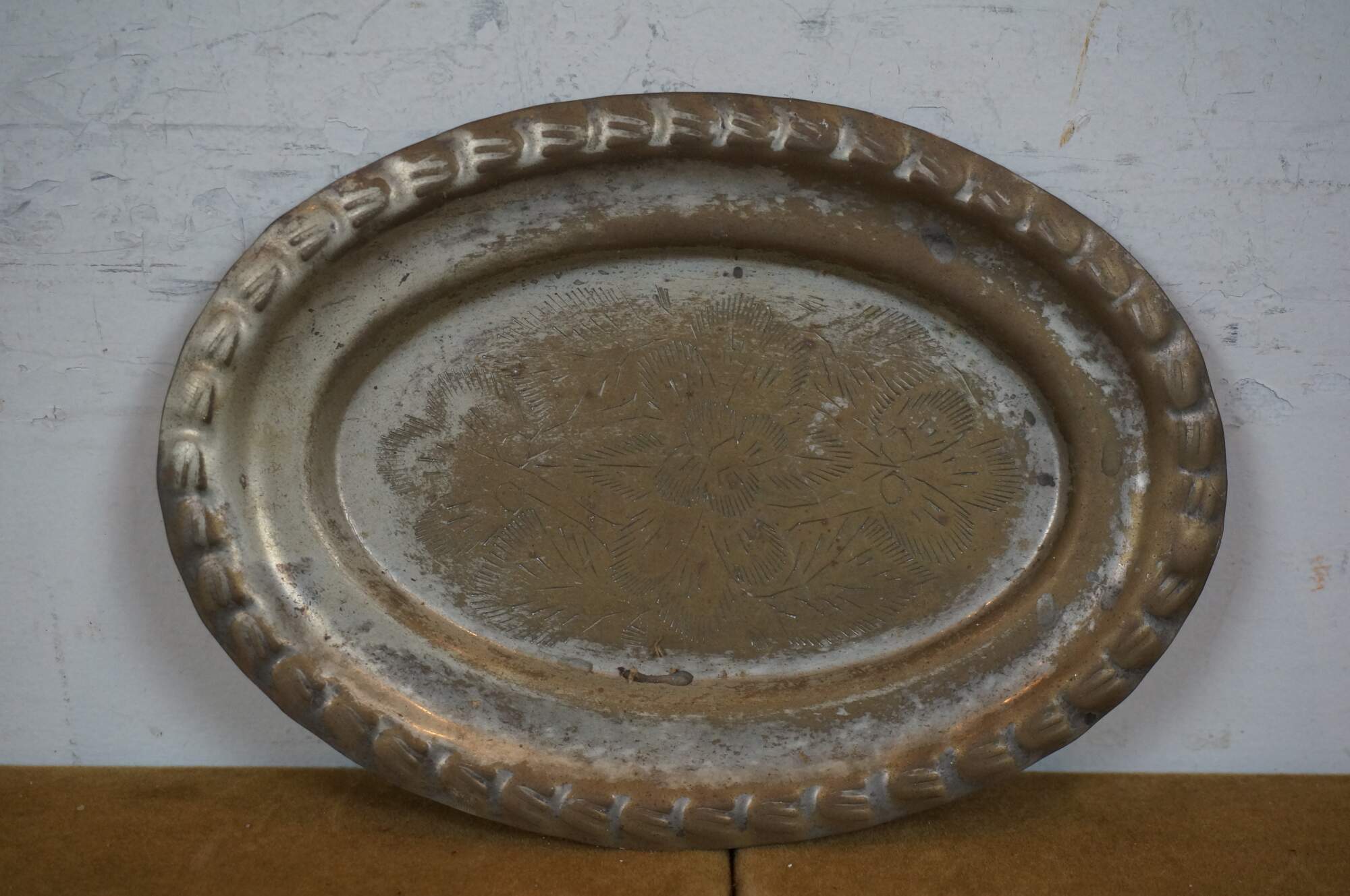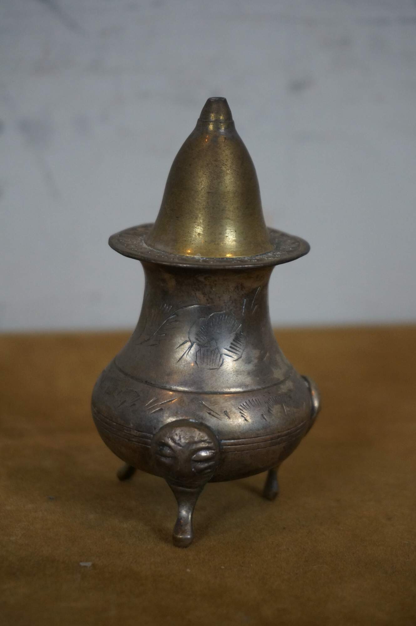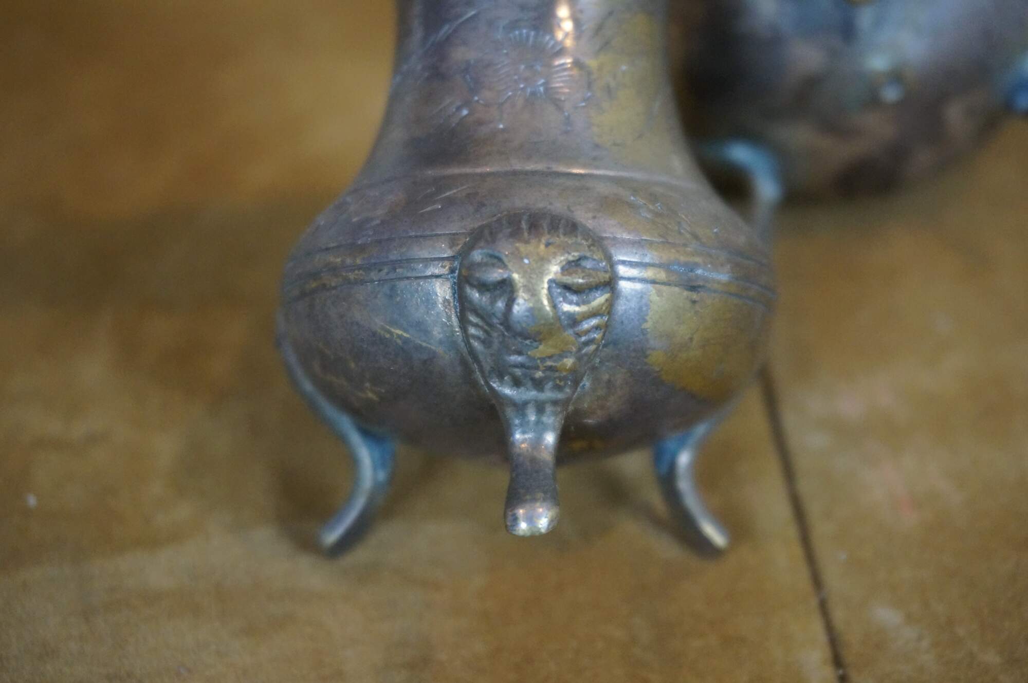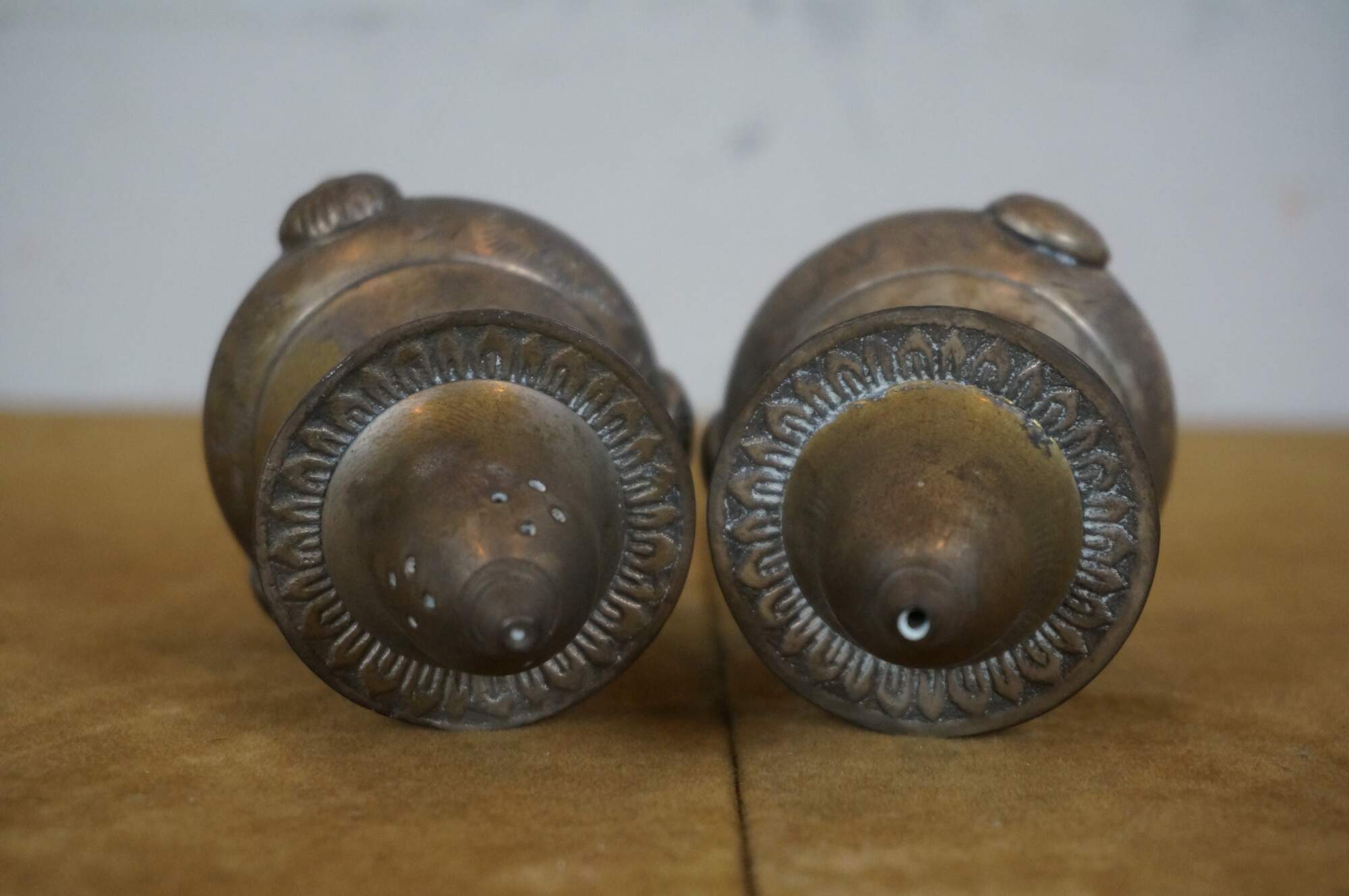Charming 20th century three piece silverplate cruet set, including a pair of footed, screw top salt and pepper shakers with lions head feet and an oval underplate, etched with a simple Indian floral design. Brass finish. Marked EPNS on base.