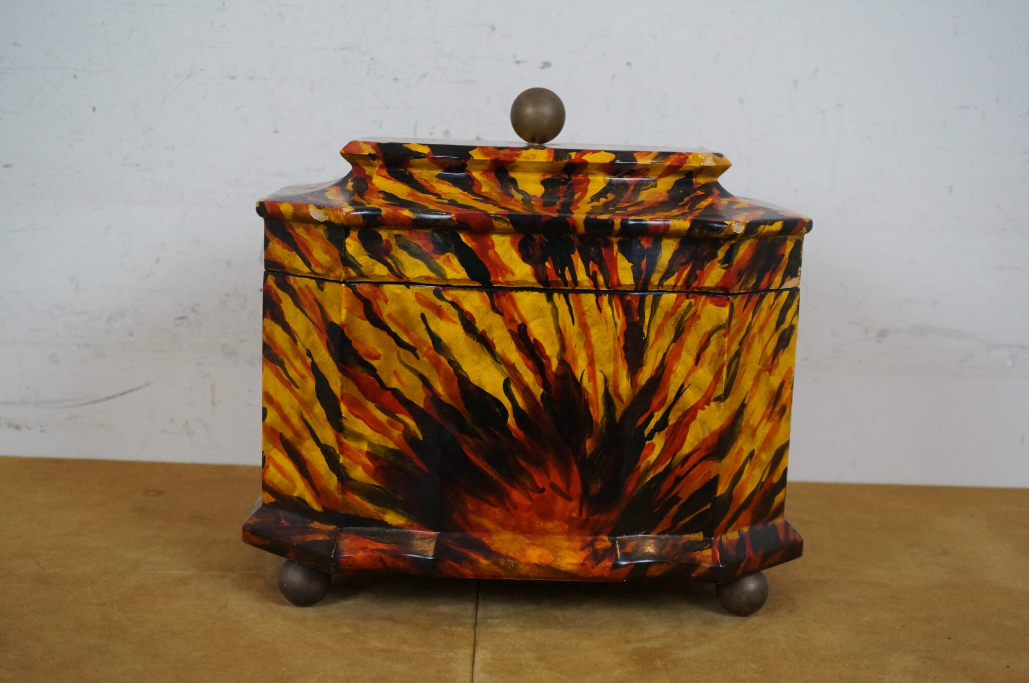 Late 20th century lacquered tea caddy / trinket box featuring George III styling with rectangular form, cut corners, gold ball feet and finial handle, painted in red, yellow and black to emulate tortoise shell.