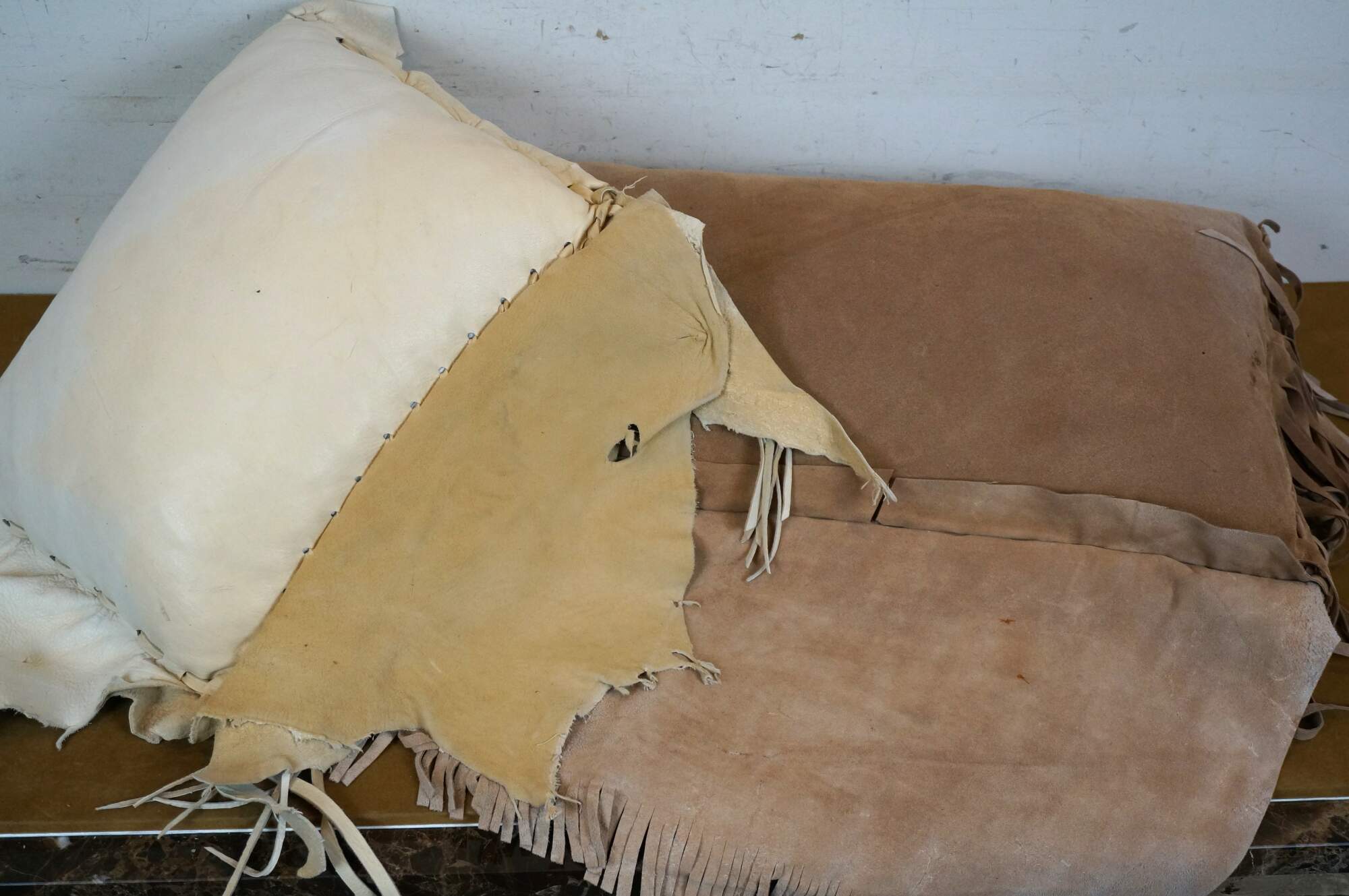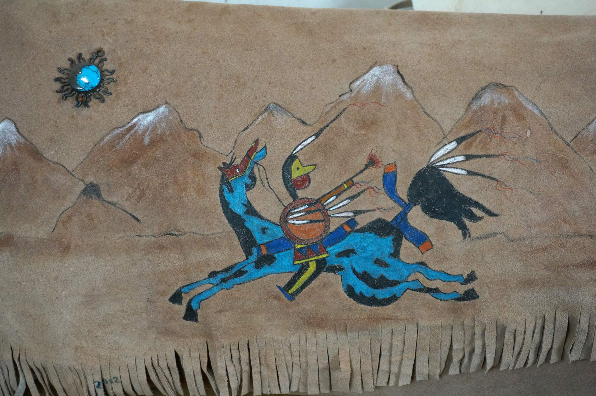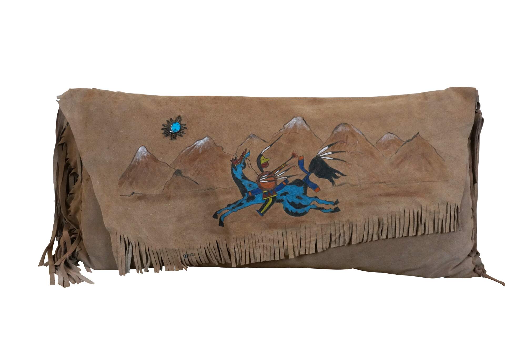 Pair of hand-painted Native American leather / deerhide throw pillows. Brown lumbar pillow features a fringed design and depicts a pair of riders on a blue horse, galloping in front of a mountain range. Marked 2012. White pillow features asymmetrical edges on leather flaps, two concho accents, and a detailed bird under an orange sun. Signed "by Claudia 2012." Fiber-filled.