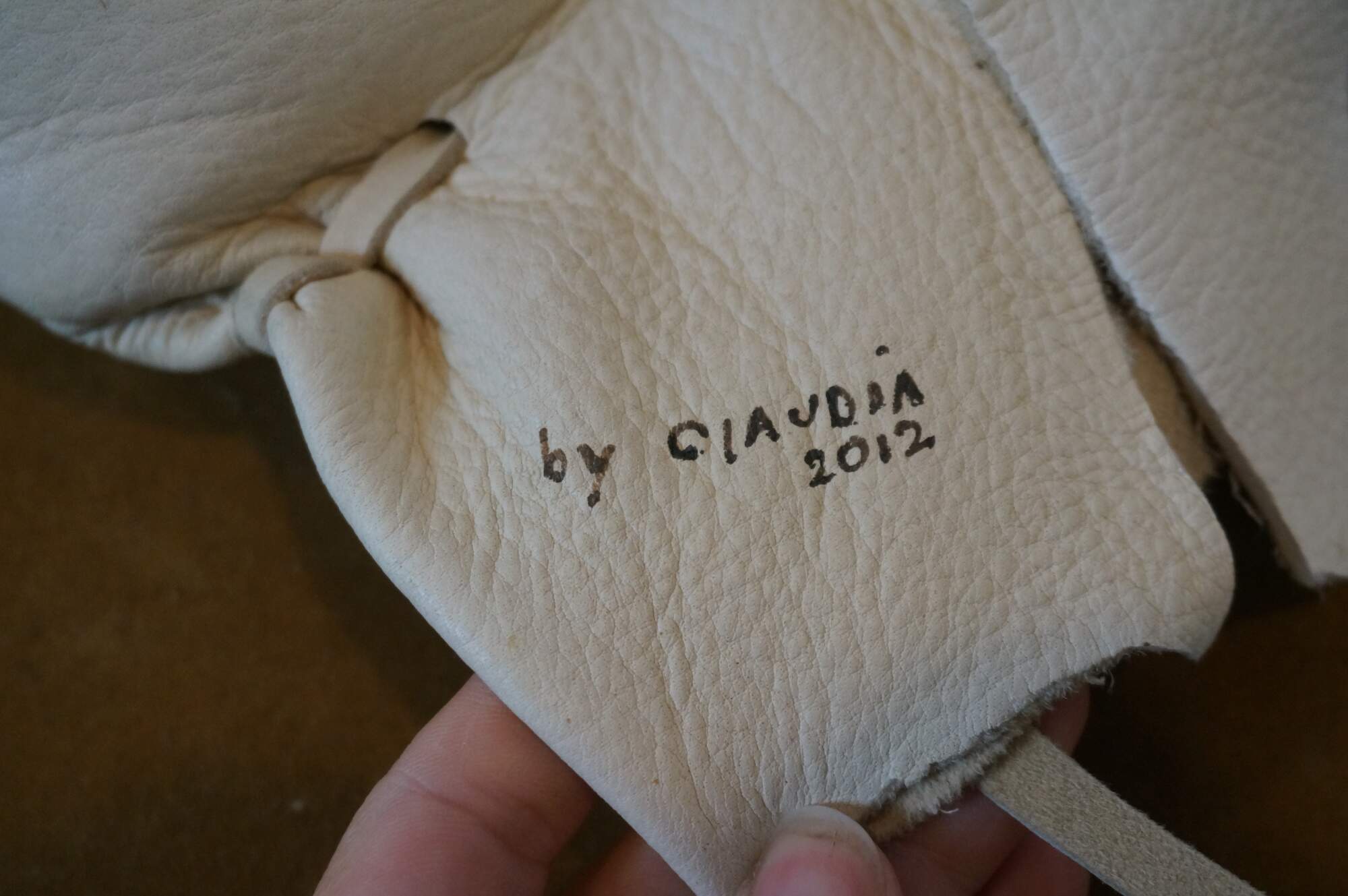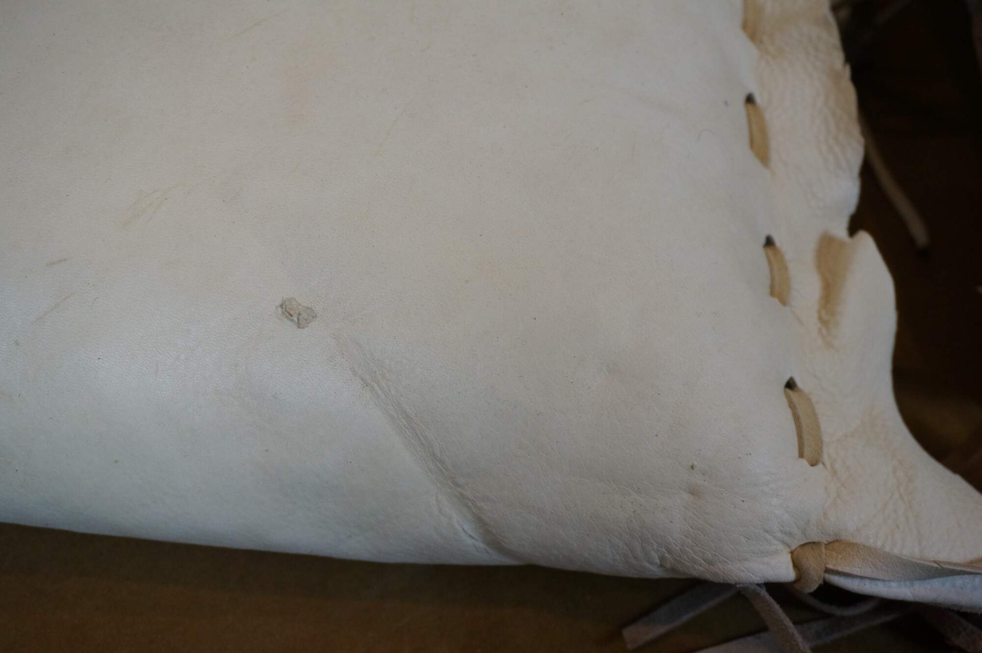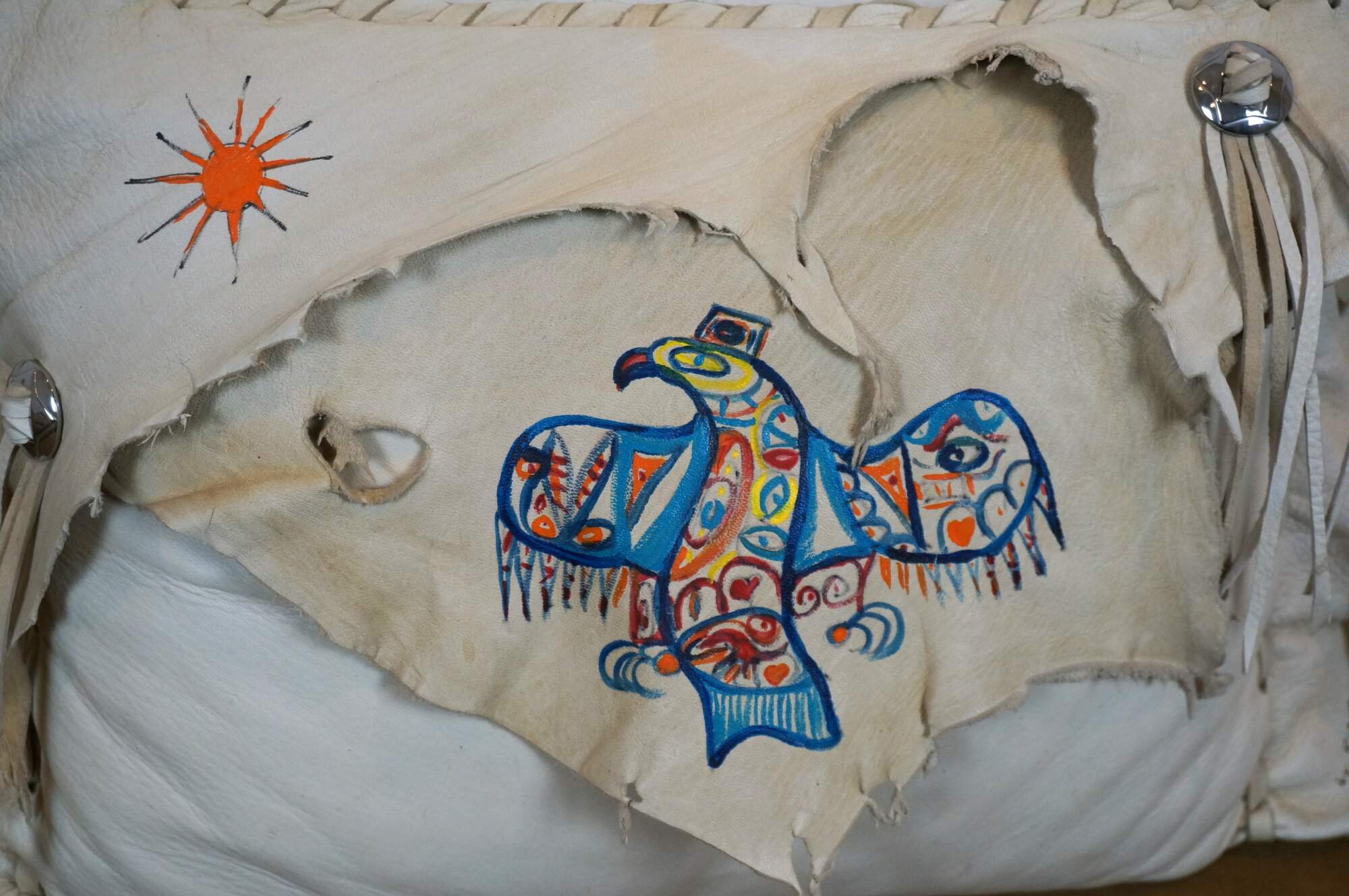 Pair of hand-painted Native American leather / deerhide throw pillows. Brown lumbar pillow features a fringed design and depicts a pair of riders on a blue horse, galloping in front of a mountain range. Marked 2012. White pillow features asymmetrical edges on leather flaps, two concho accents, and a detailed bird under an orange sun. Signed "by Claudia 2012." Fiber-filled.