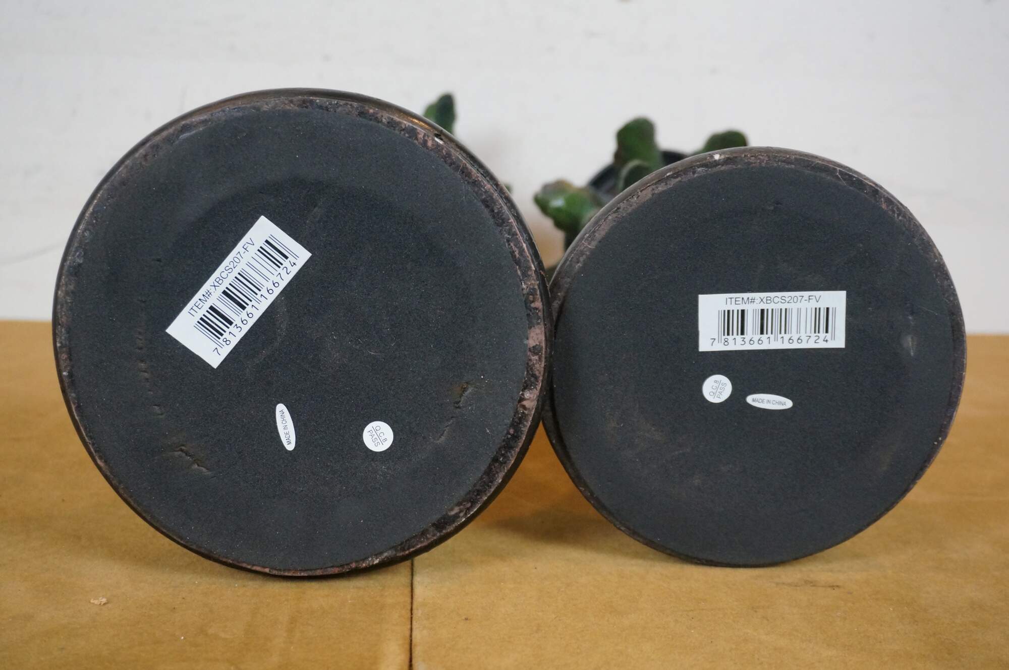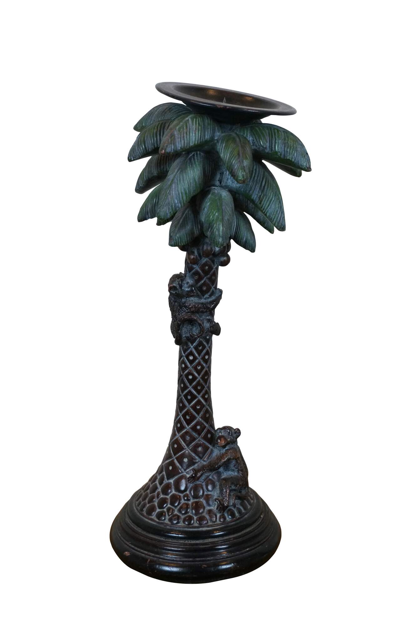 Pair of late 20th century resin candle holders in the shape of palm trees full of coconuts and two climbing monkeys, set on round-tiered bases. Metal candle cups on top feature a single spike for a pillar candle.