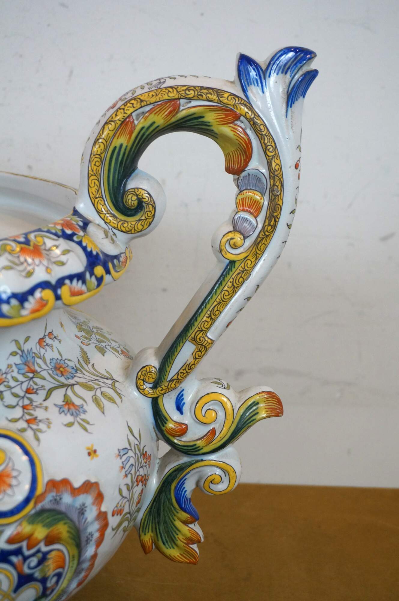 Antique French faience enameled porcelain urn / jardiniere / planter / cachepot featuring an ornate swirling foliate and floral design in blue, yellow, and orange on a white ground. Tapered oval shape with scalloped base and rim, and two scrolling foliate handles.