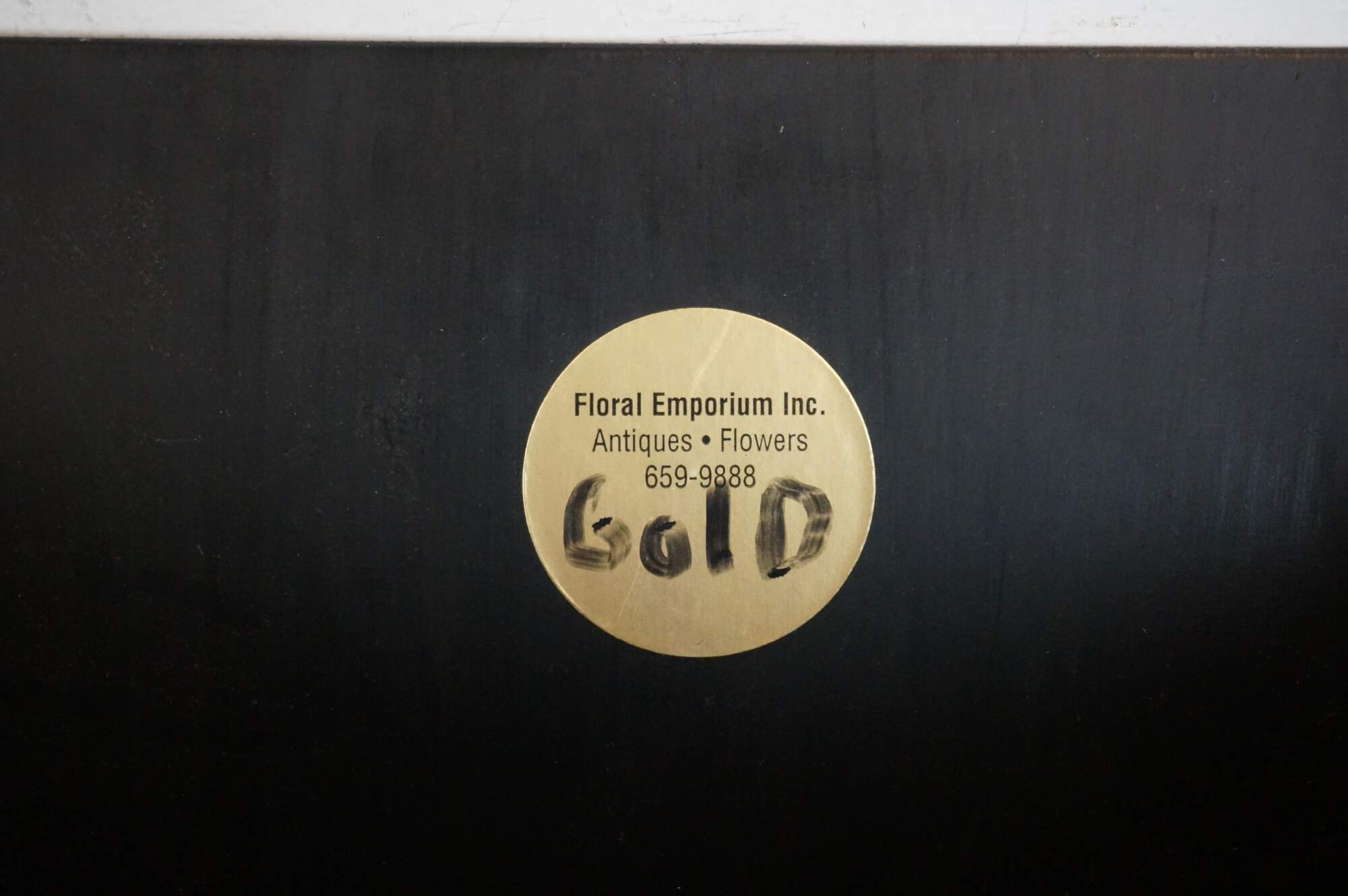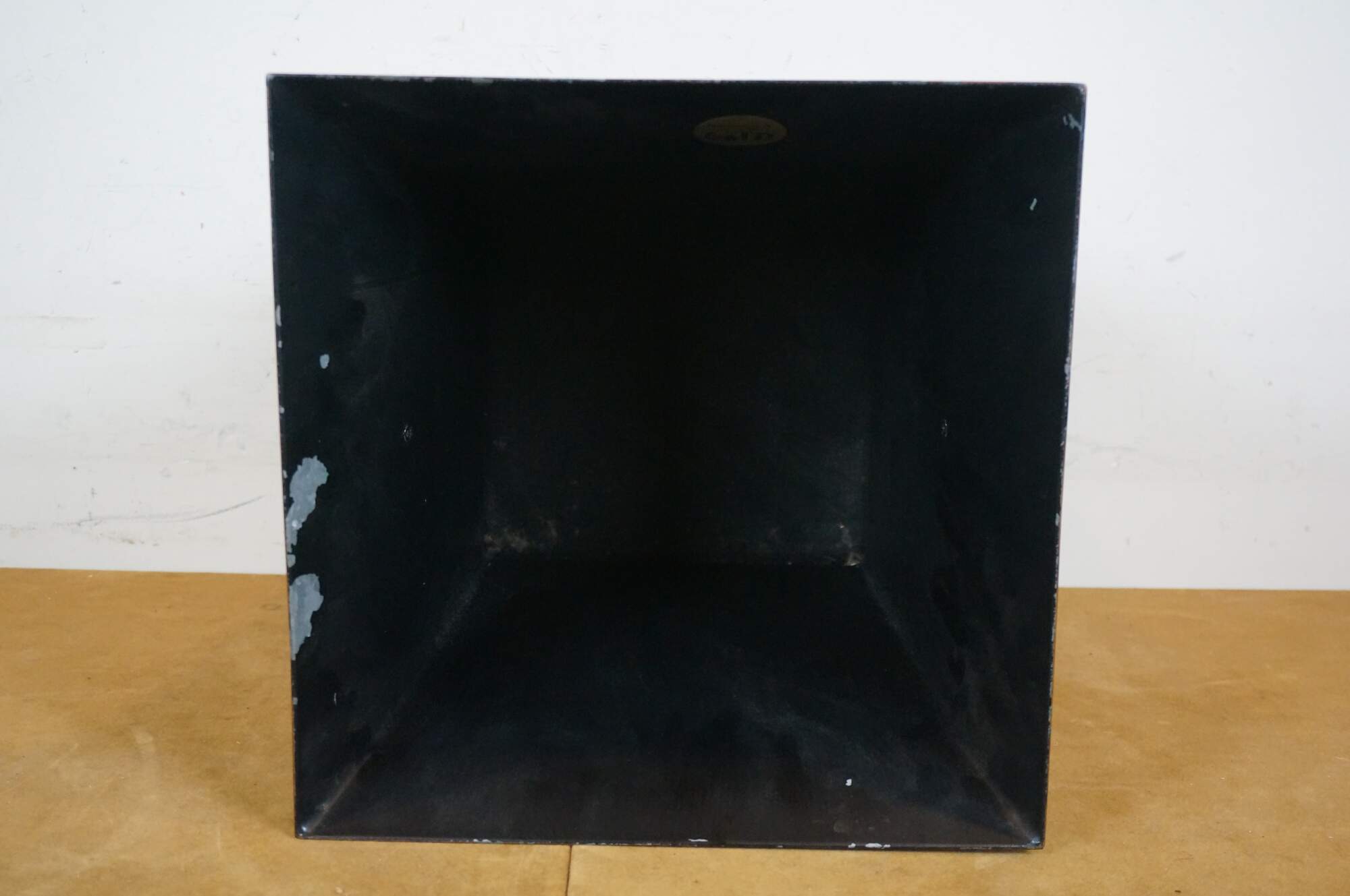 Late 20th-century tableware bin/ planter/ jardiniere - square shape with flared mouth and double ring handles, paw feet and square base, painted in black with a neoclassically inspired motif in gold of eagles, mermen blowing horns and flaming urns.