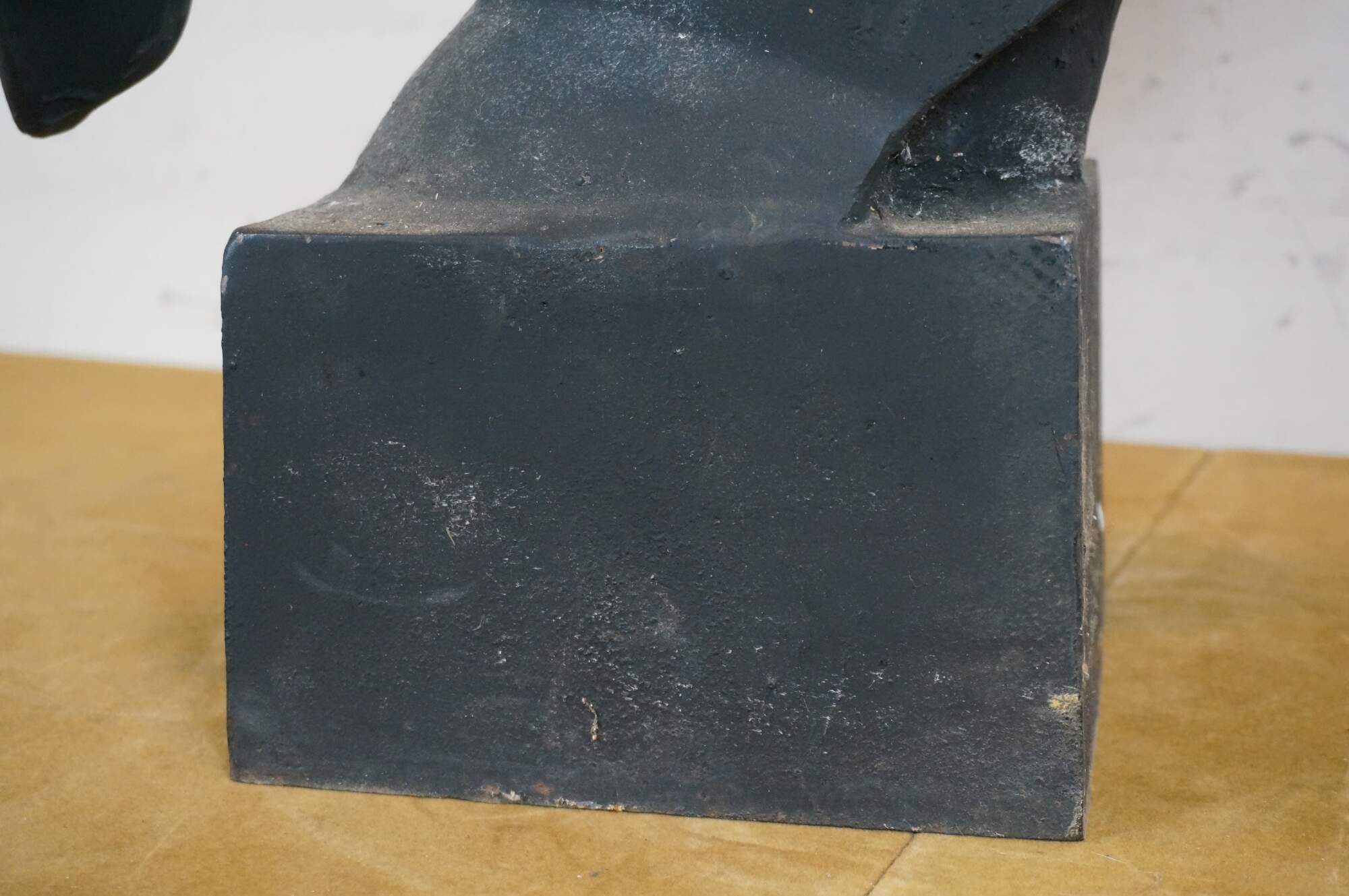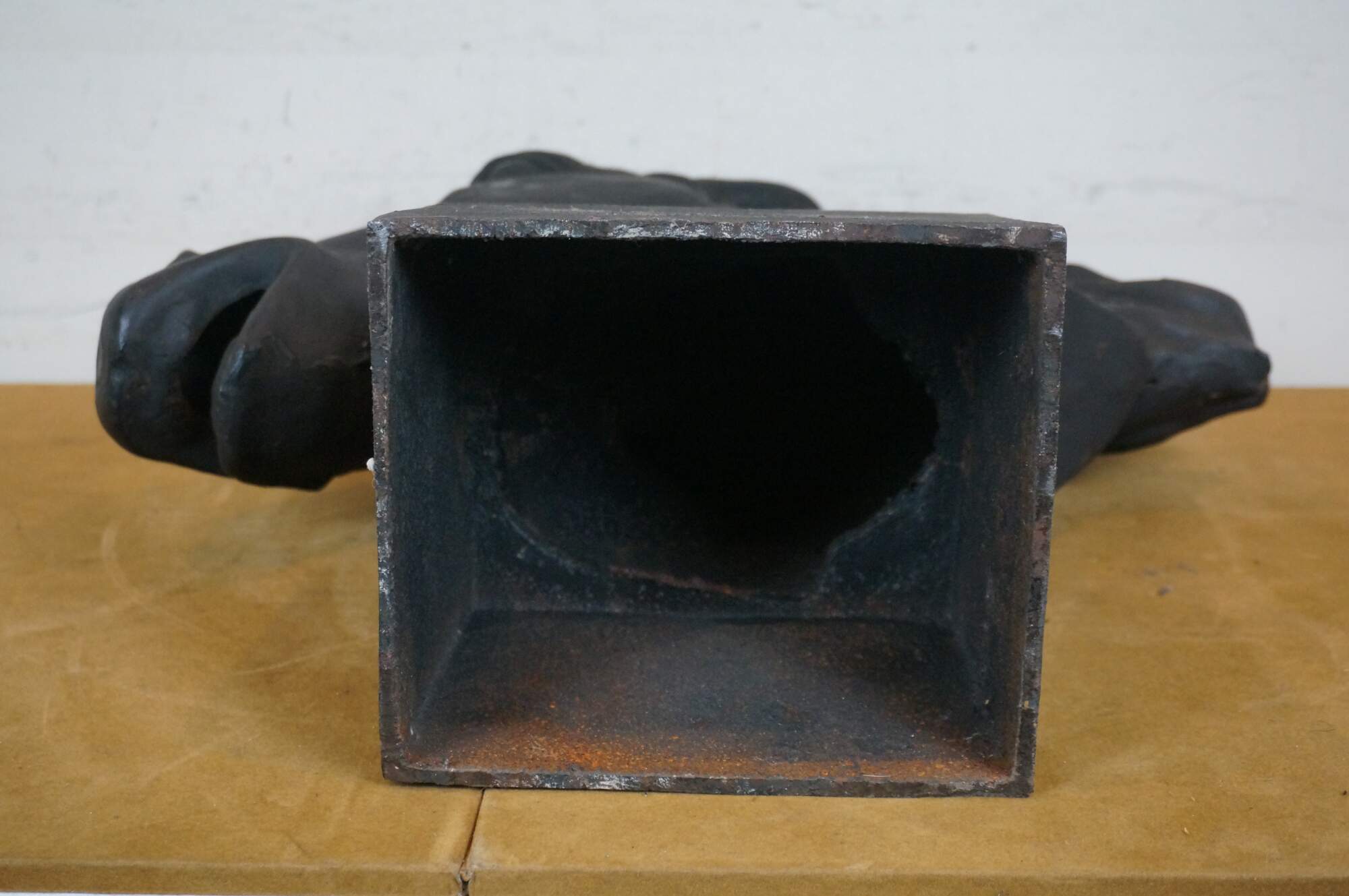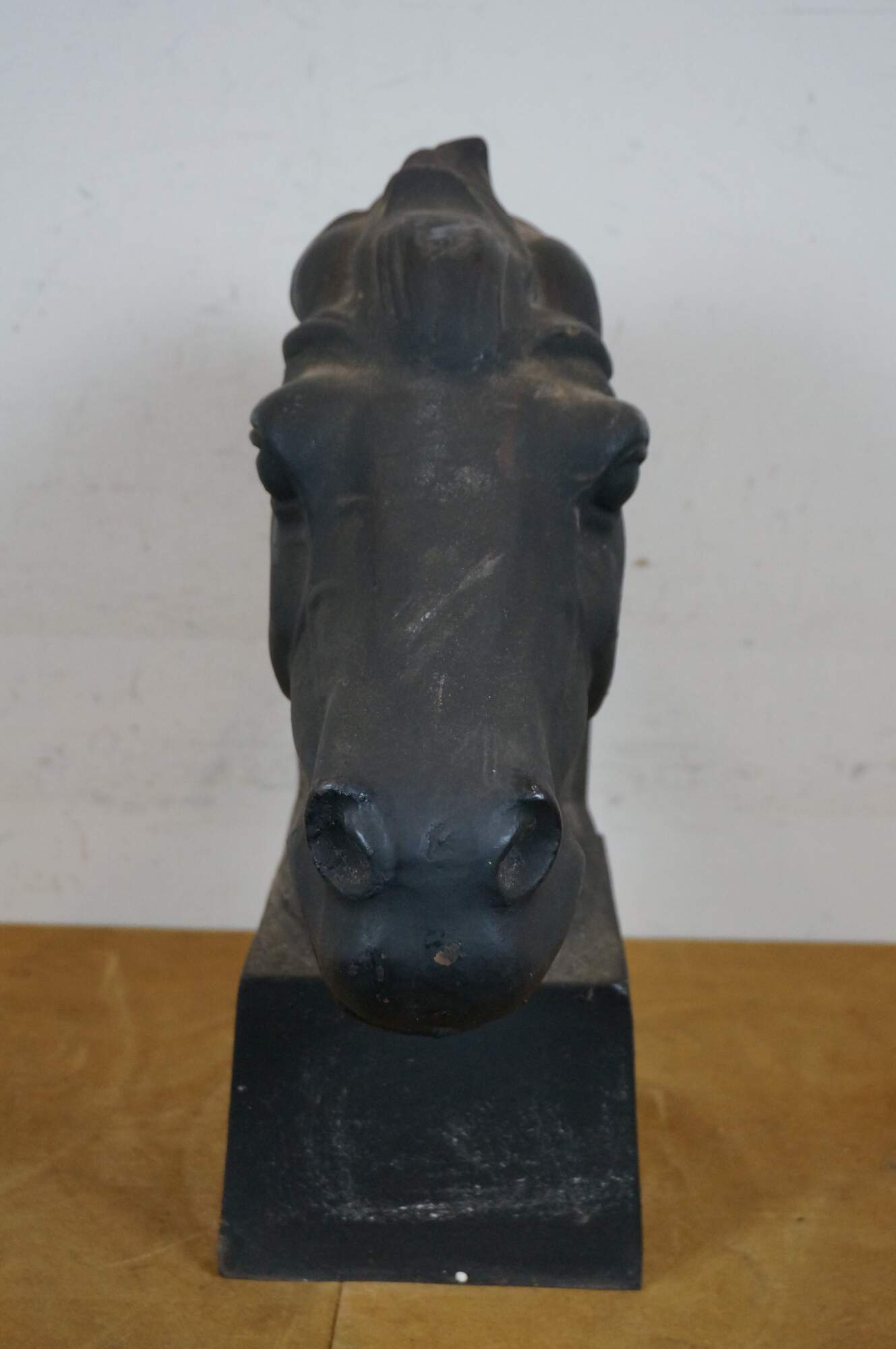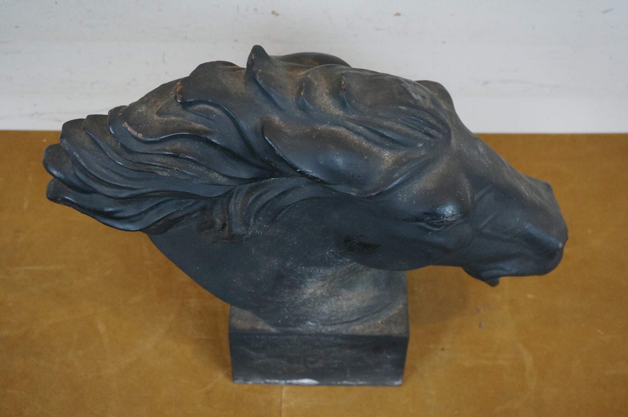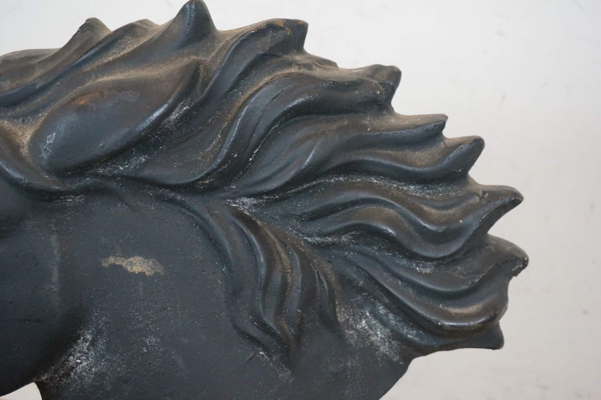 Vintage cast iron garden sculpture depicting the bust / head of a galloping horse / bronco / mustang, mane blowing in the wind, mounted on a square base, painted with a matte black finish.