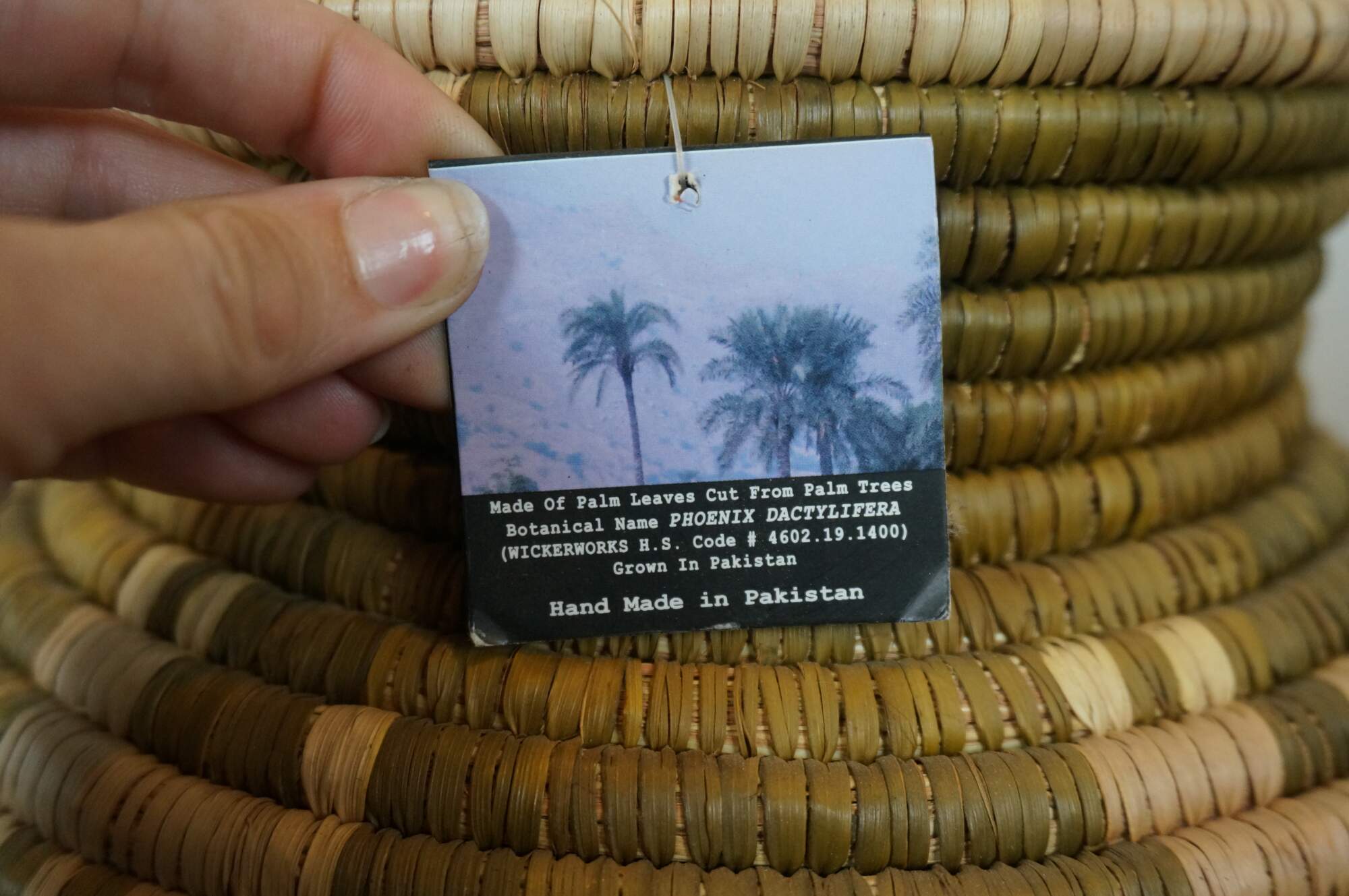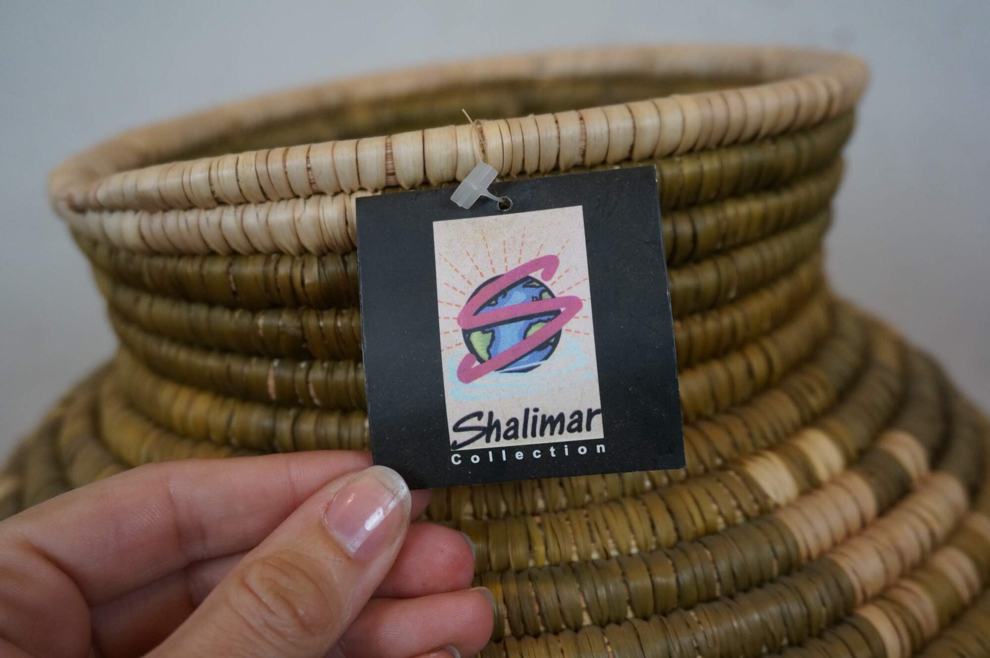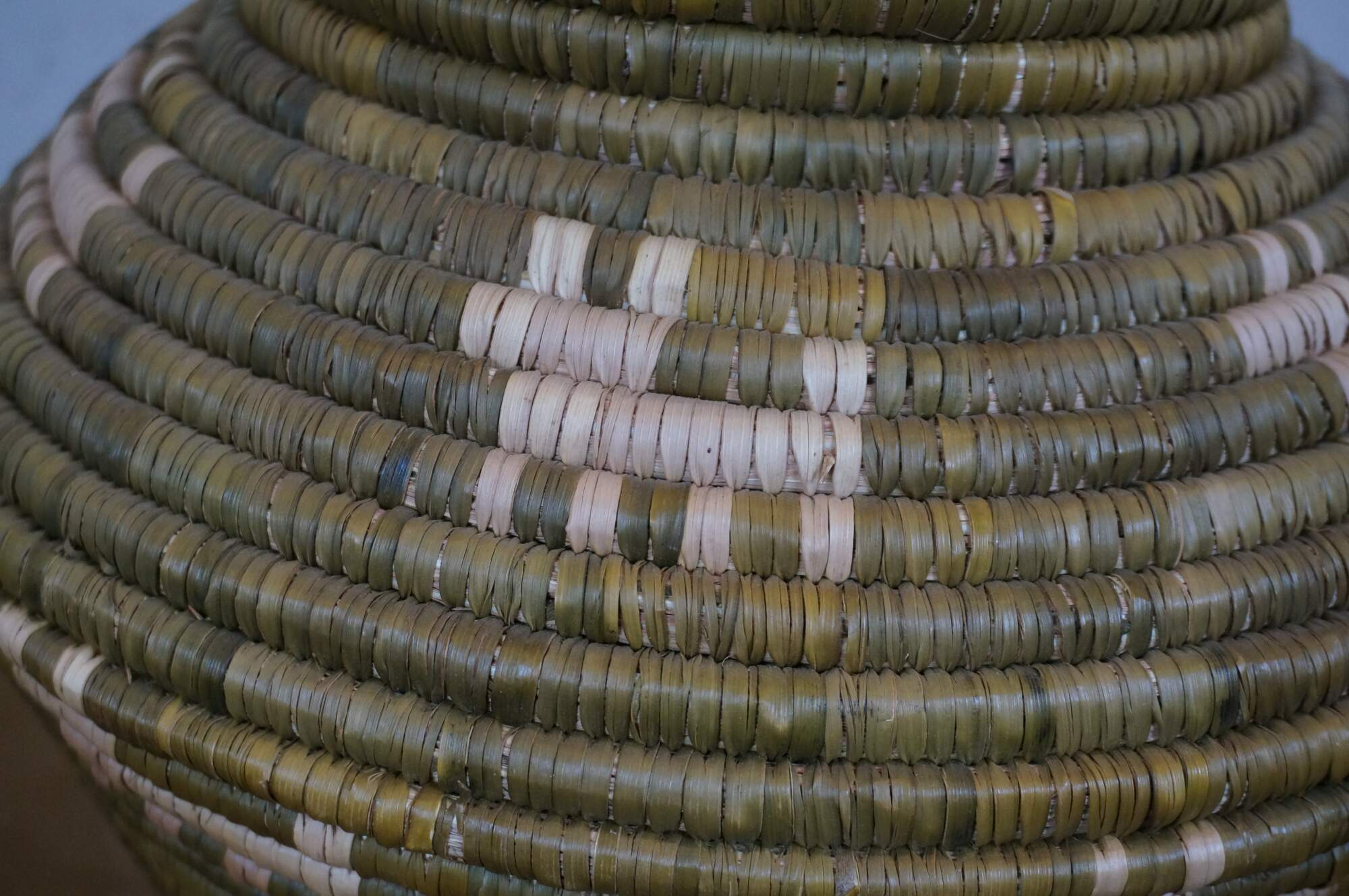 Late 20th century Shalimar Collection hand woven, coiled palm leaf basket vase. Olive green with light beige rim and a pattern of animals. Made in Pakistan.