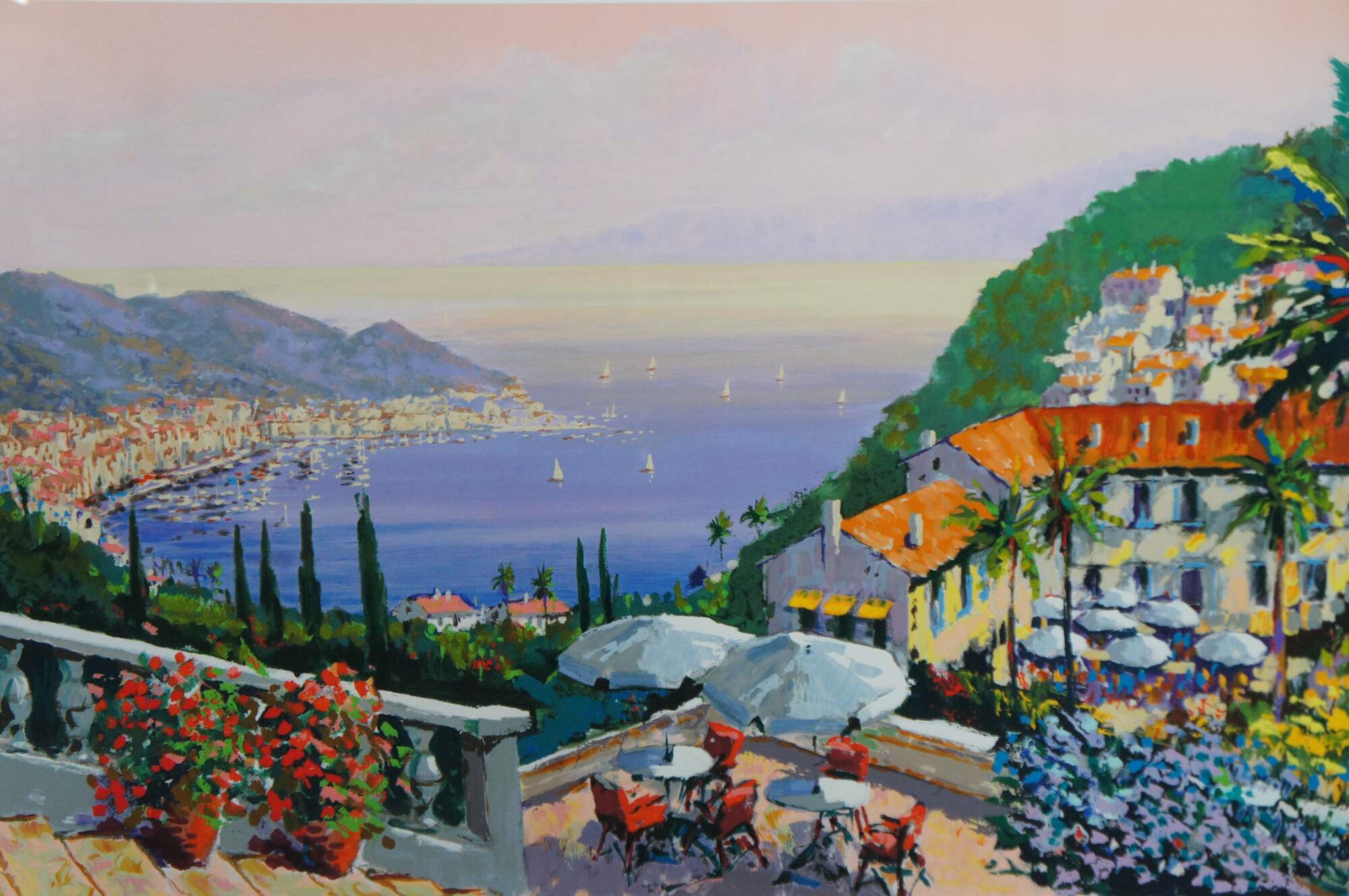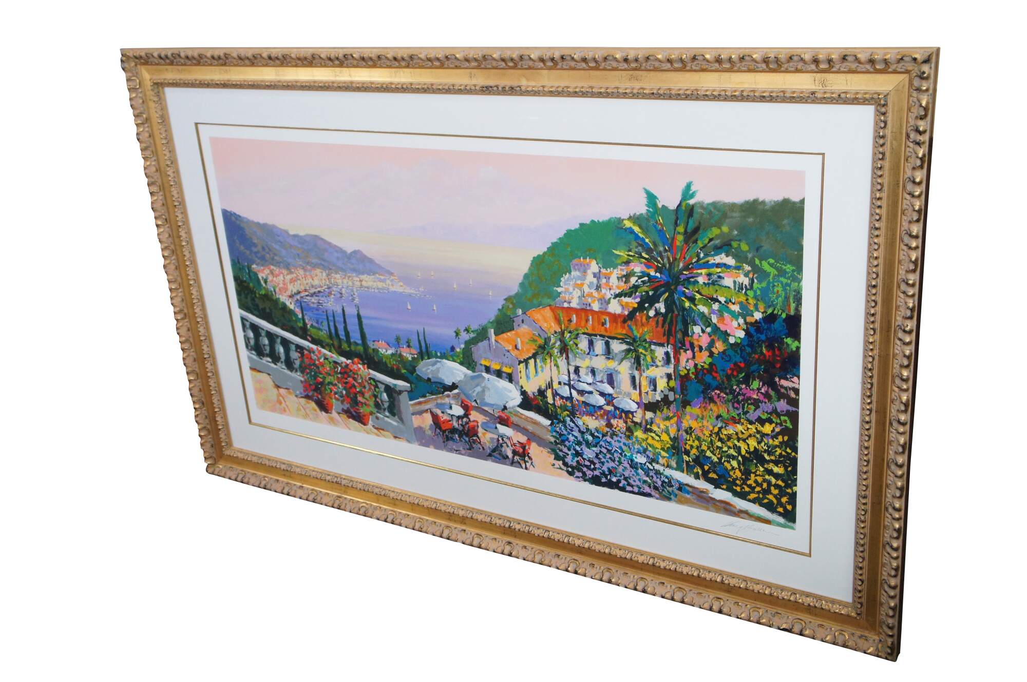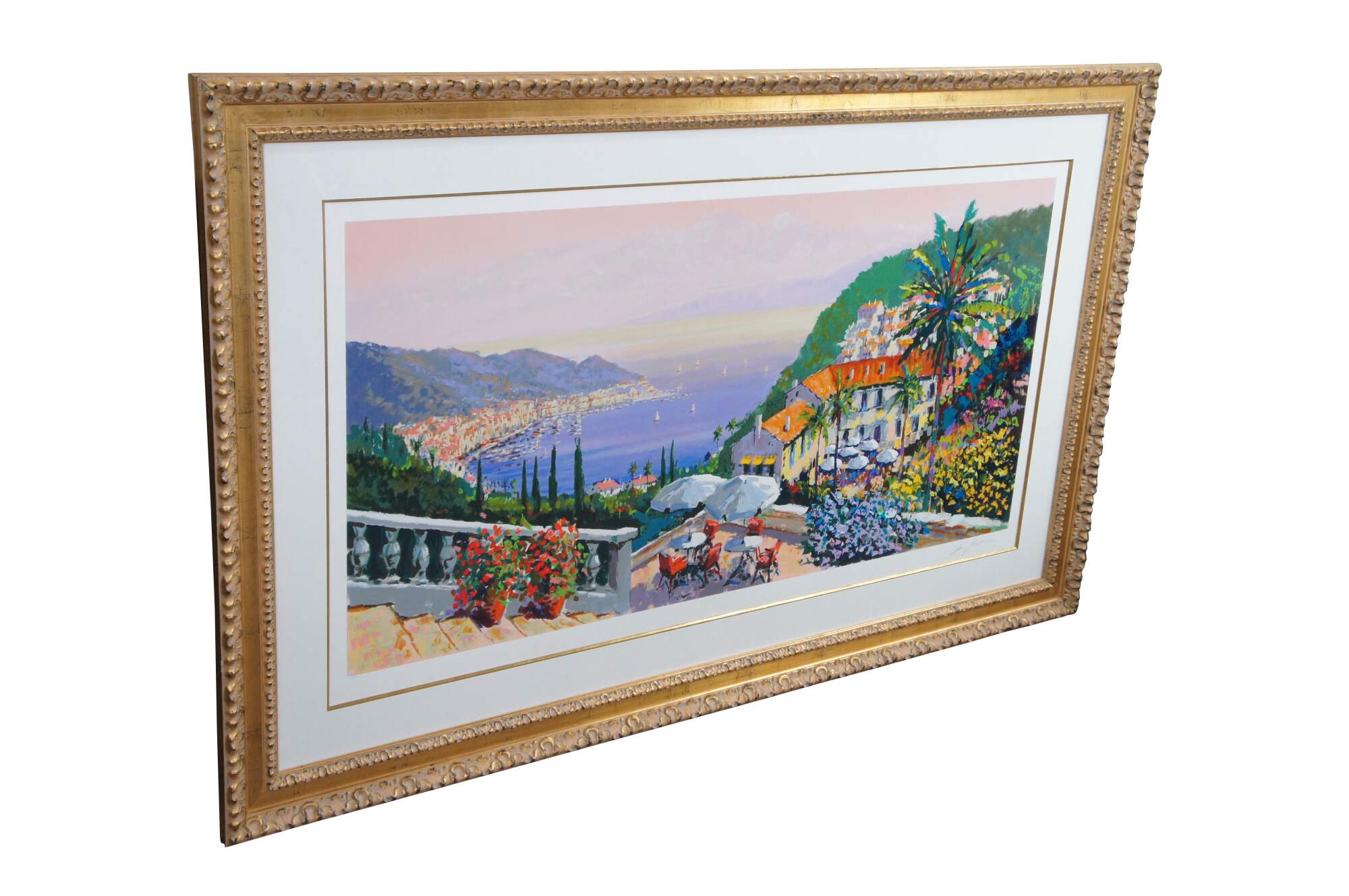 Very large coastal serigraph print by Kerry Hallam titled Crescent Bay. It depicts a mediterranean seascape / cityscape view of sailboats in the bay. Signed lower right, edition of 500, numbered CXXV/CL.