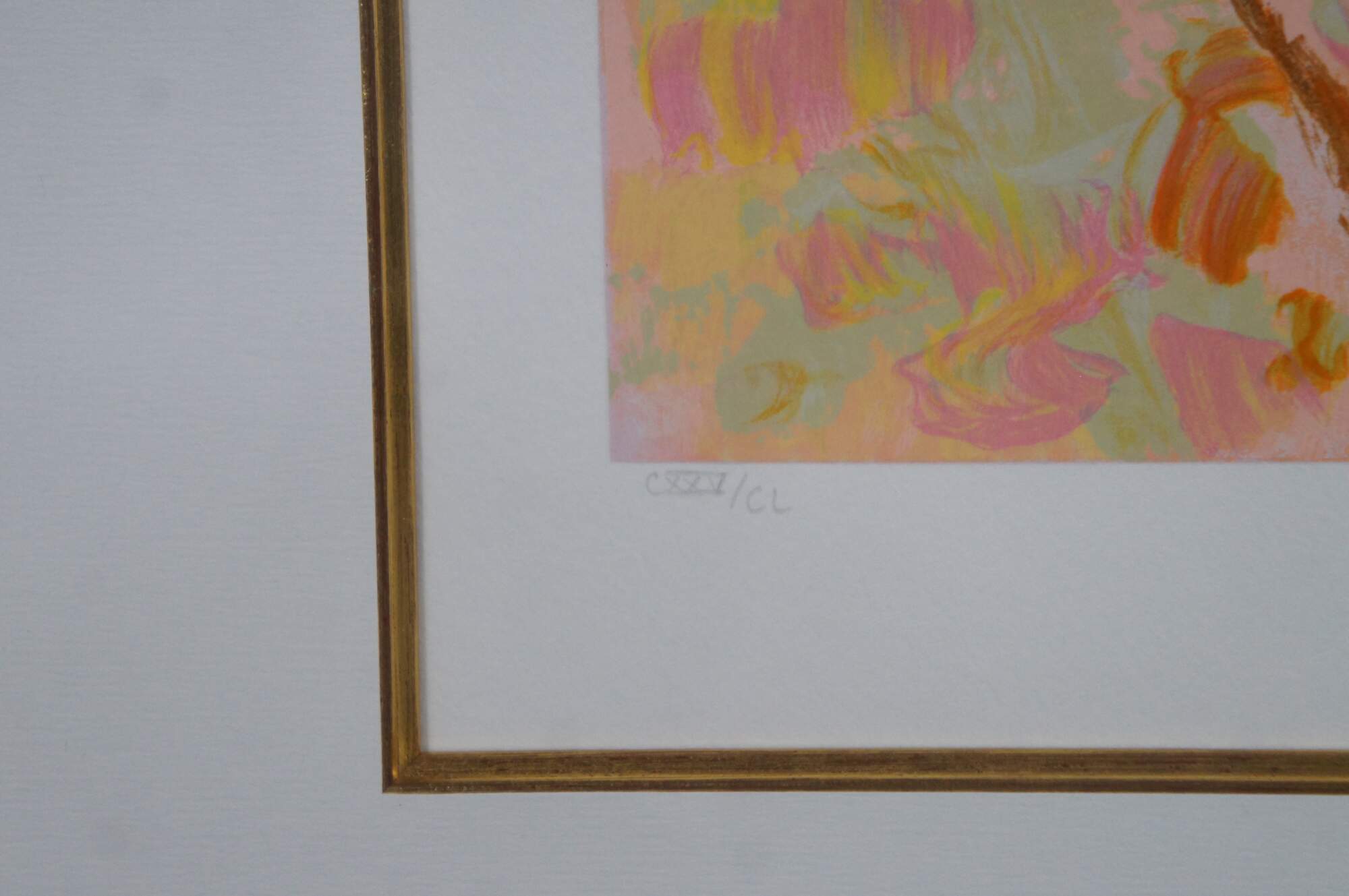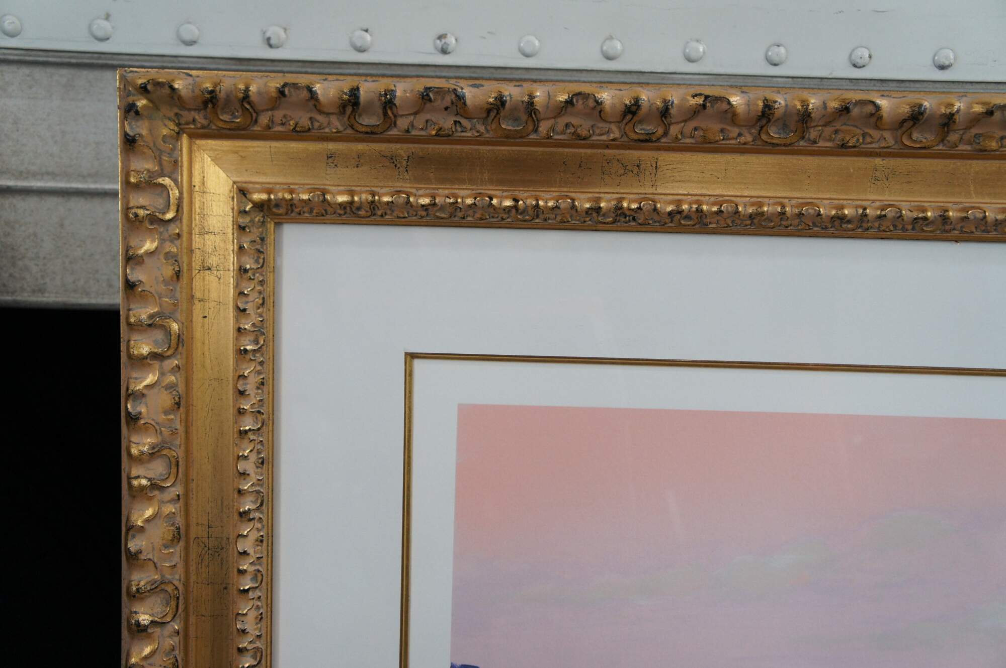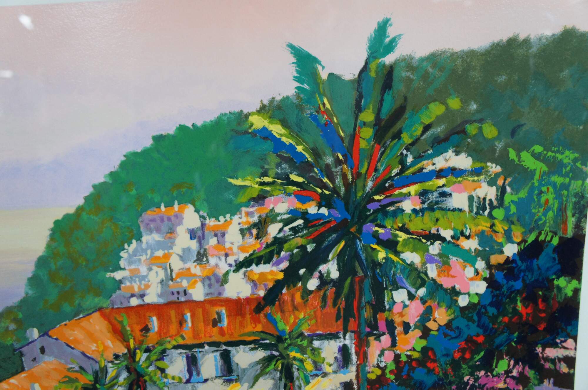 Very large coastal serigraph print by Kerry Hallam titled Crescent Bay. It depicts a mediterranean seascape / cityscape view of sailboats in the bay. Signed lower right, edition of 500, numbered CXXV/CL.