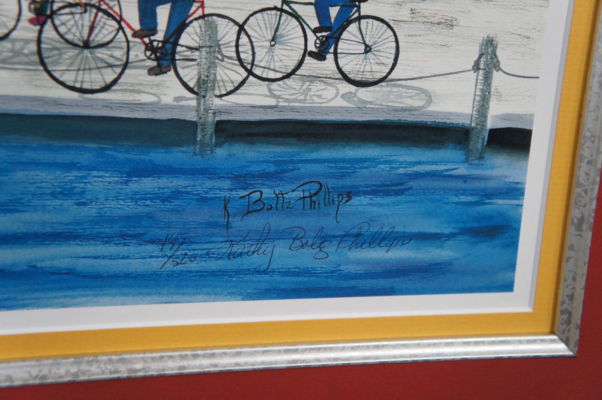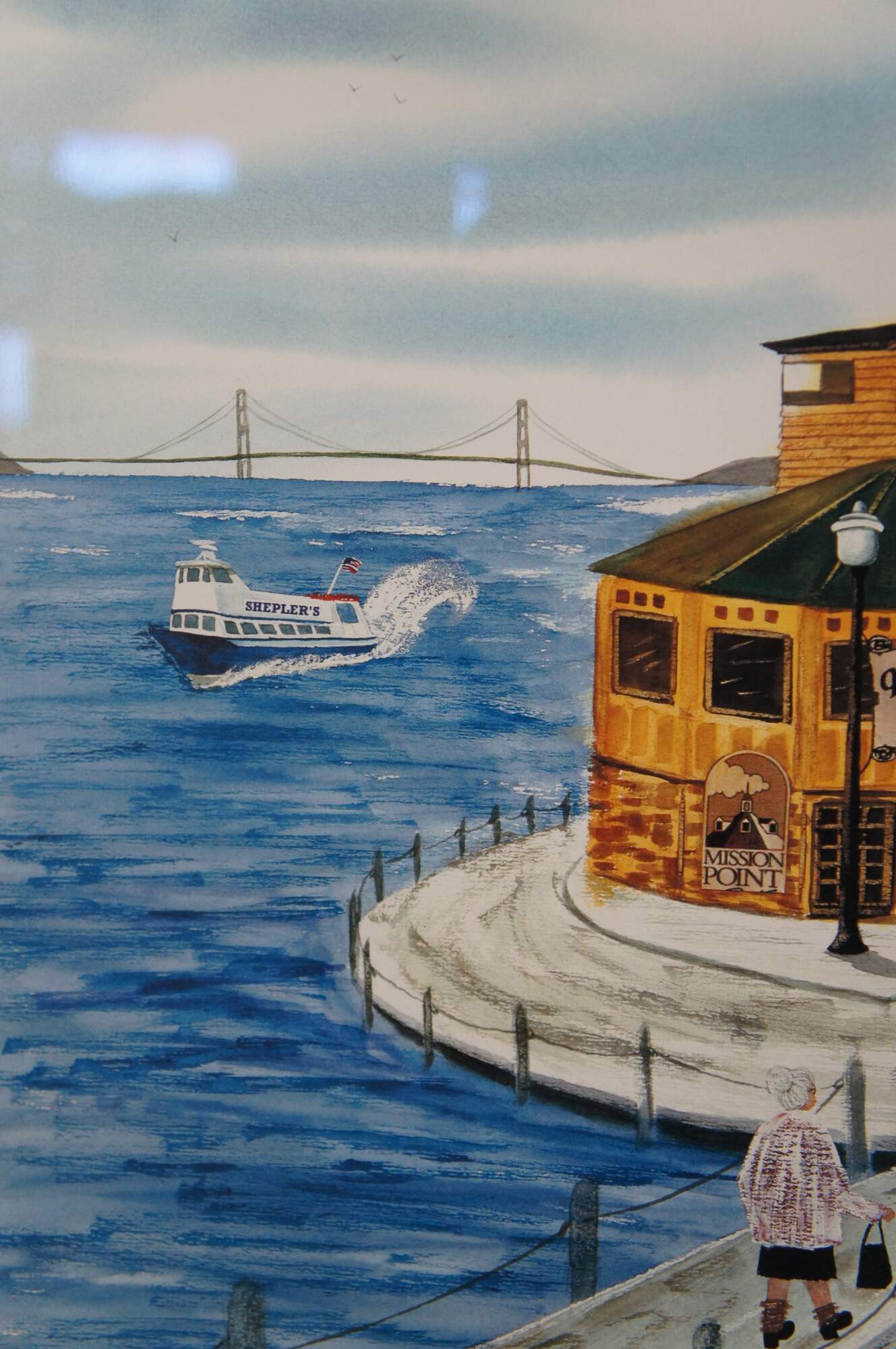 Vintage Kathy Boltz Phillips lithograph print titled Mackinac Island. It featurings a charming view of the famous car free Michigan town off Lake Huron known for its Victorian architecture, fudge and historic landmarks. Signed in stone and by hand lower right, edition 19 of 500.