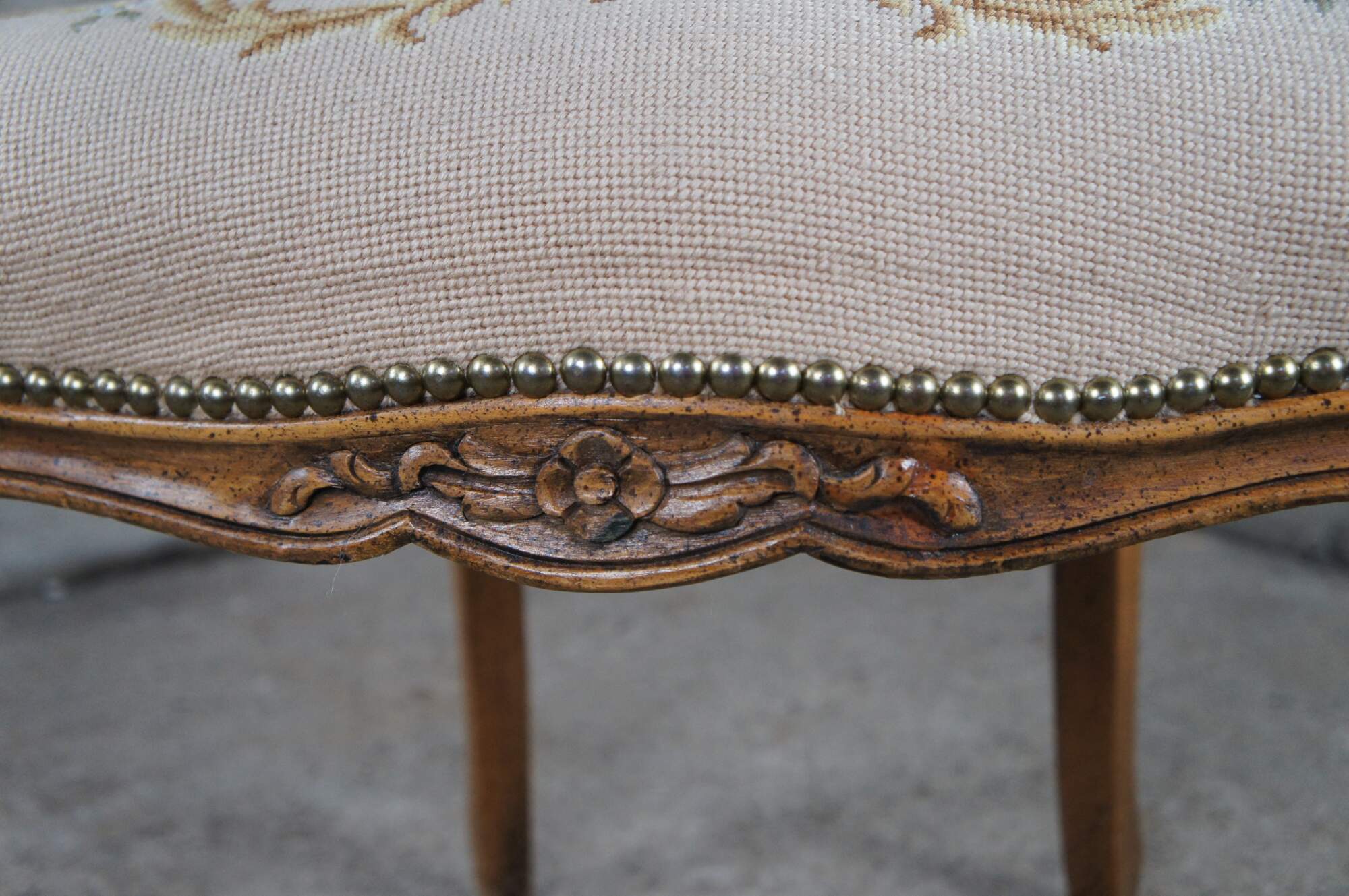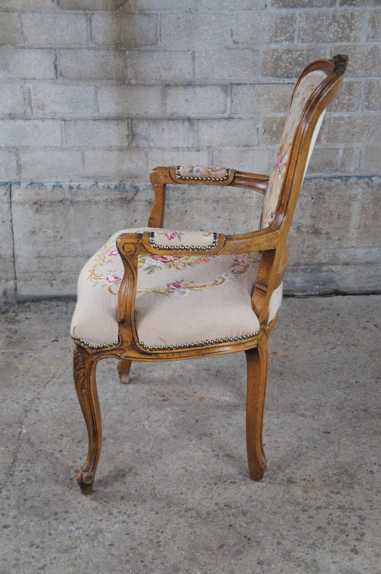 Vintage French Provincial Louis XV style dining armchair featuring a distressed walnut finish with serpentine, floral and acanthus design, embroidered needlepoint upholstery, and nailhead trim.