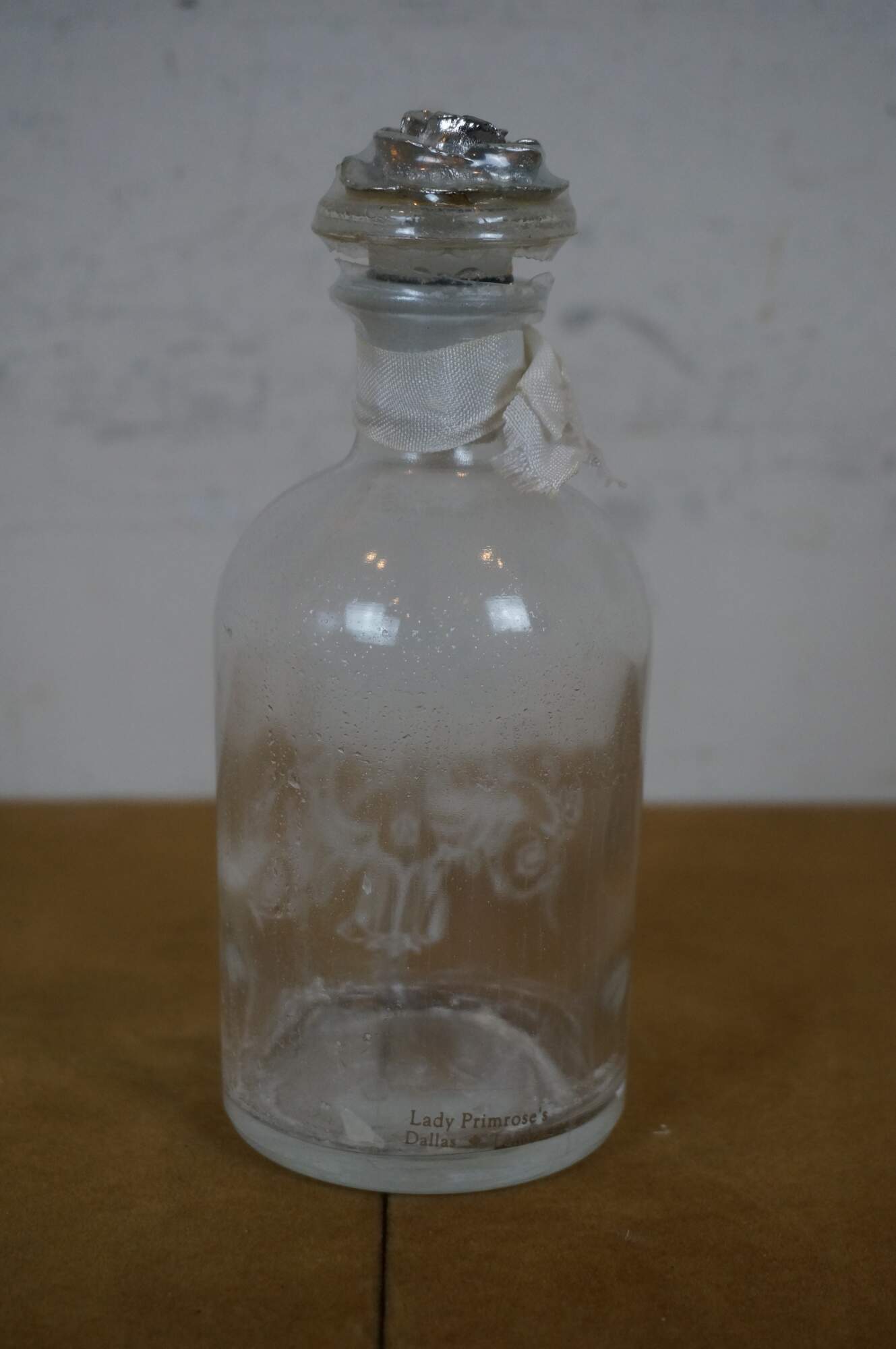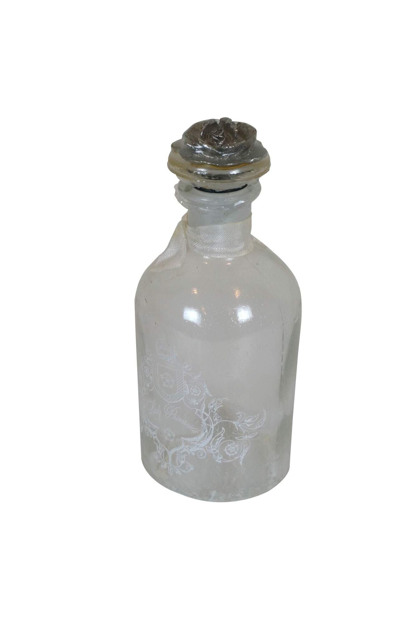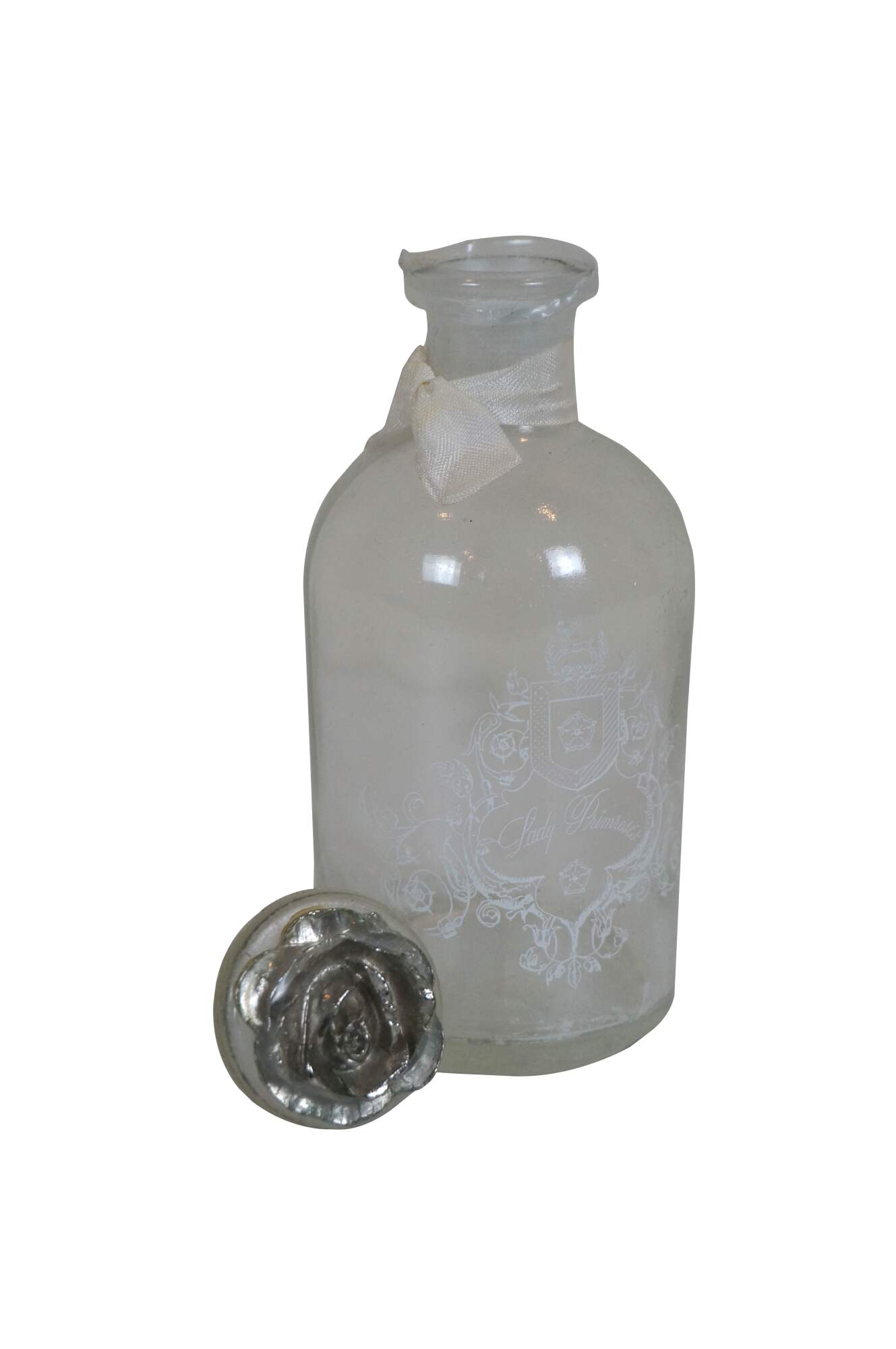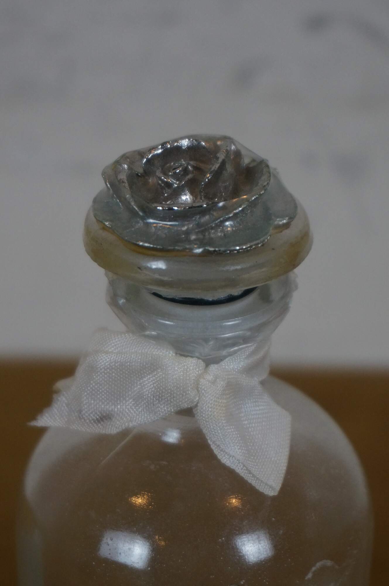 Vintage late 20th century Lady Primrose's clear glass vanity / perfume bottle / decanter with silver tone rose stopper.