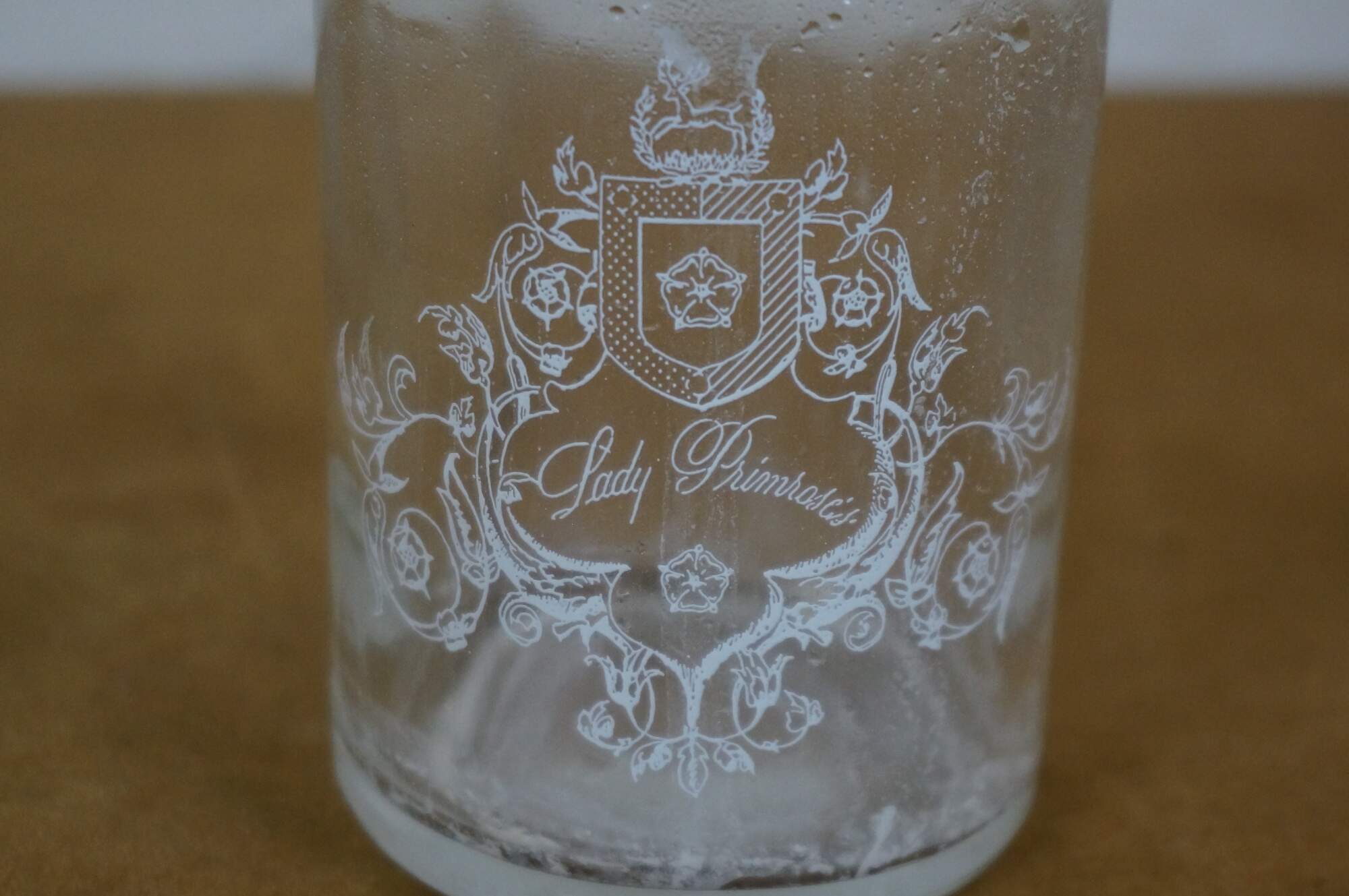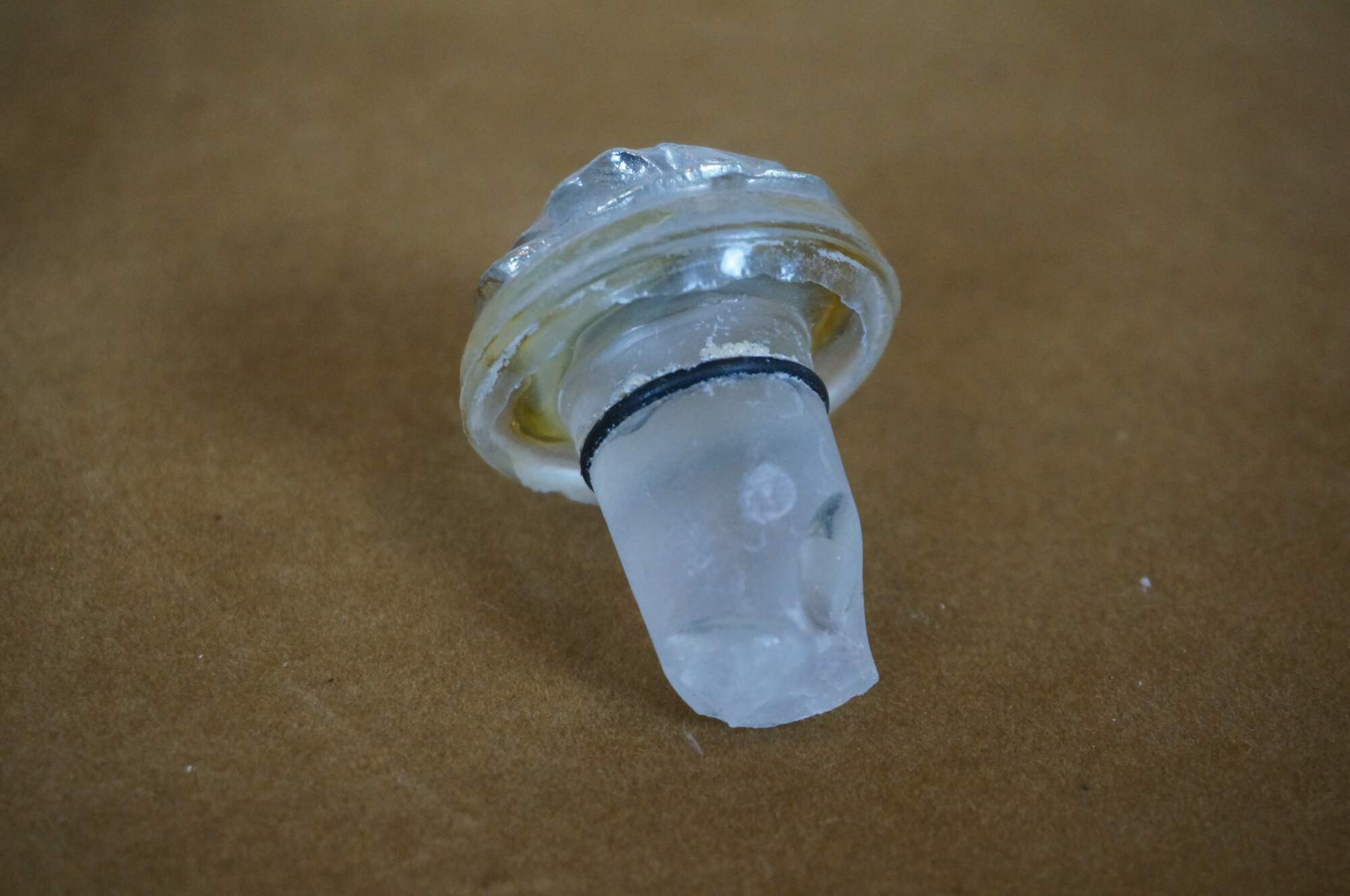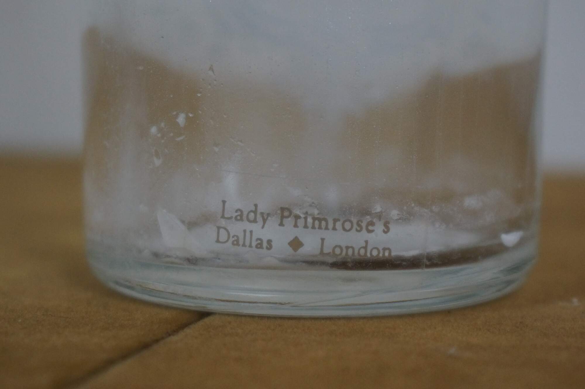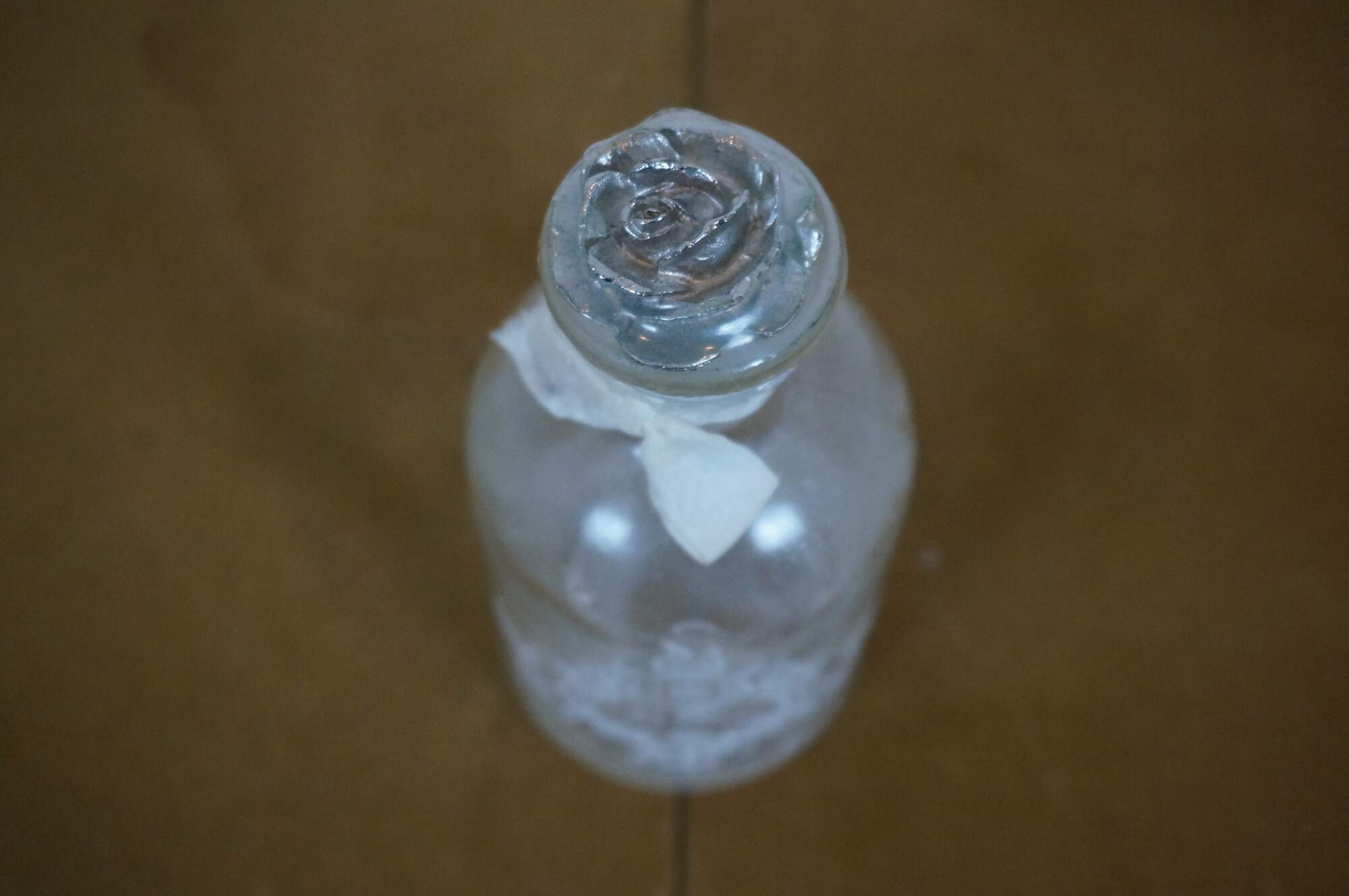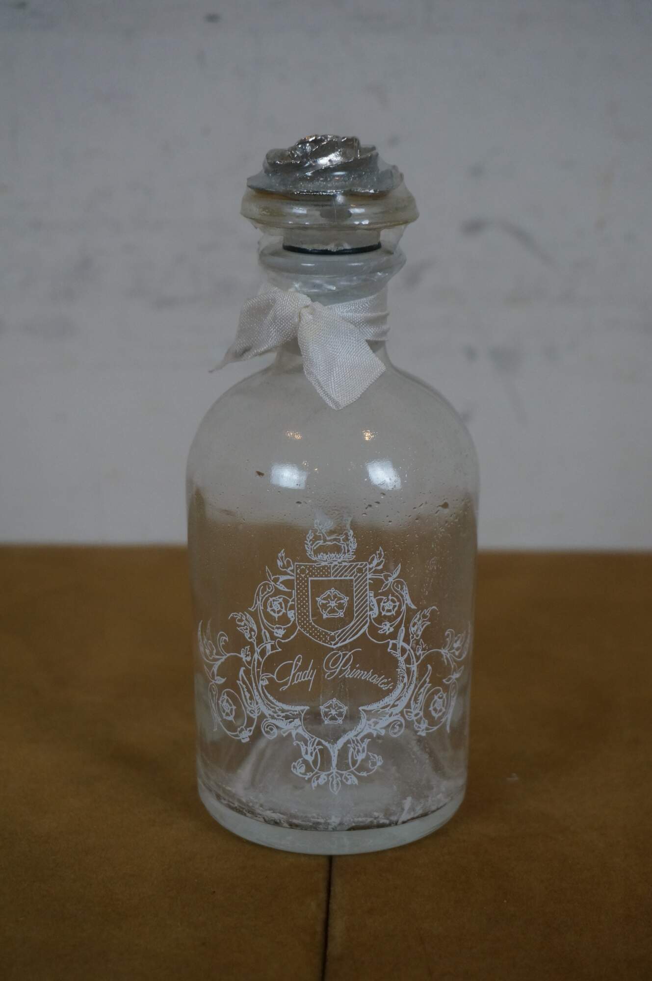 Vintage late 20th century Lady Primrose's clear glass vanity / perfume bottle / decanter with silver tone rose stopper.