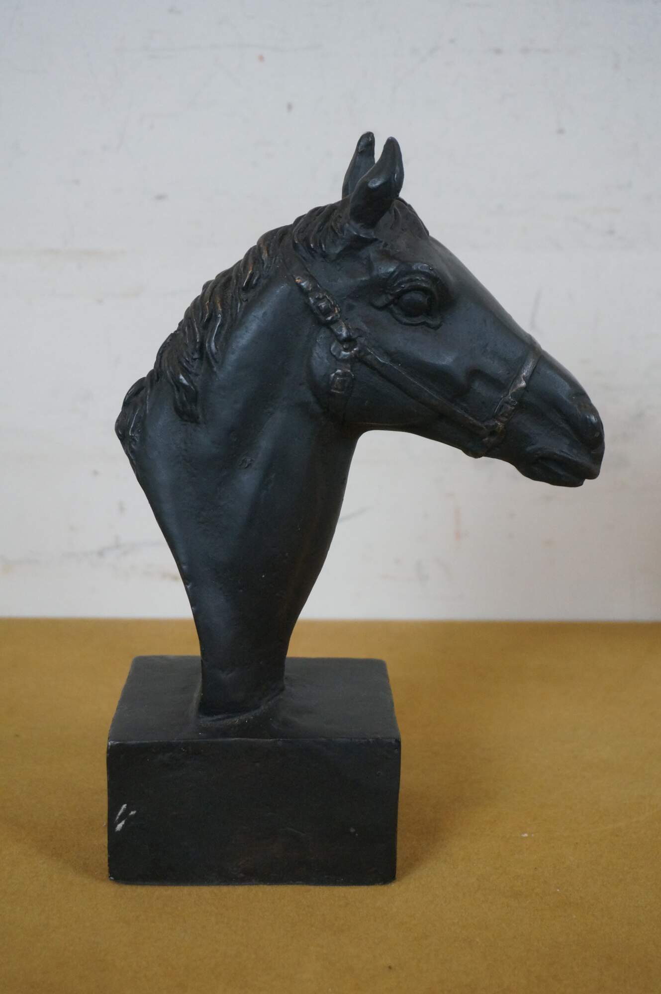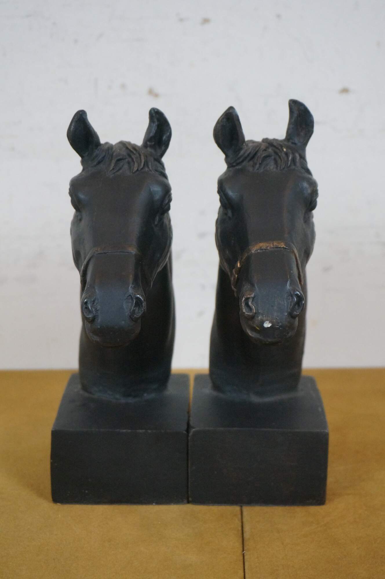 Pair of late 20th century black cast iron bookends in the shape of horse heads on square bases, with lightly gilded bridles.