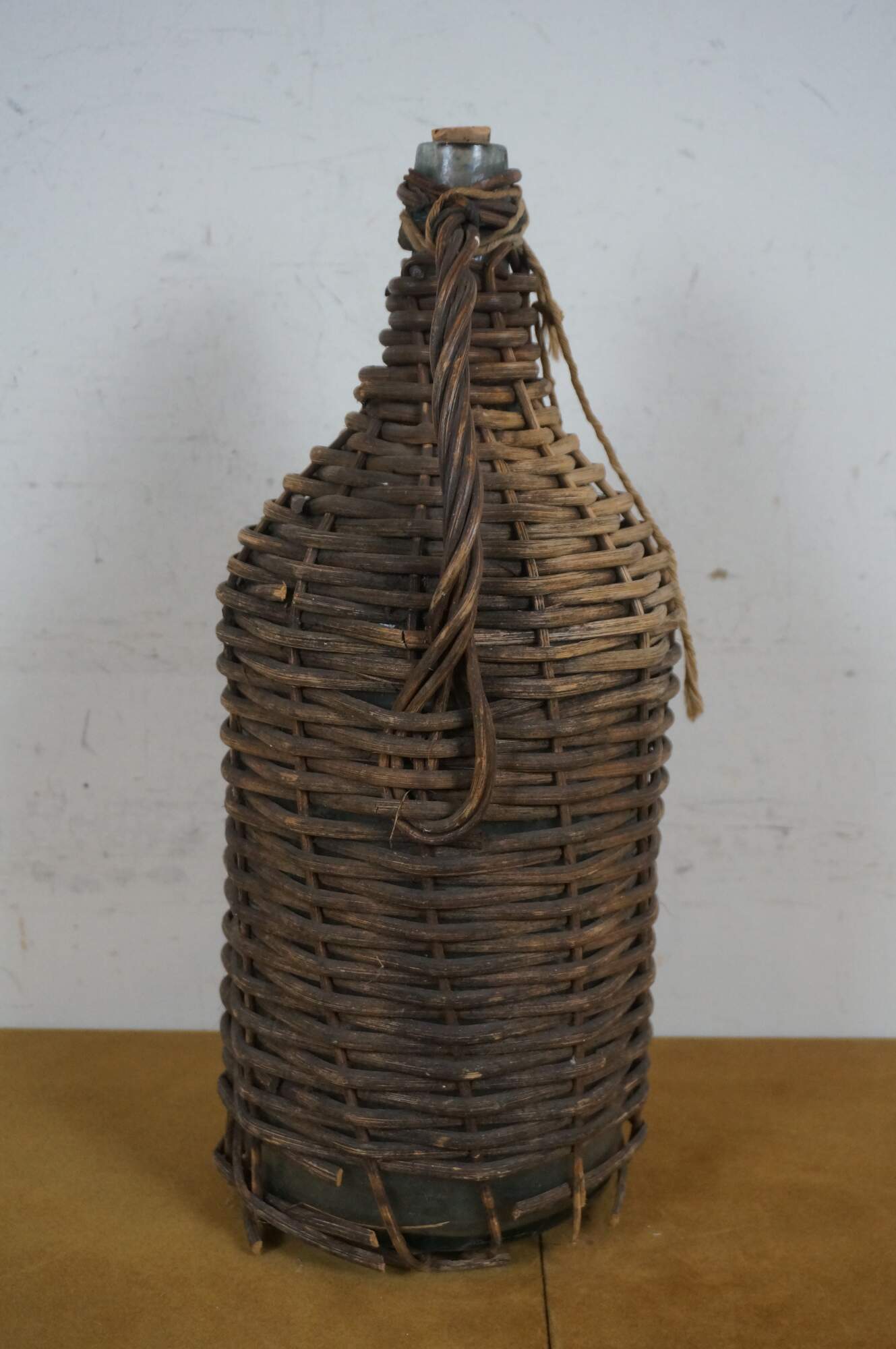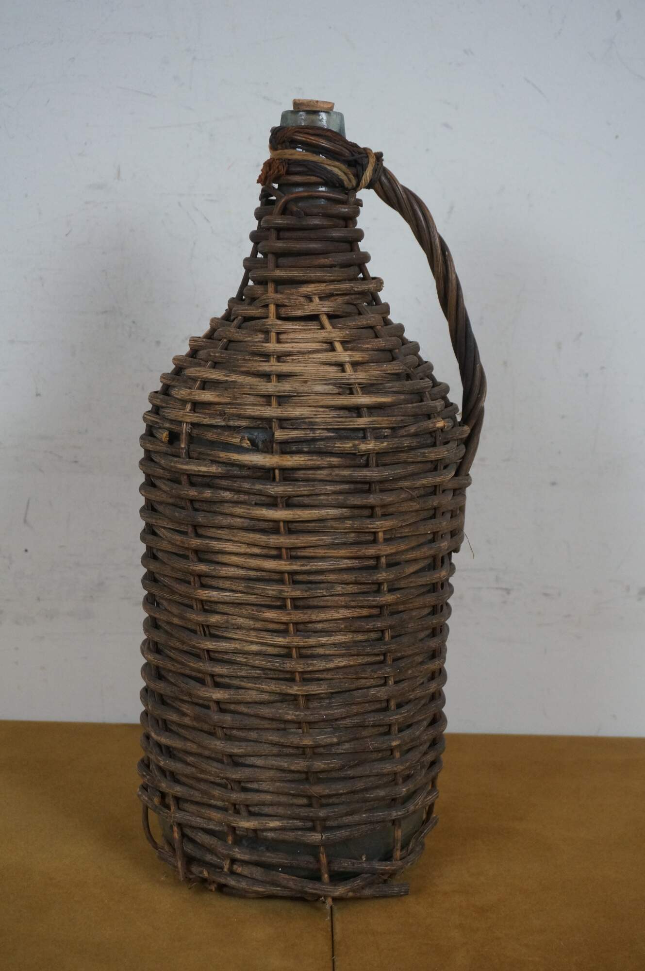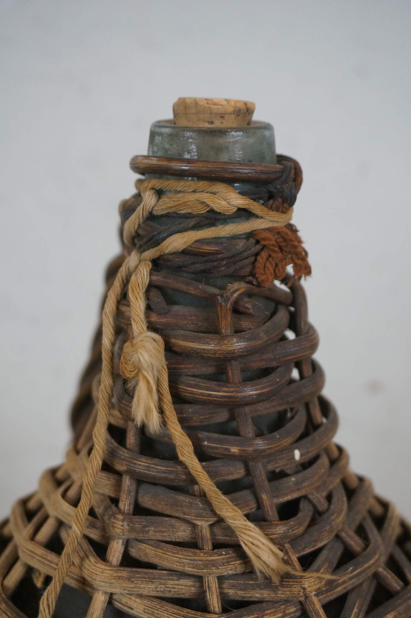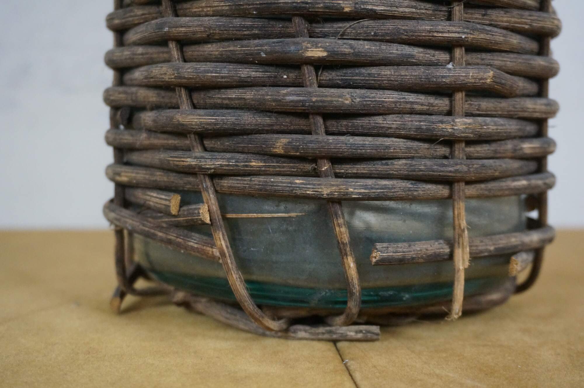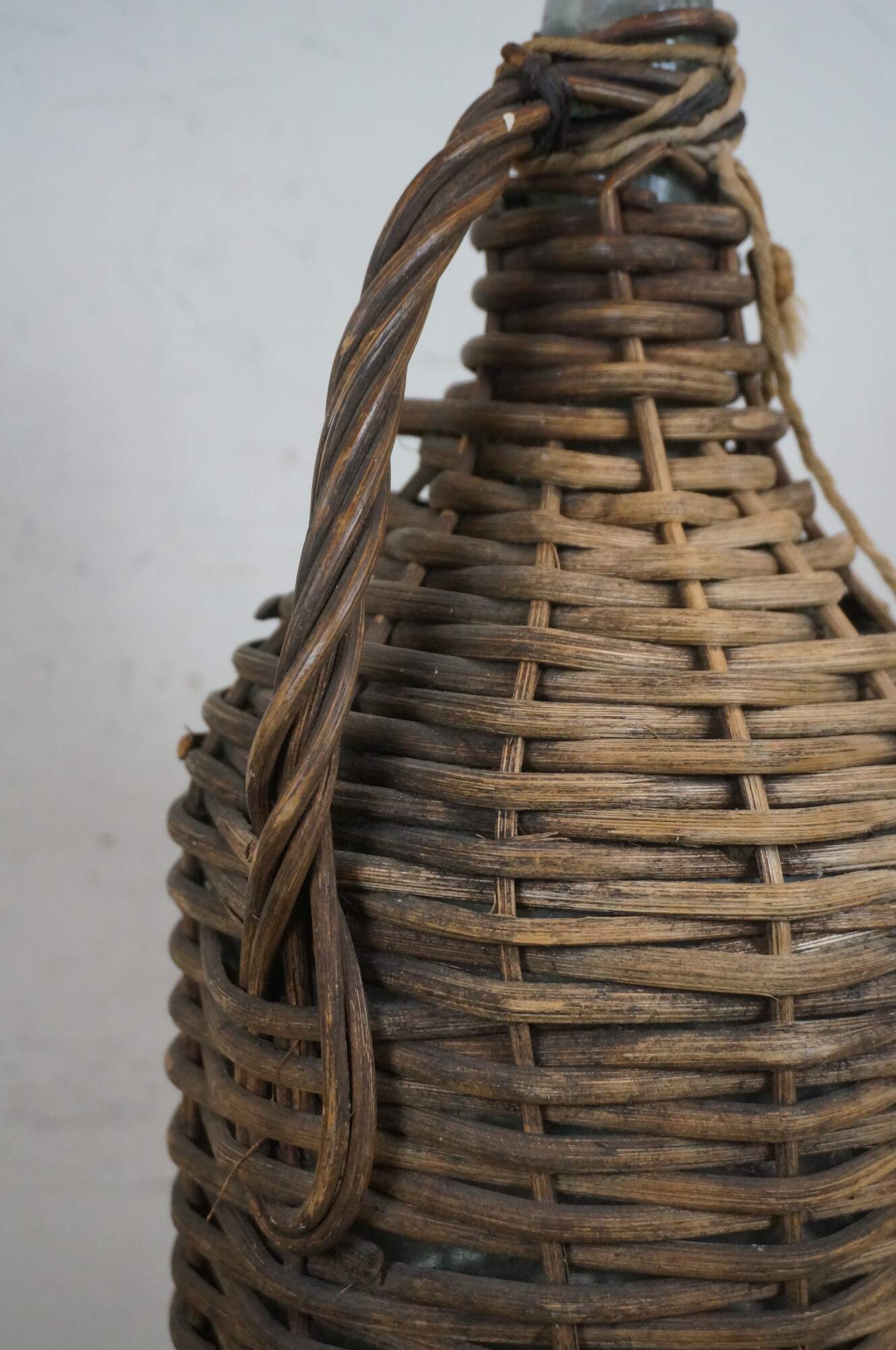 Early 20th century green glass demijohn wine bottle, wrapped in woven wicker with a braided handle.