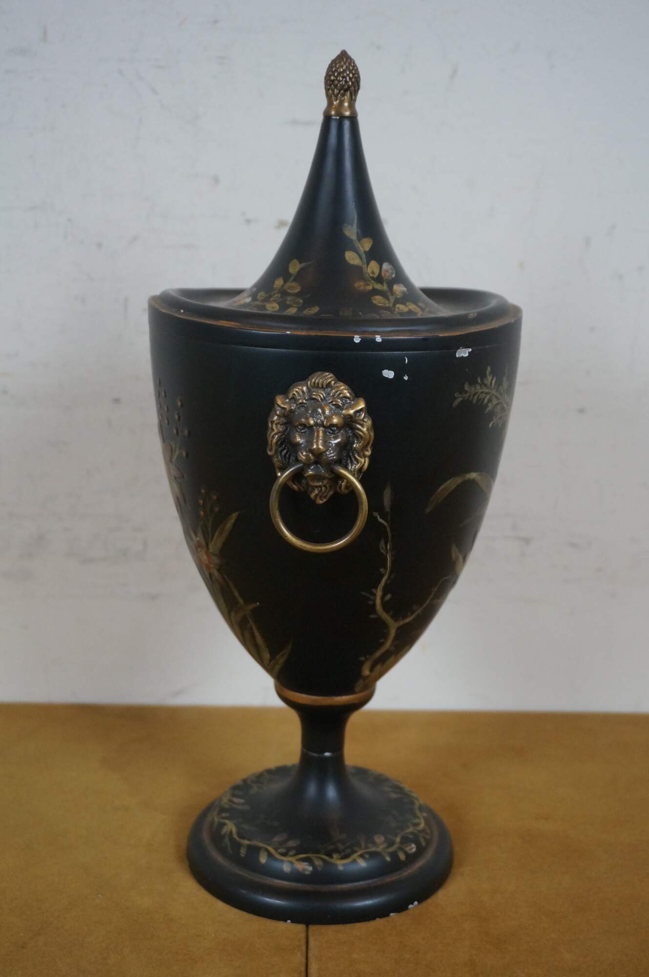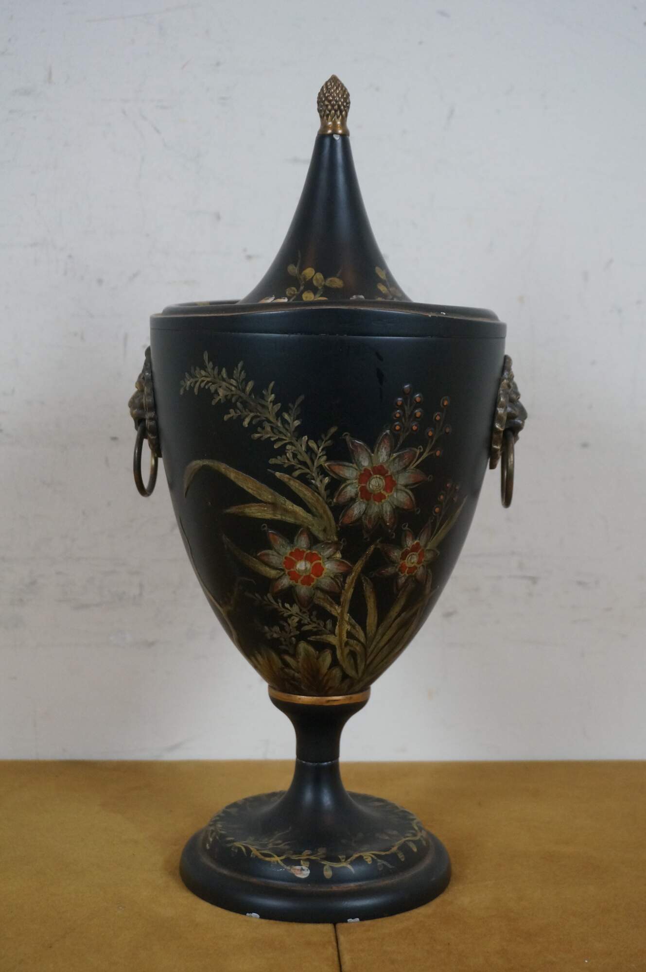 Late 20th century black painted tole ware chestnut mantel urn, painted with foliate and floral designs in gold, white and red. Two lion's head handles, pineapple finial.