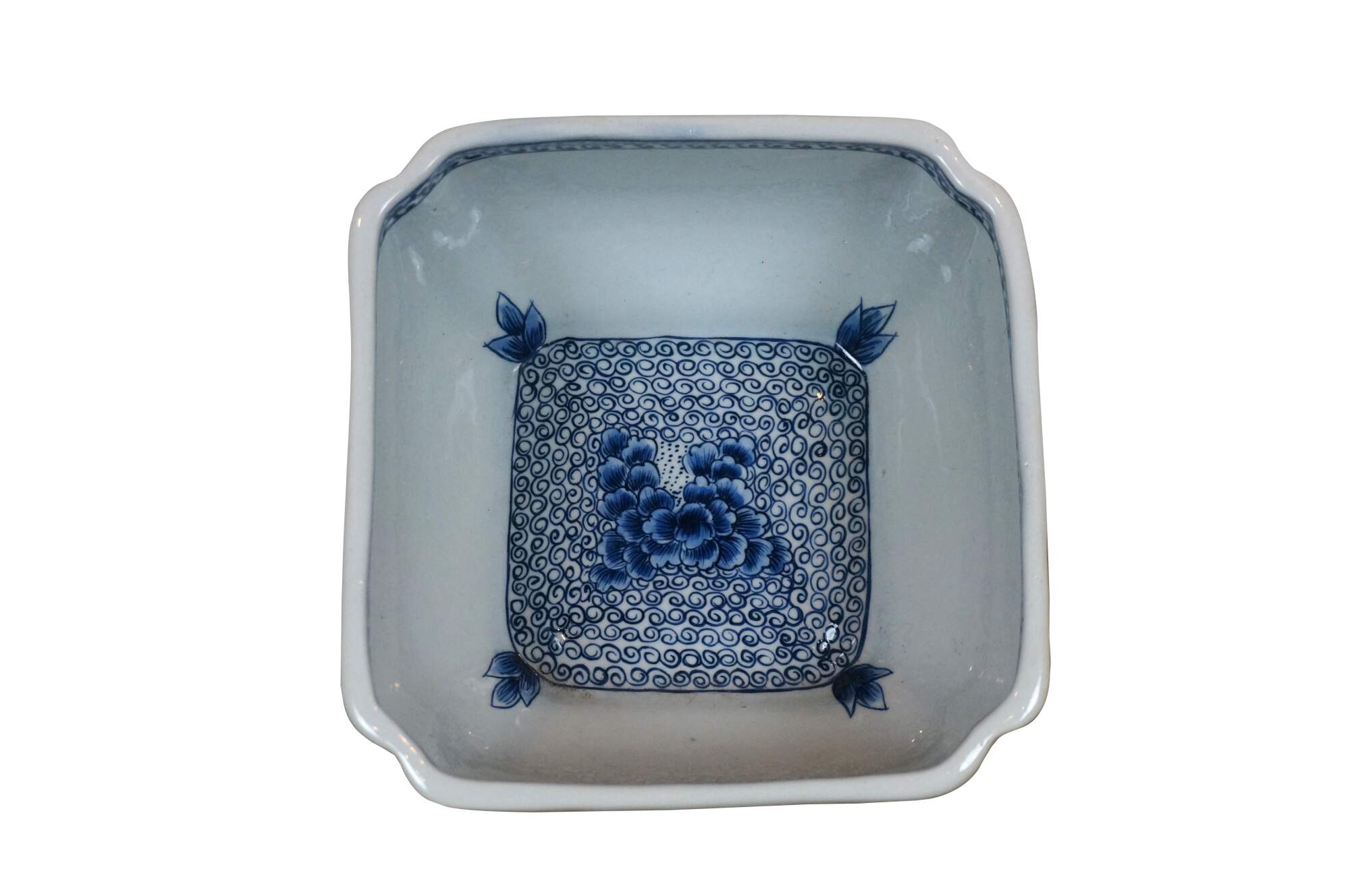 Late 20th century blue and white Chinese porcelain planter / jardiniere. Square form with pinched corners, decorated inside and out with floral / foliate designs on a swirling background.