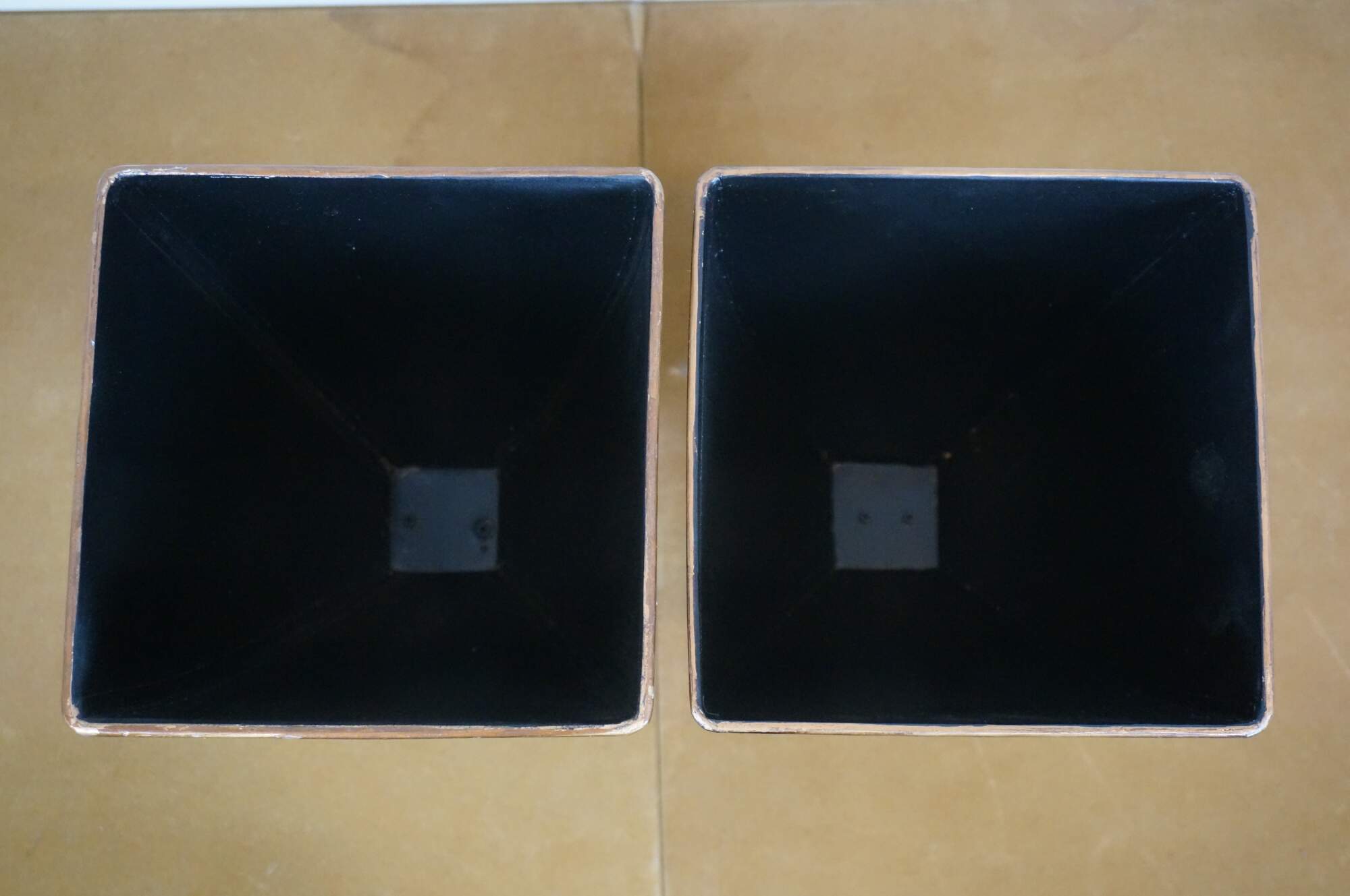 Pair of late 20th century painted tole ware metal lidded chestnut trophy mantel urns. Squared off trophy urn shape with lids sloping up to foliate finials. Painted with gilt Neoclassical Chinoiserie scenes of children at play in a garden, framed with floral bouquets and ribbons.