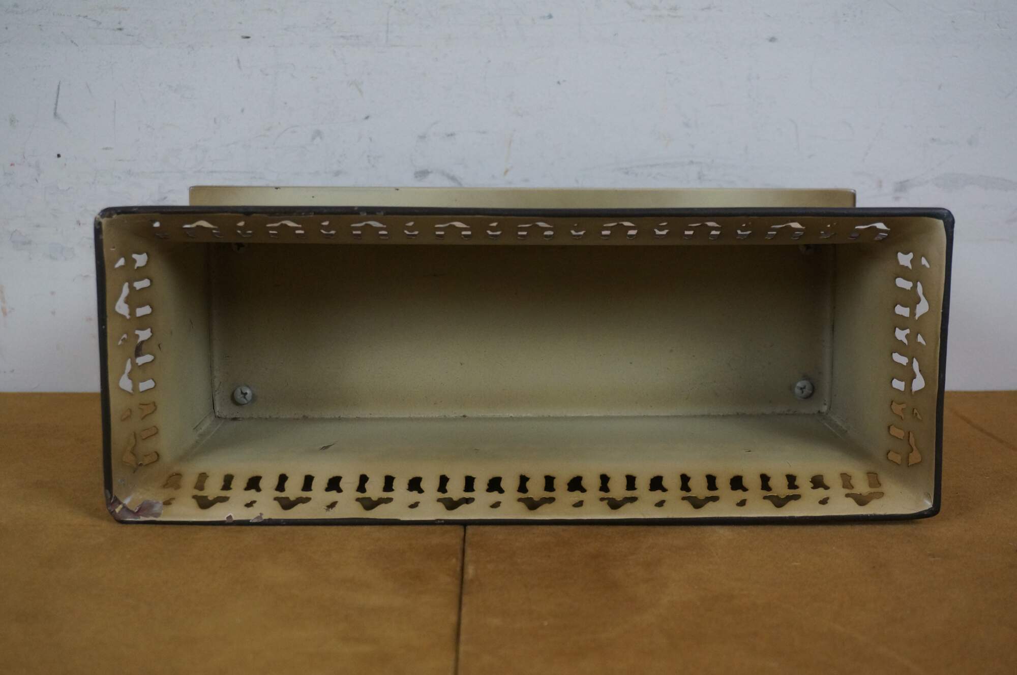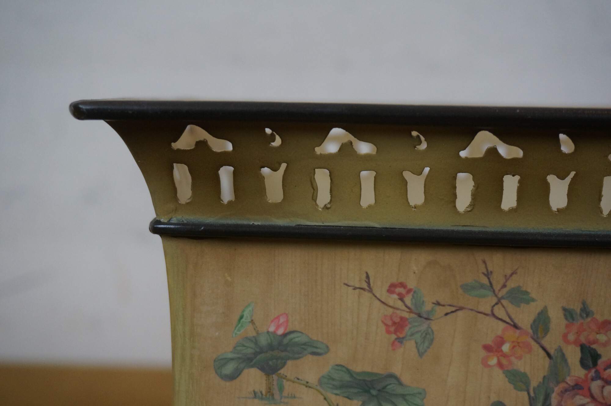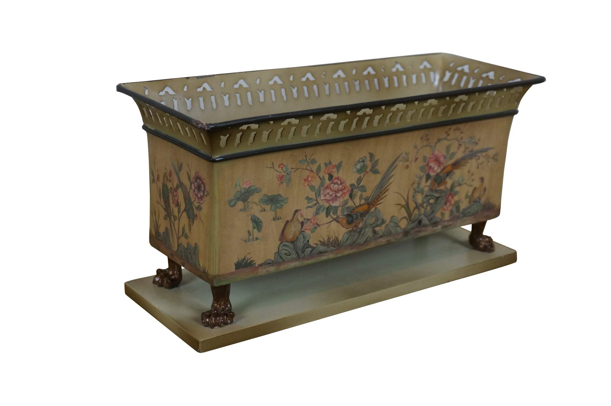 Late 20th century painted tole ware planter / jardiniere. Rectangular form with pierced/ reticulated/ flared rim, sides hand painted with a scene of pheasants / grouse on flowering bushes, supported on four claw / paw feet and a rectangular base.