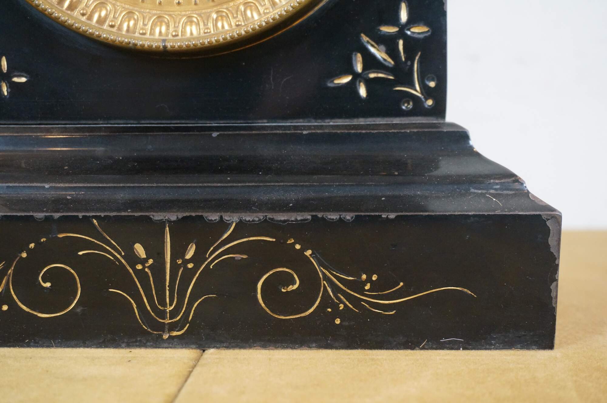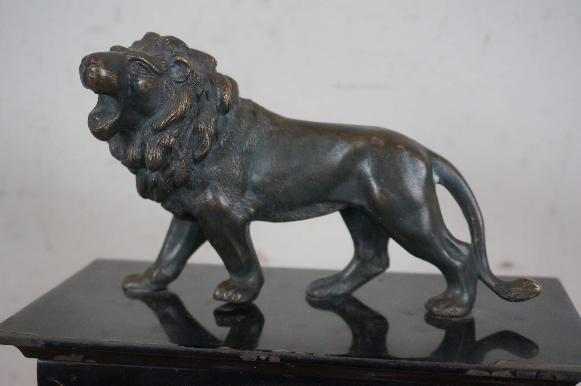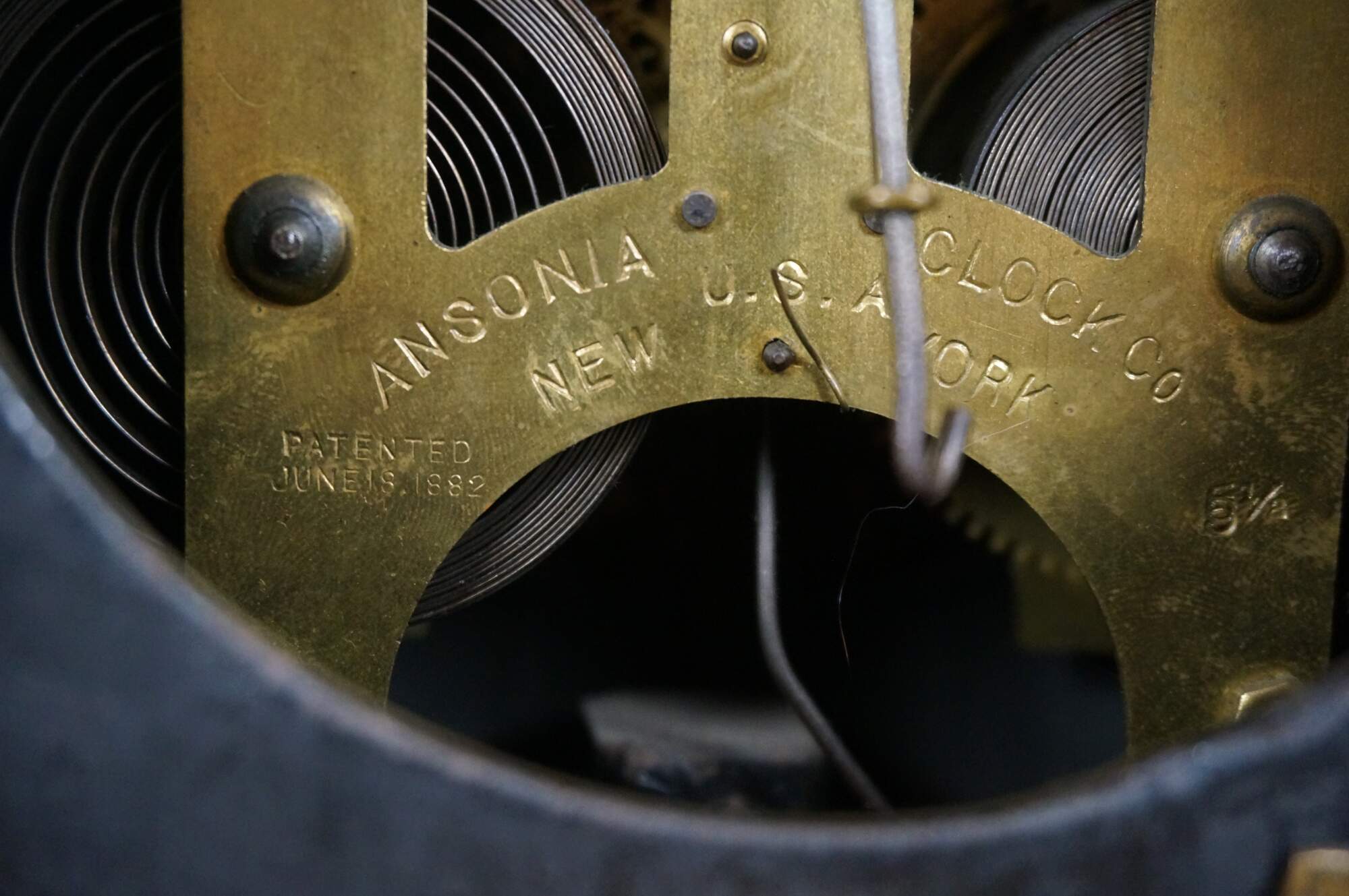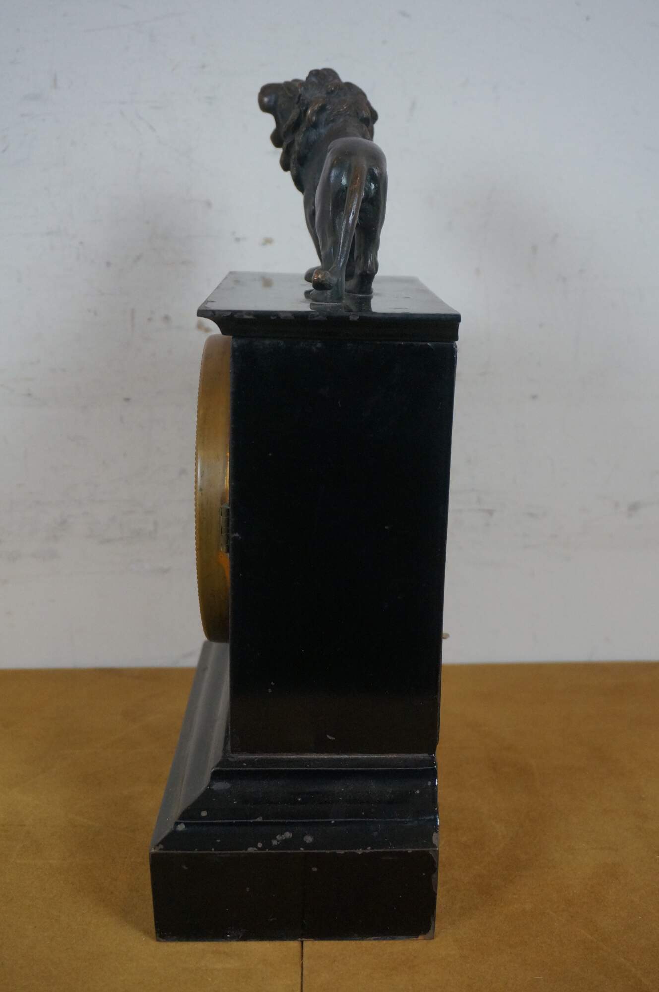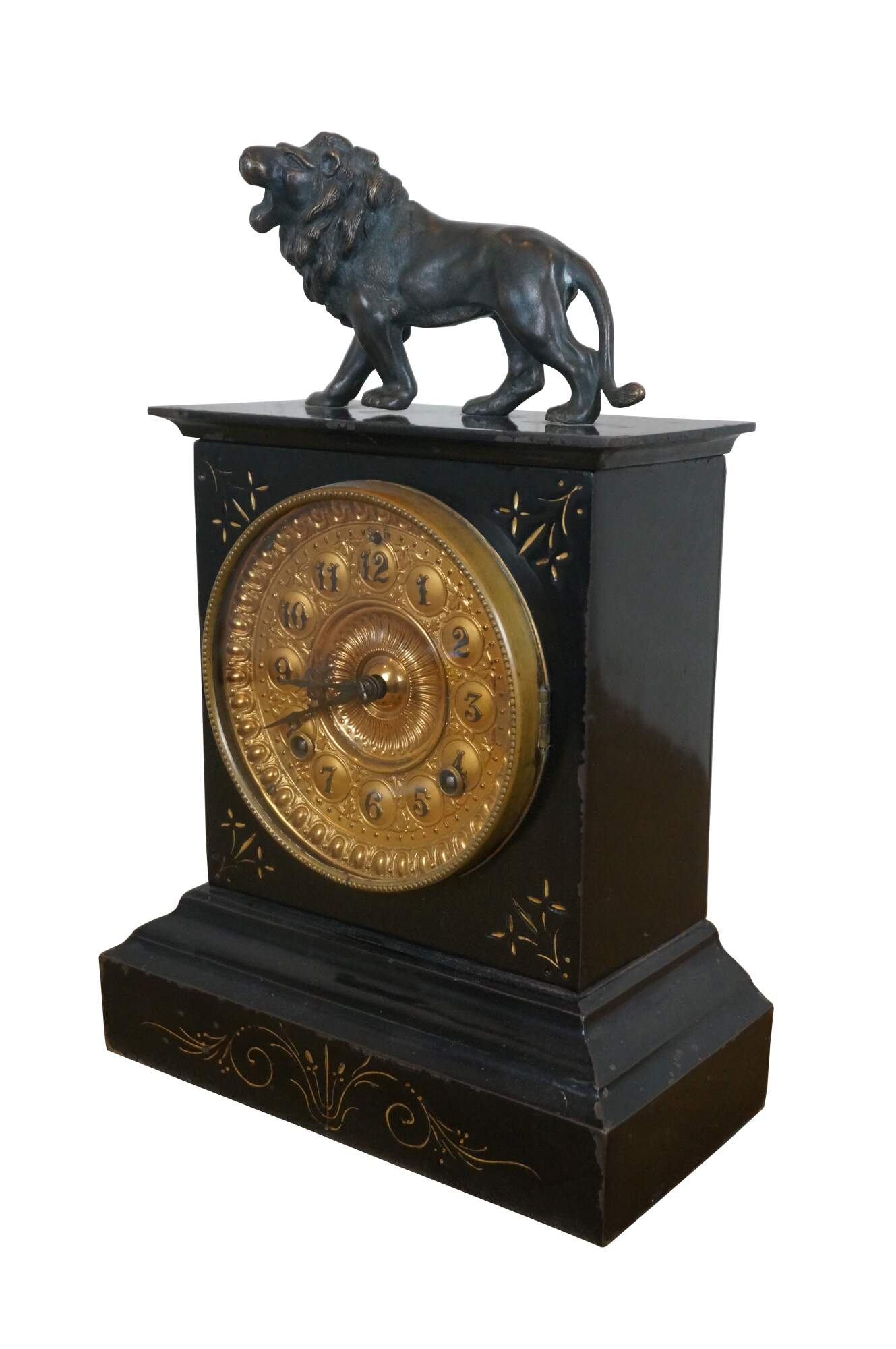 Late 19th century Ansonia key wound, chiming mantel clock. Features a rectangular, black lacquered, cast iron case with etched and gilt floral details, repousse gilt metal face with black Arabic numerals and hands, topped with a bronze figurine in the shape of a roaring lion. Movement by Ansonia Clock Company, New York, USA - Patented June 18, 1882 - 5 1/2. Includes key and pendulum. Good working order.