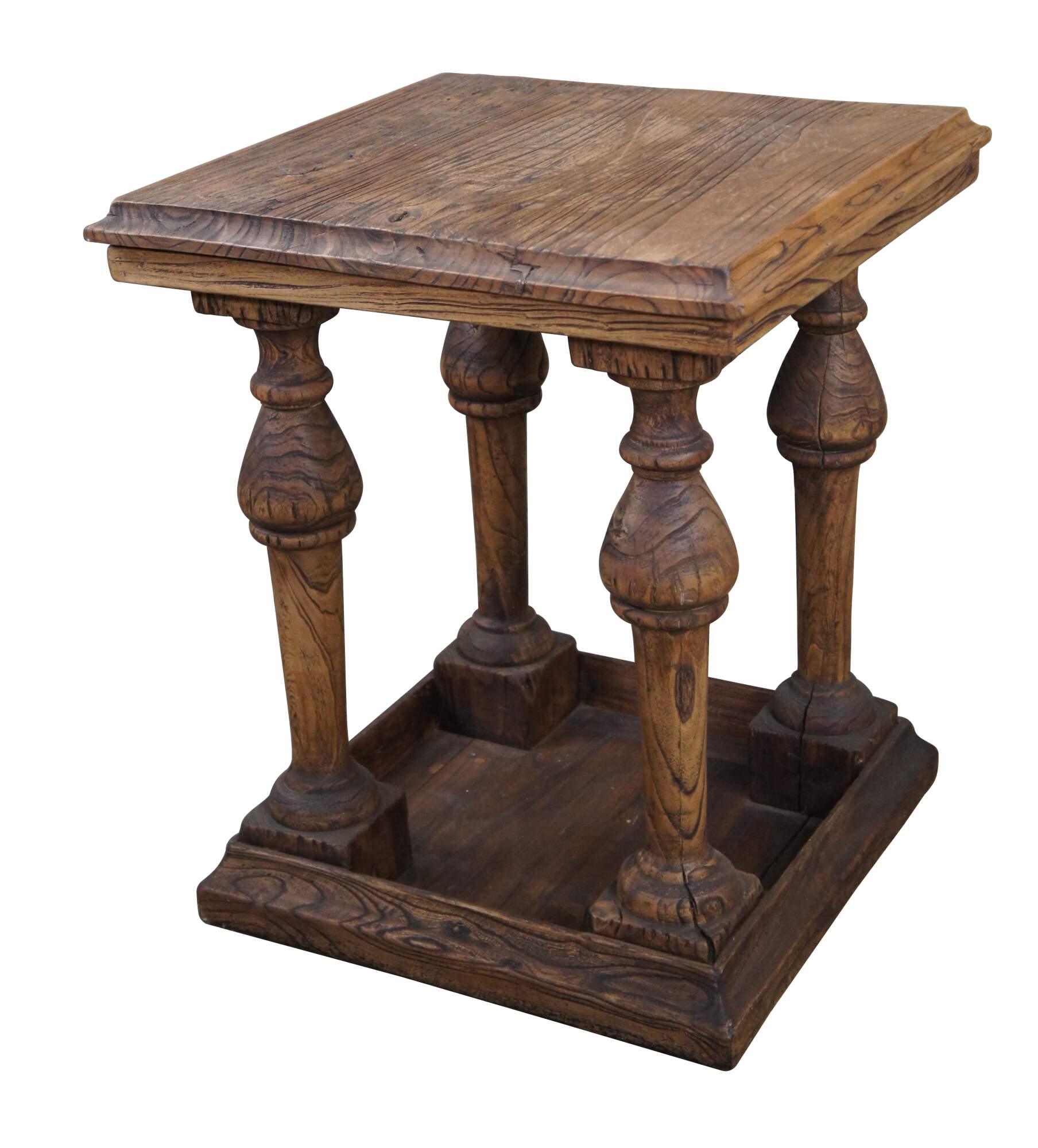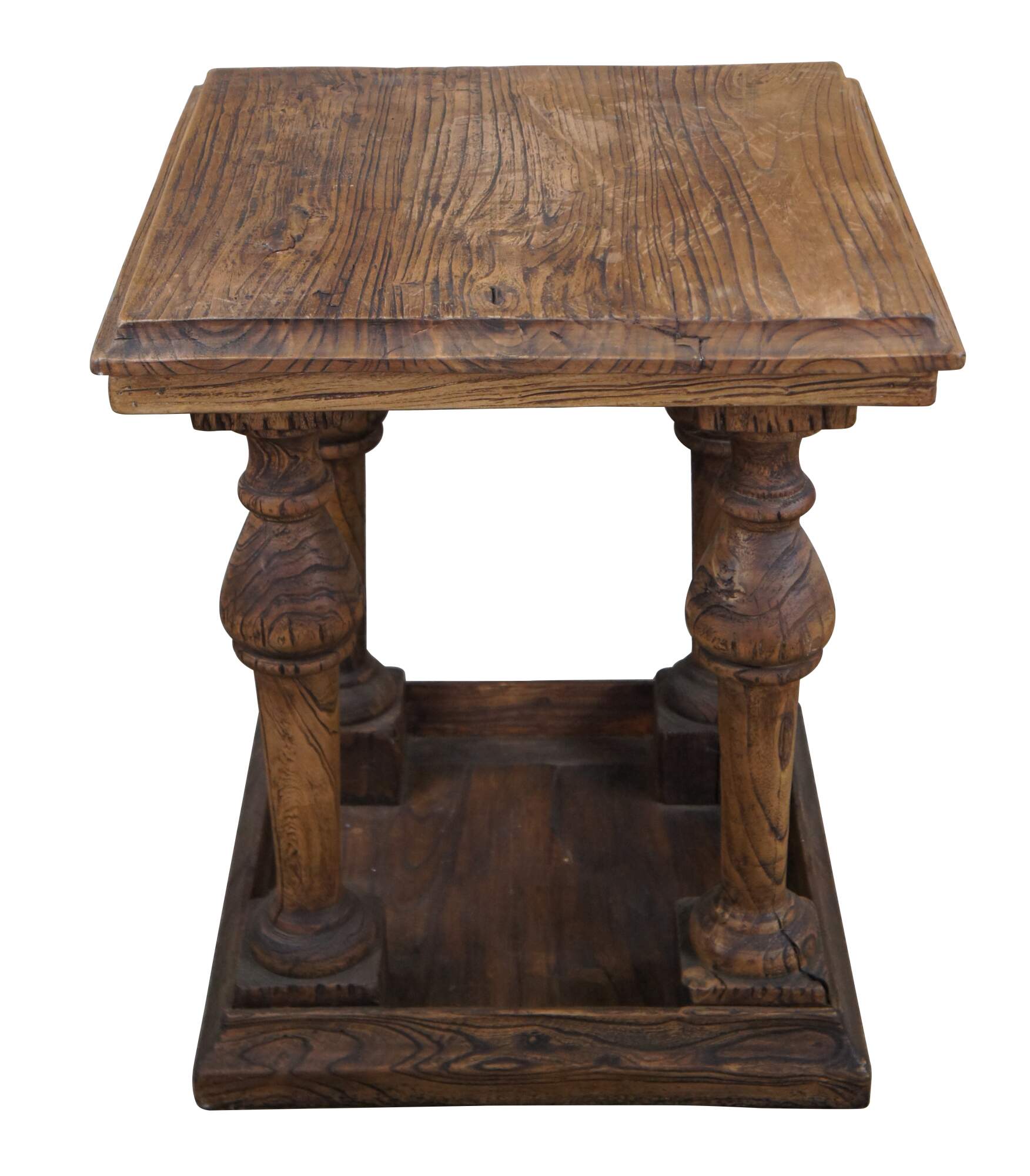 Vintage English farmhouse pedestal / side table / console / plant stand / sculpture base. Made of weathered oak featuring square form with chunky beveled top supported by turned Jacobean style columns in skirted base.