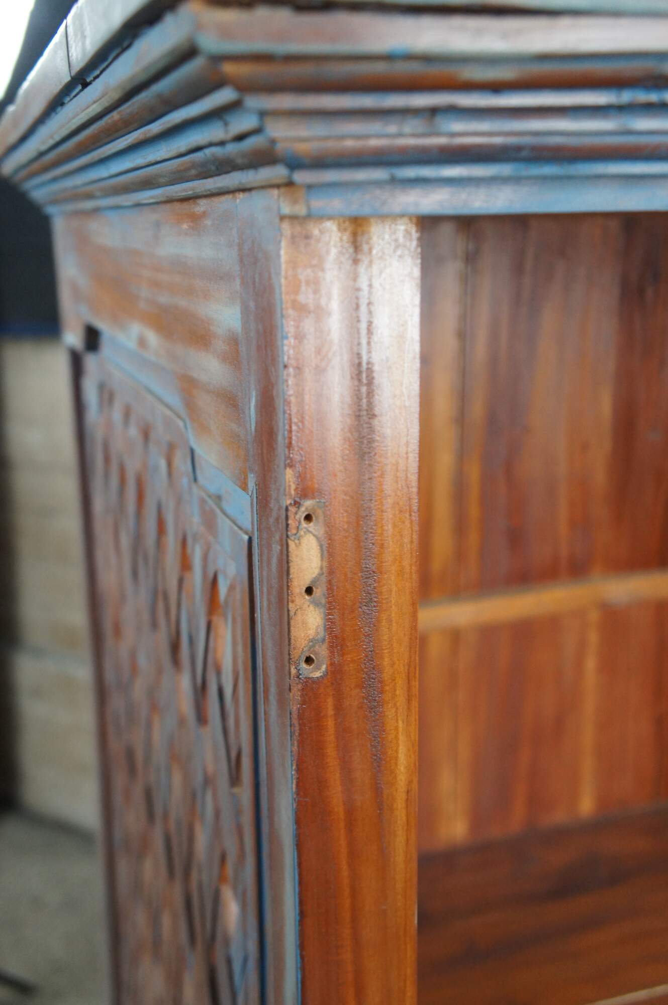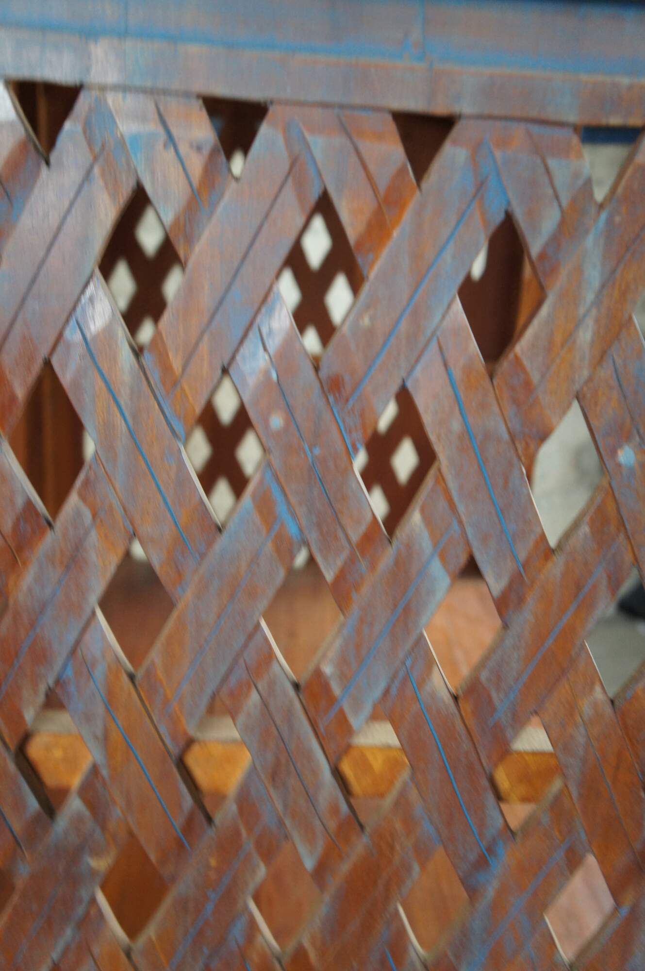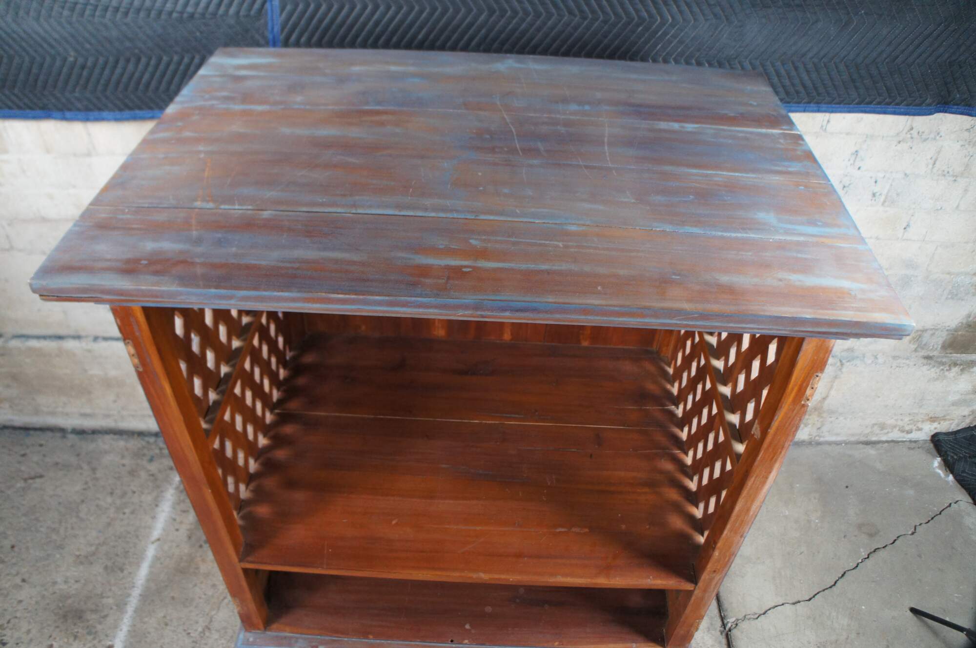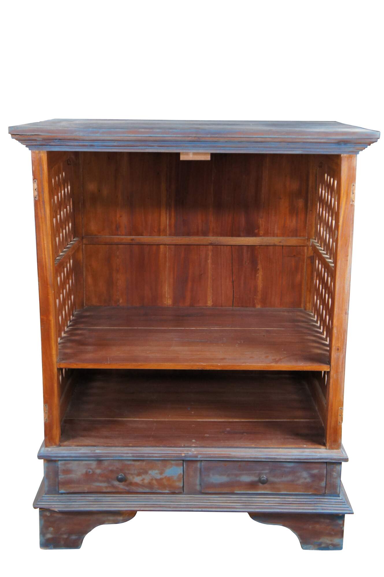 Vintage TV cabinet / console / linen storage featuring lattice sides, two drawers and one shelf supported by bracket feet.