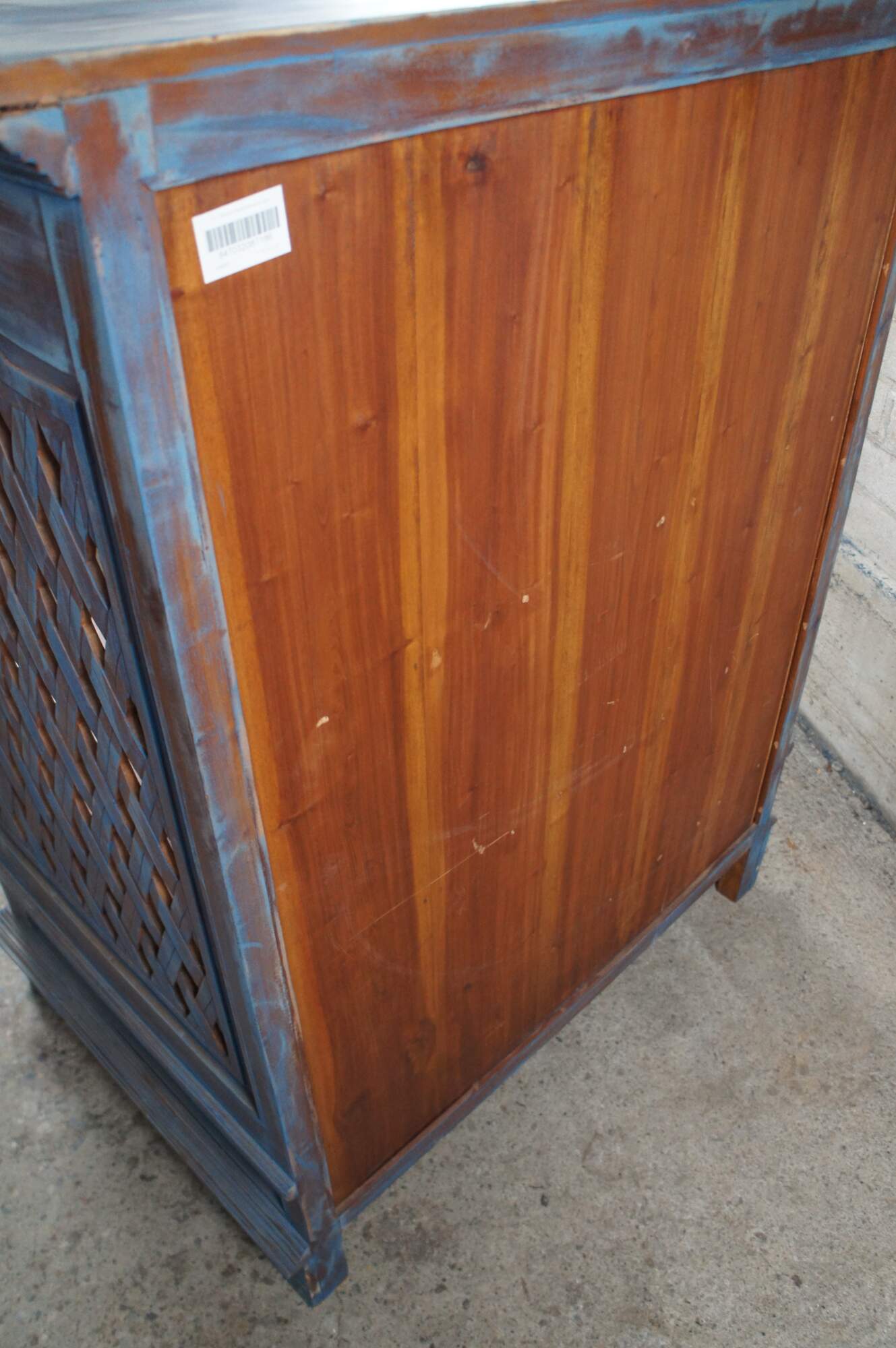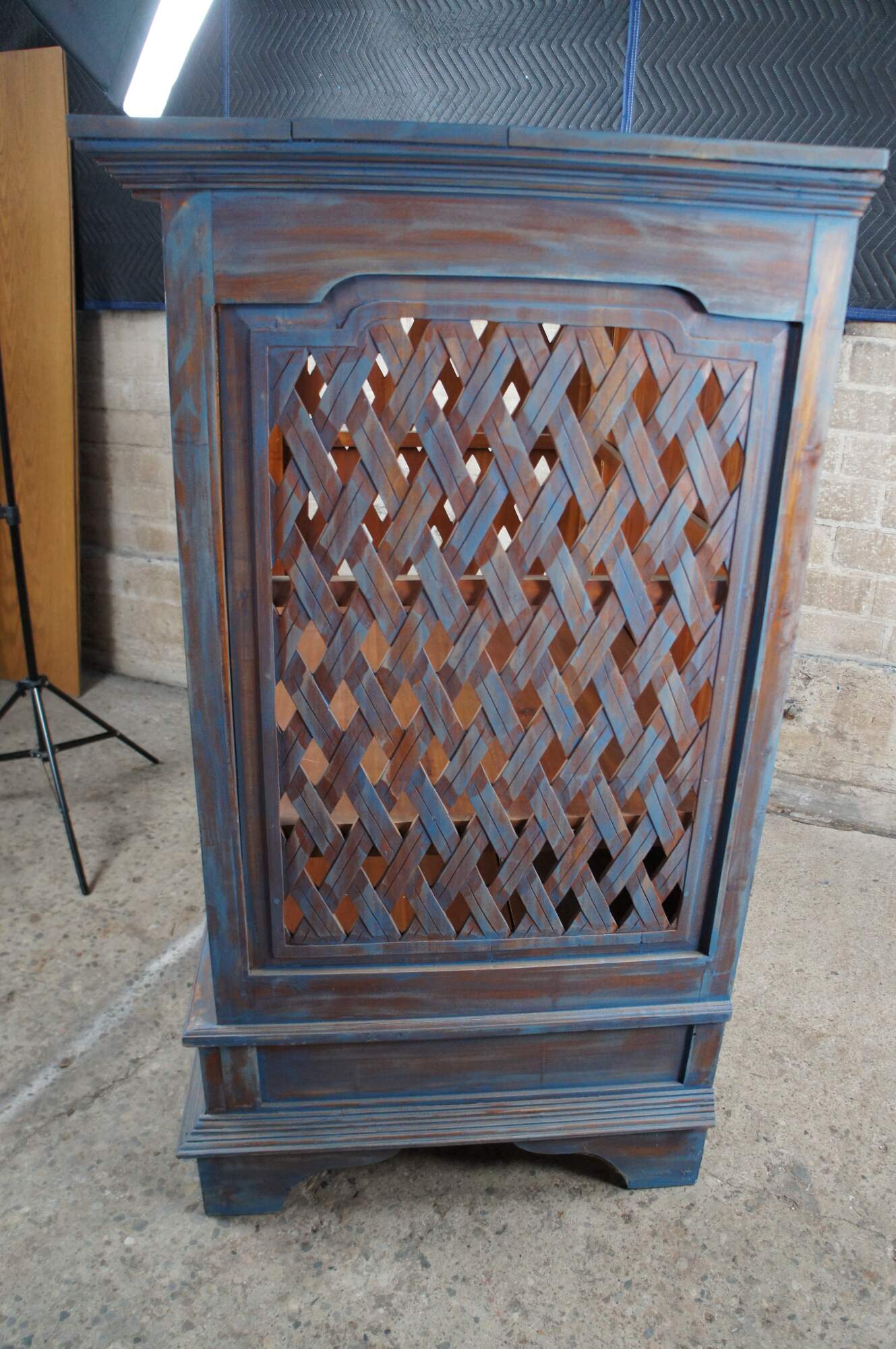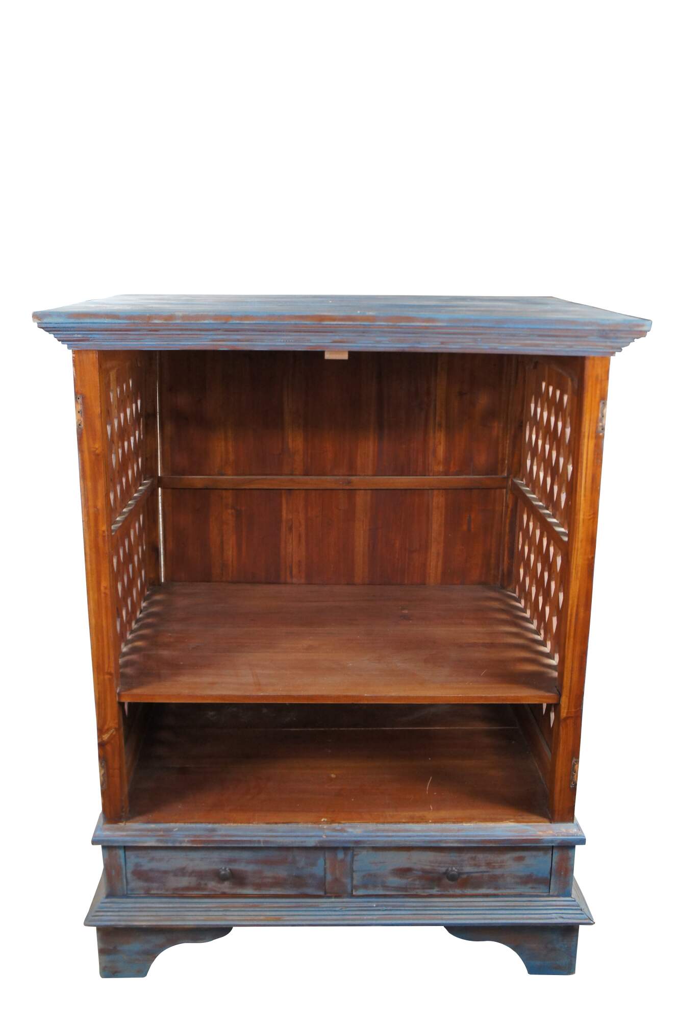 Vintage TV cabinet / console / linen storage featuring lattice sides, two drawers and one shelf supported by bracket feet.
