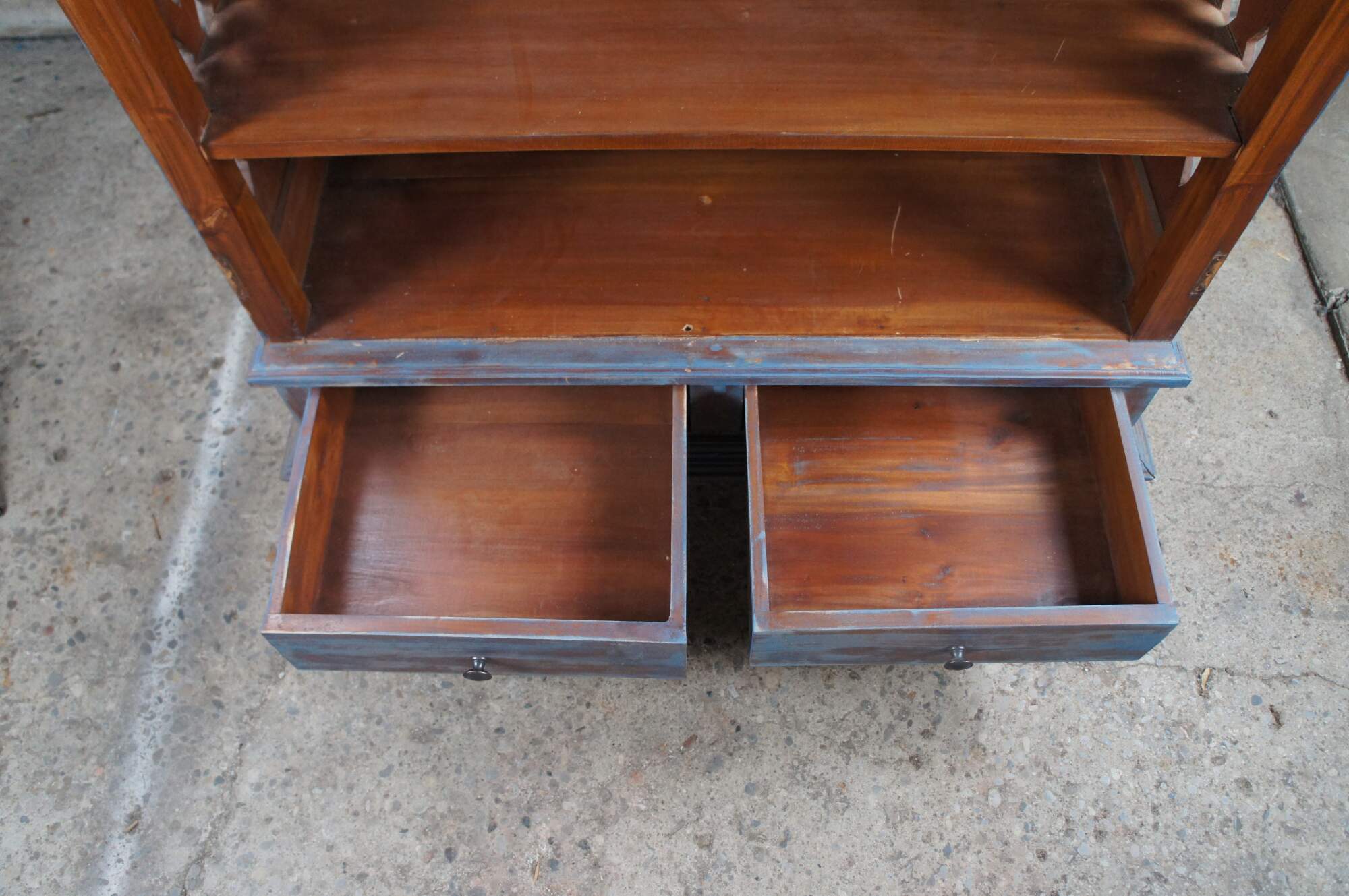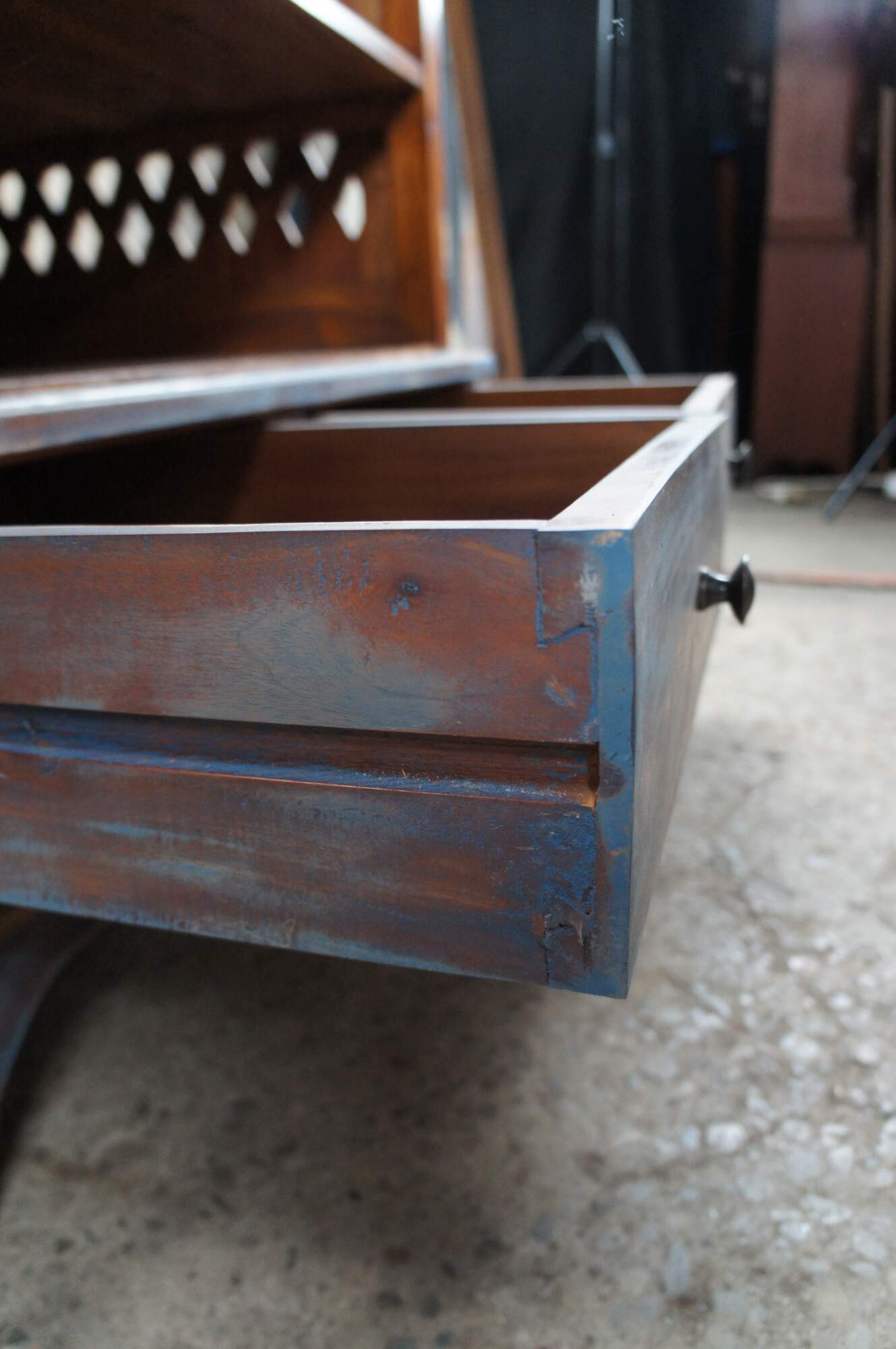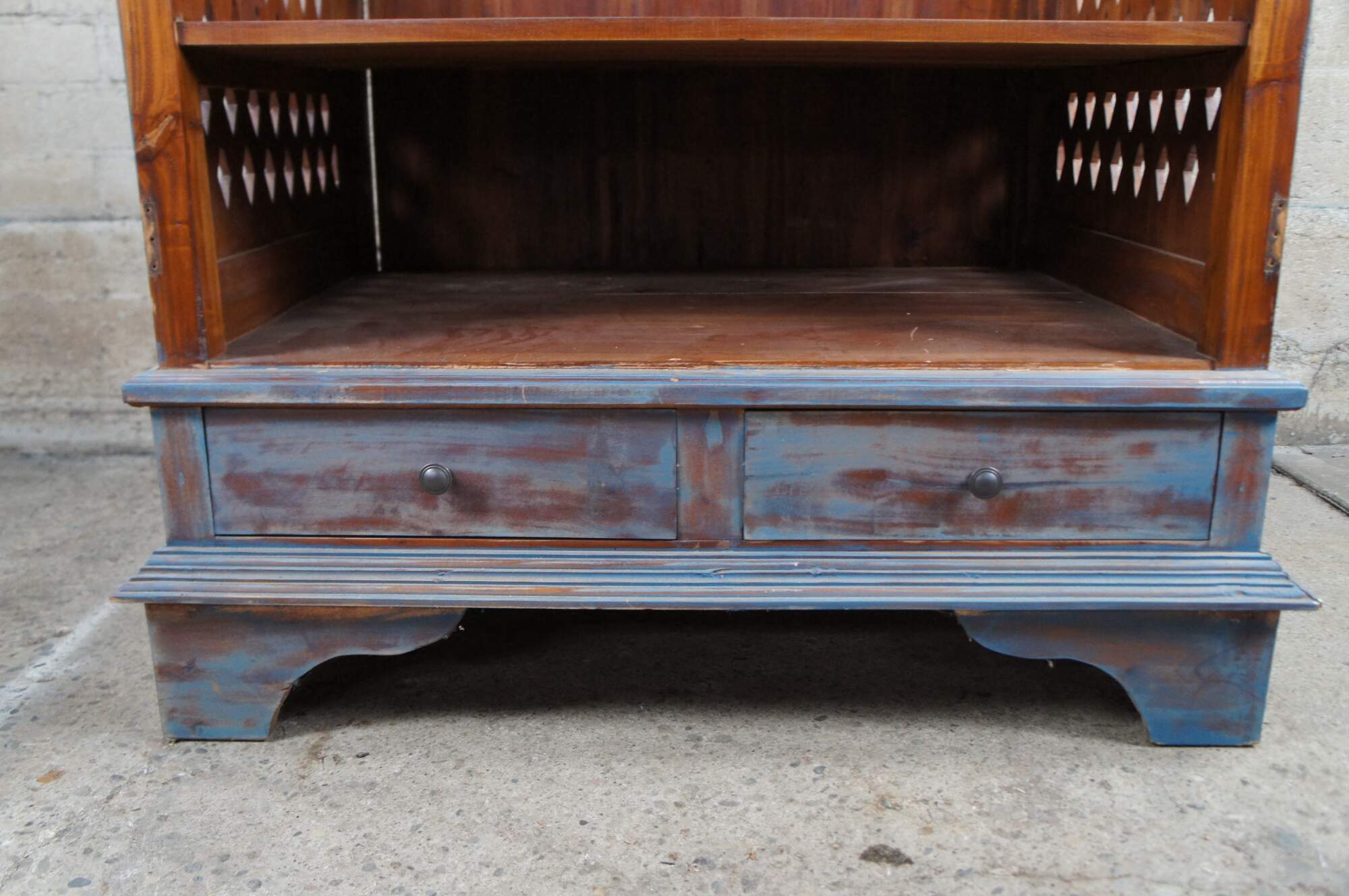 Vintage TV cabinet / console / linen storage featuring lattice sides, two drawers and one shelf supported by bracket feet.