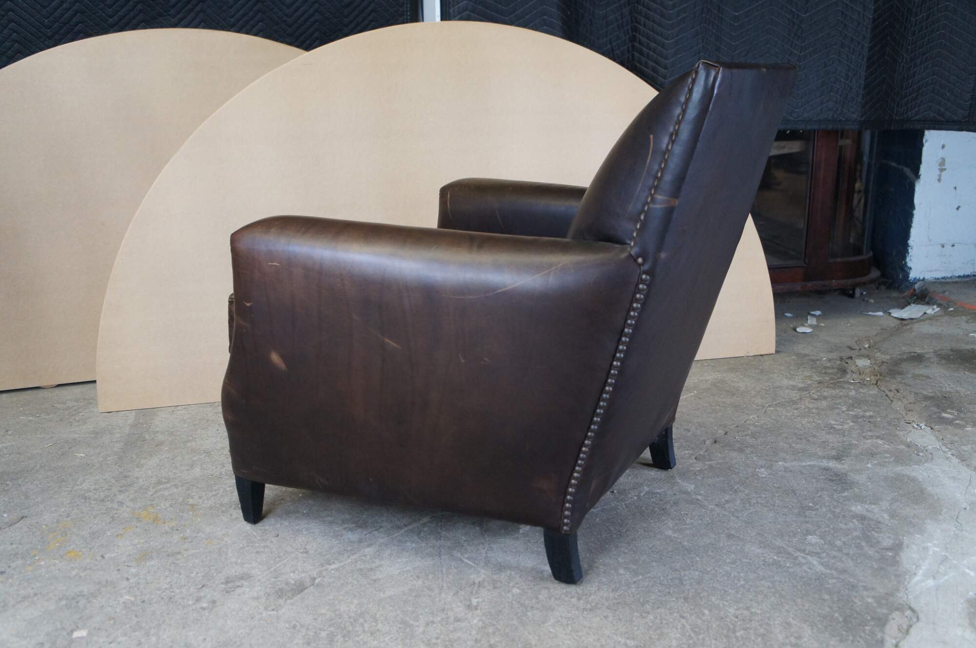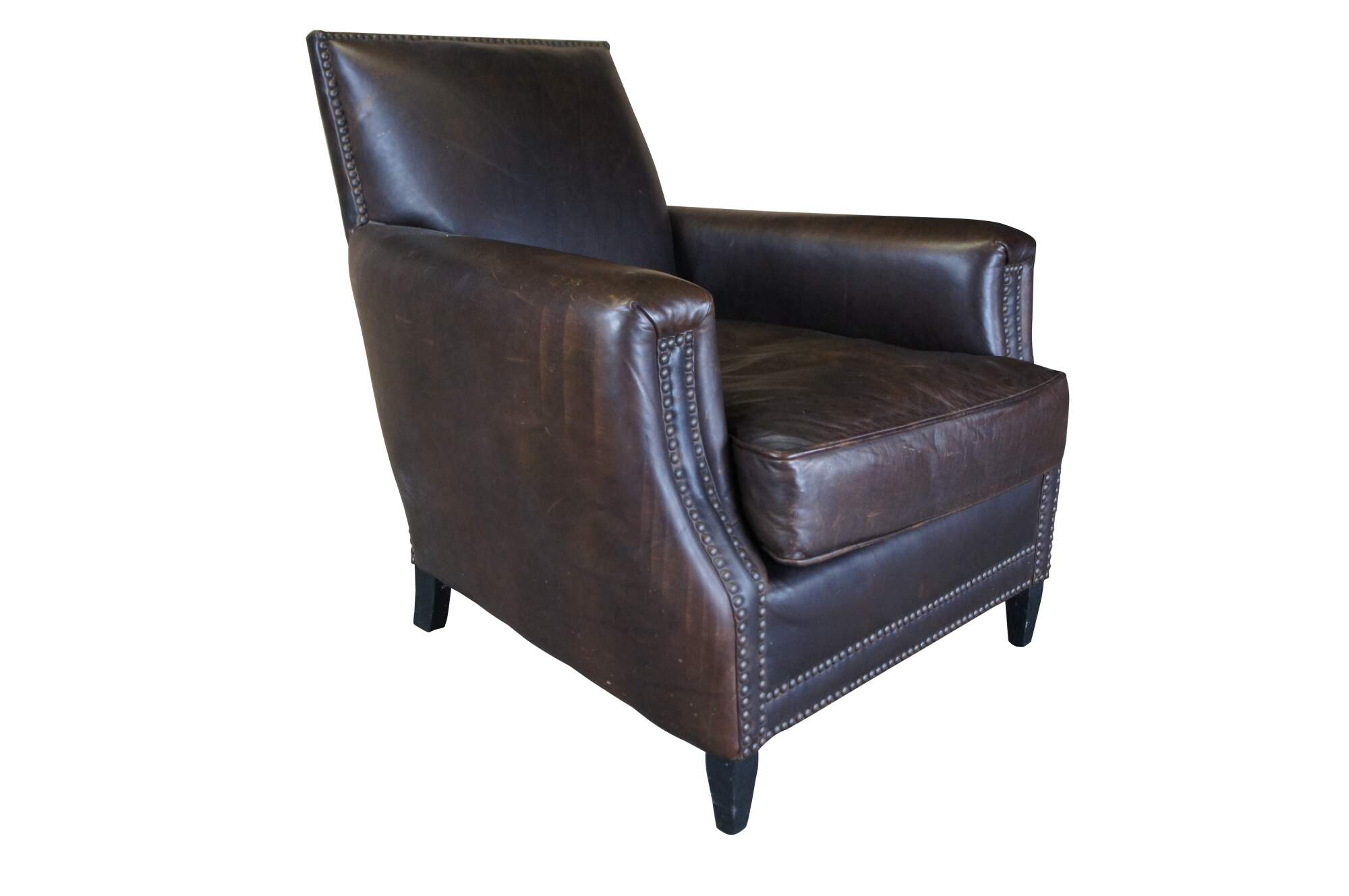 Modeled on French chairs of the 1930s and '40s, this club chair's handsome silhouette is highlighted by brass nailhead trim. Crisp angles are tempered by plush padding and gently sloped arms that scoop just slightly at the front.