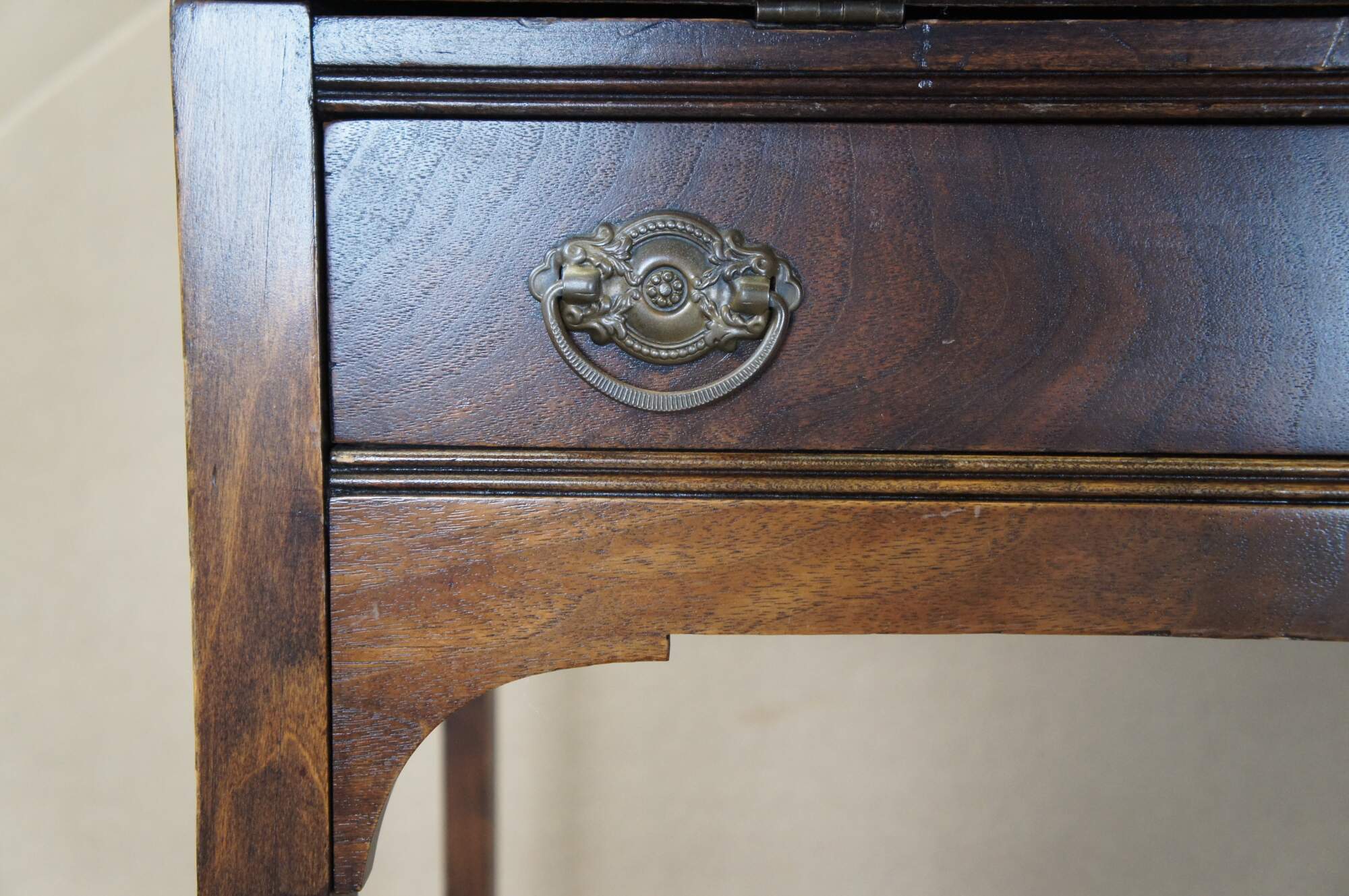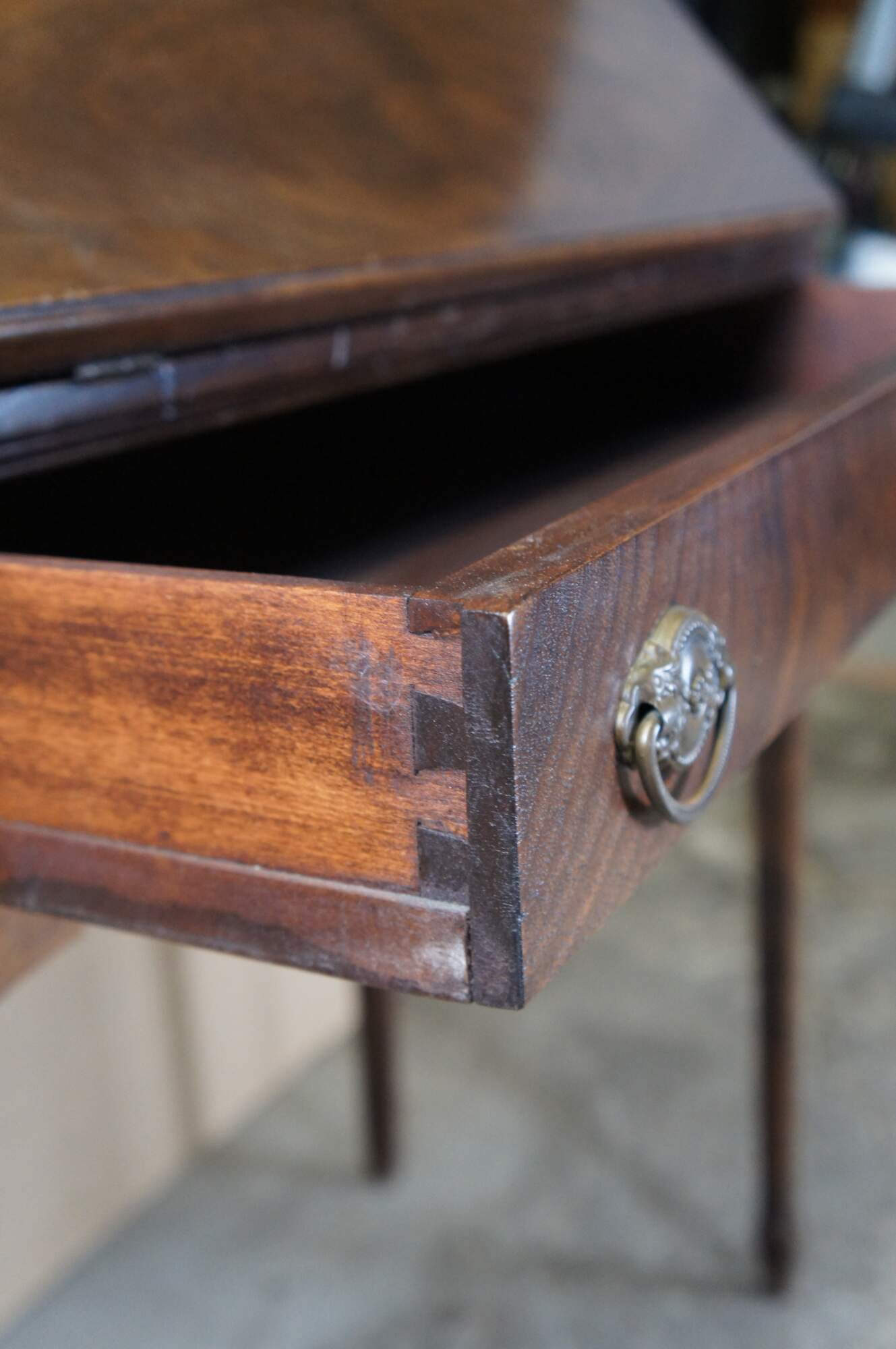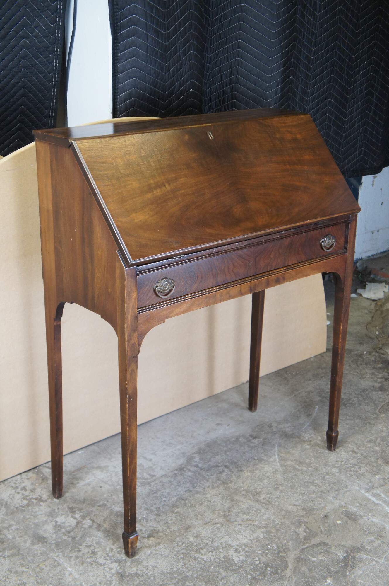 Sheraton style drop front secretary desk, circa 1930-40s. Made from mahogany with a bookmatch lid opening to a writing surface with shelves and pigeon holes. Dovetailed storage drawer beneath writing surface has ornate brass hardware. The desk is supported by square tapered legs leading to spade feet.