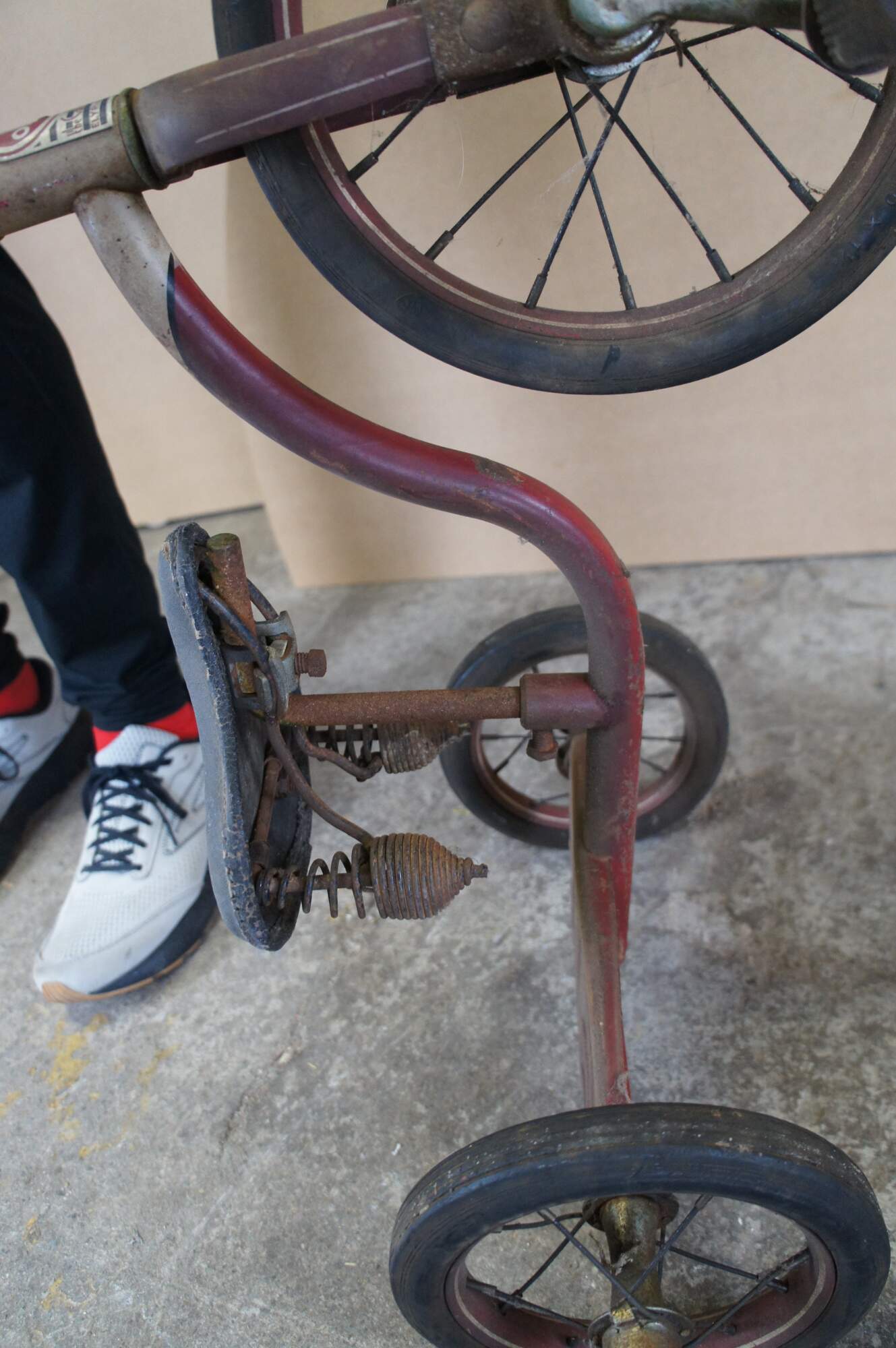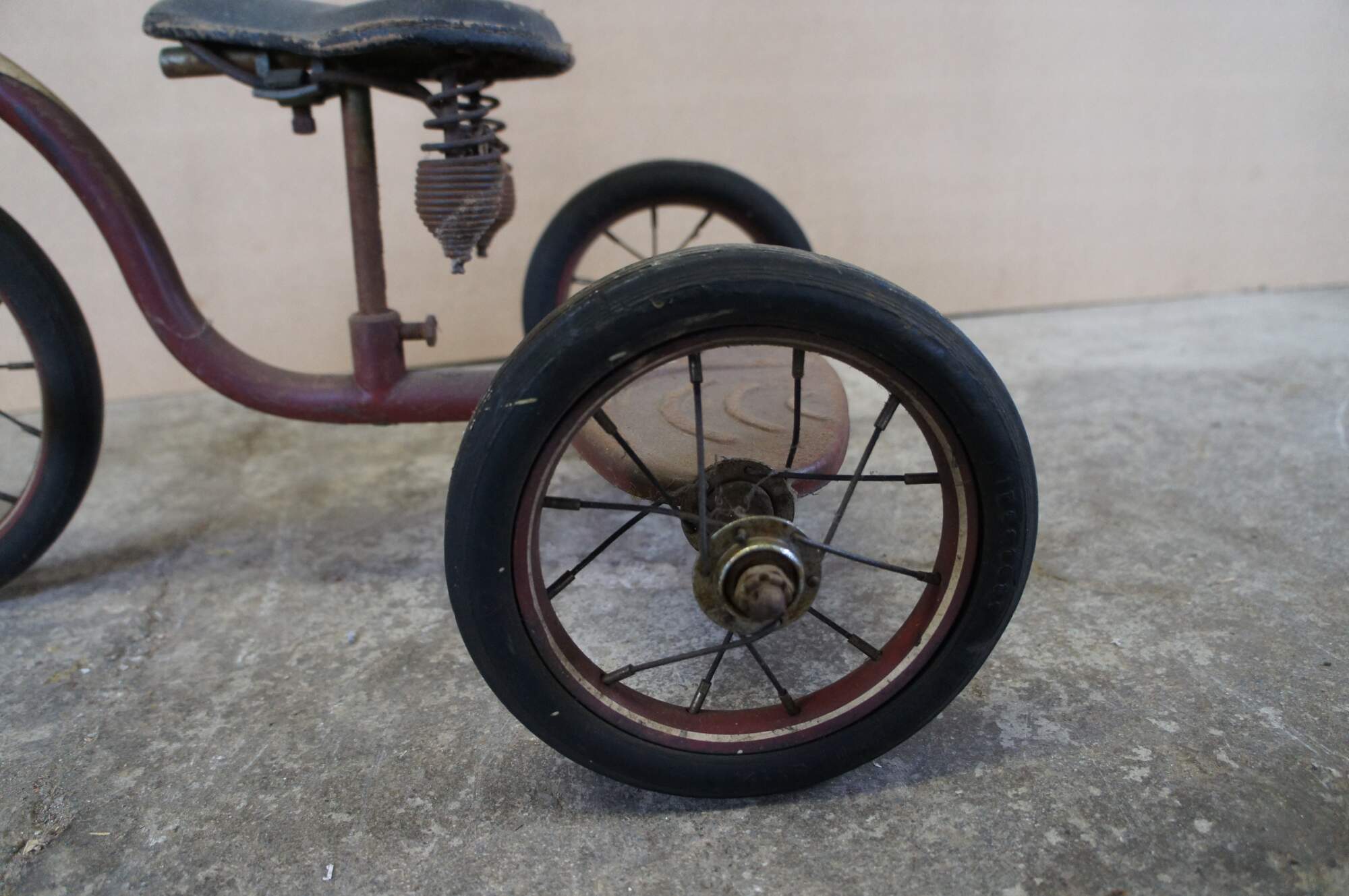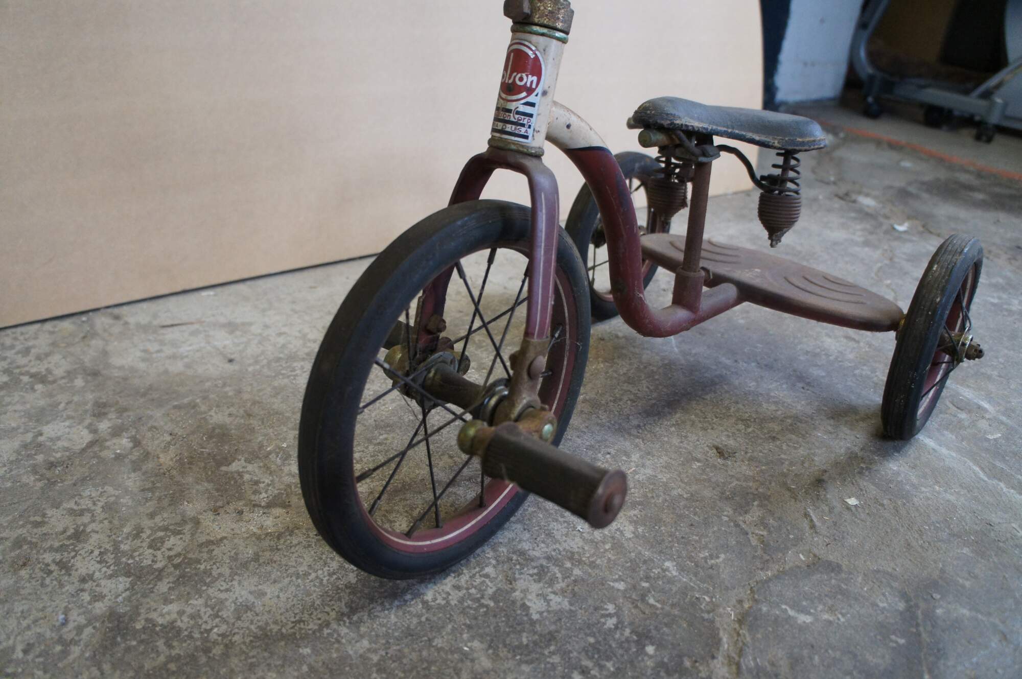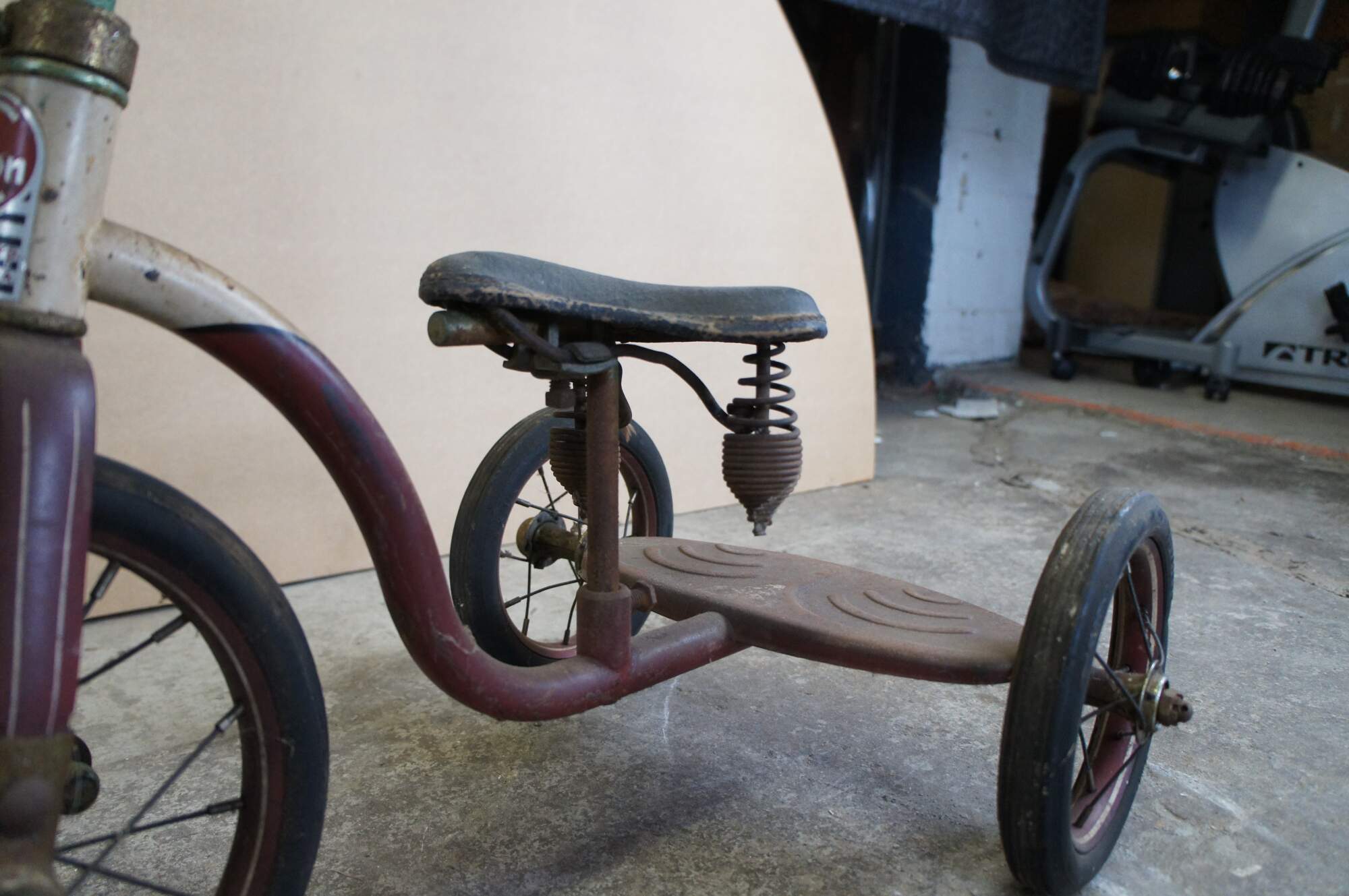 1940-50s Colson Tricycle Trike, Elyria, Ohio. Two-tone red and white with spring-loaded seat.