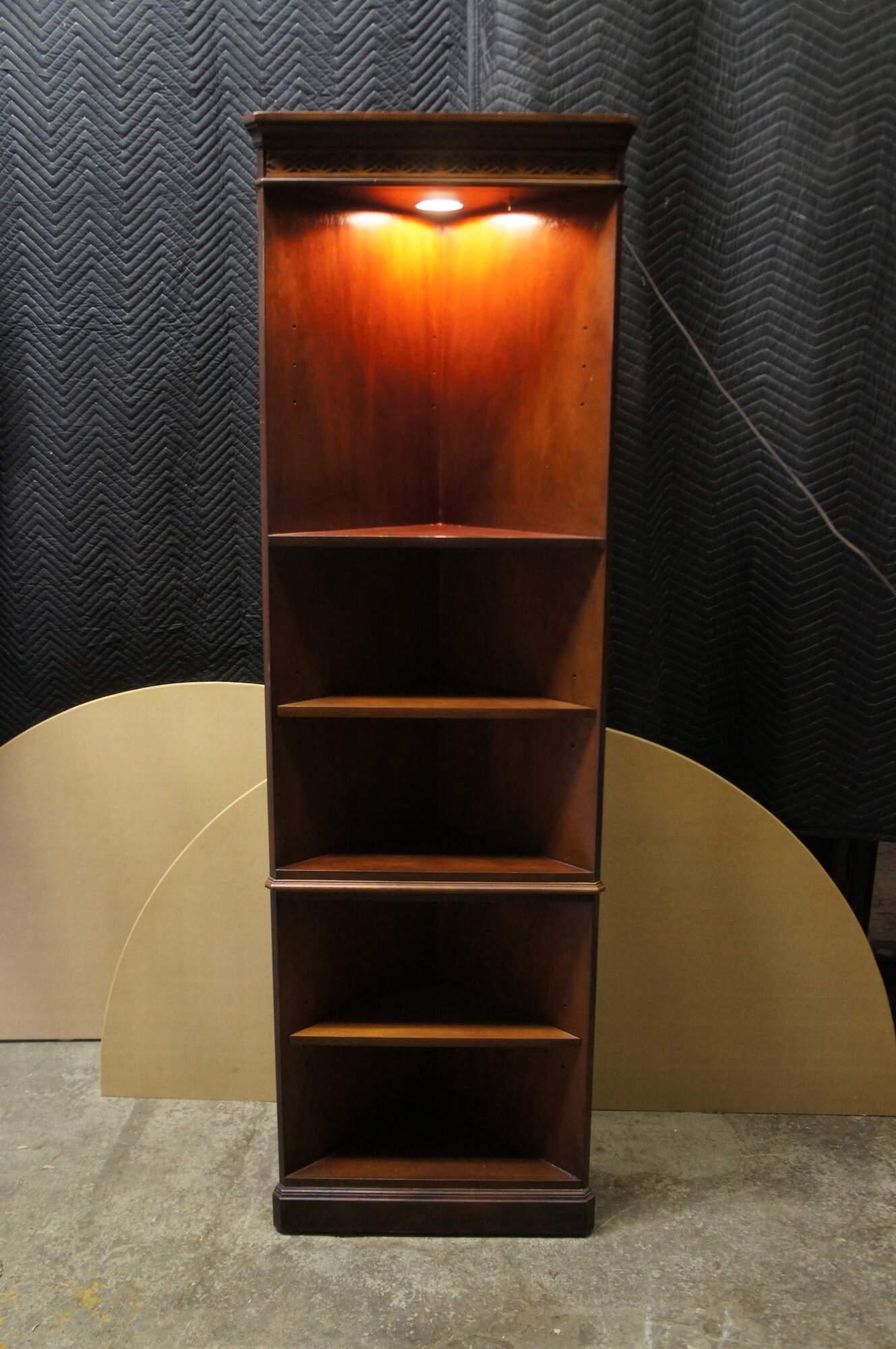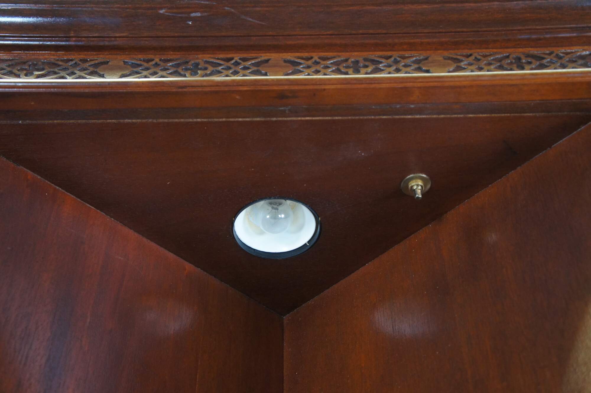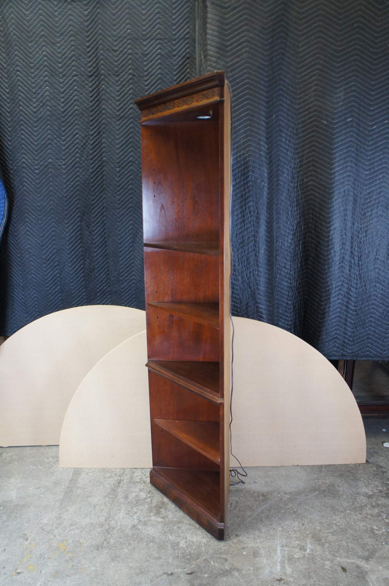 1980s Thomasville Petite Corner Cabinet / bookshelf. Made from mahogany in English Georgian styling with fretwork free below the apron, illuminated top, and 5 shelves. Two of the shelves are adjustable.