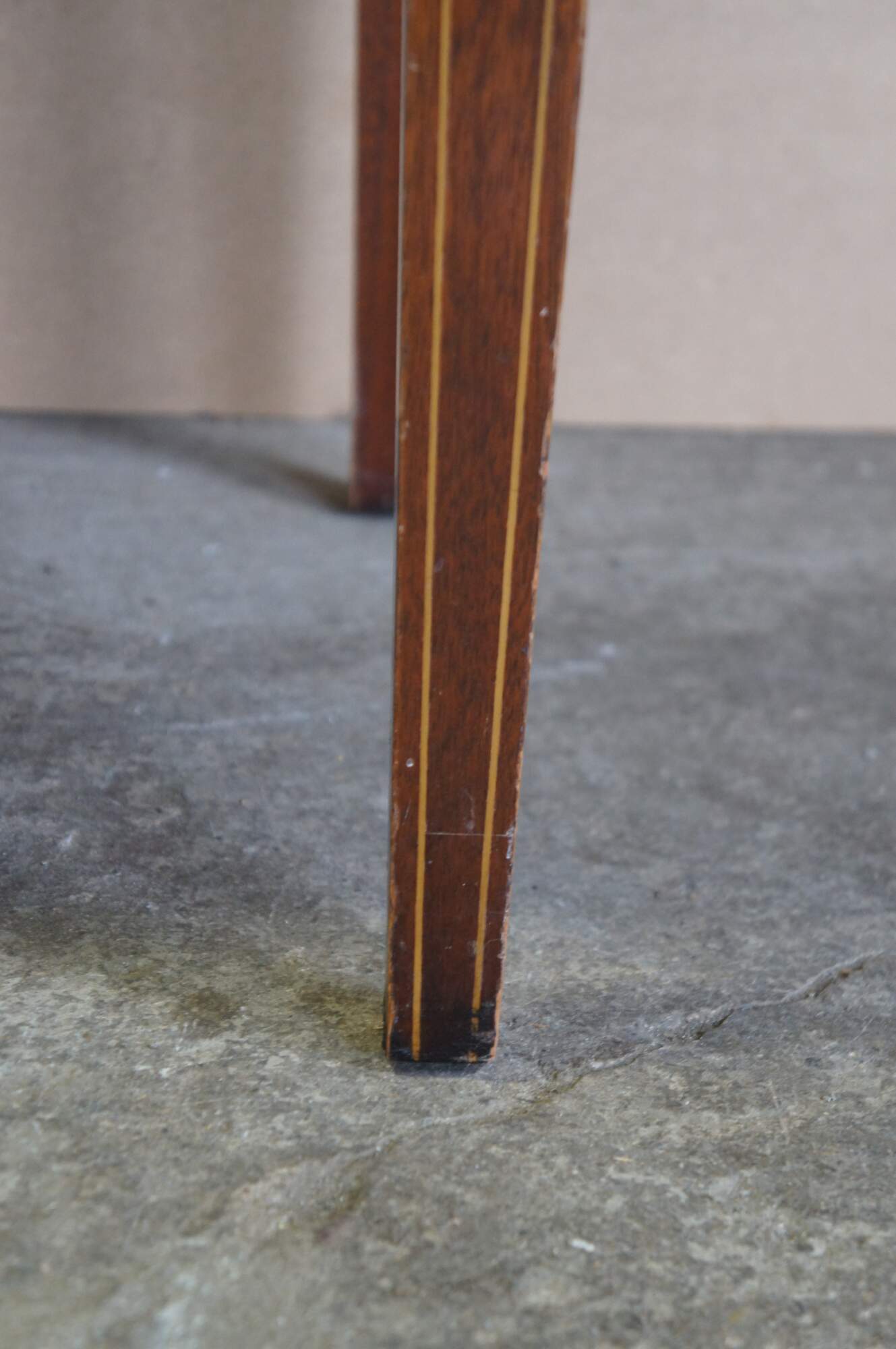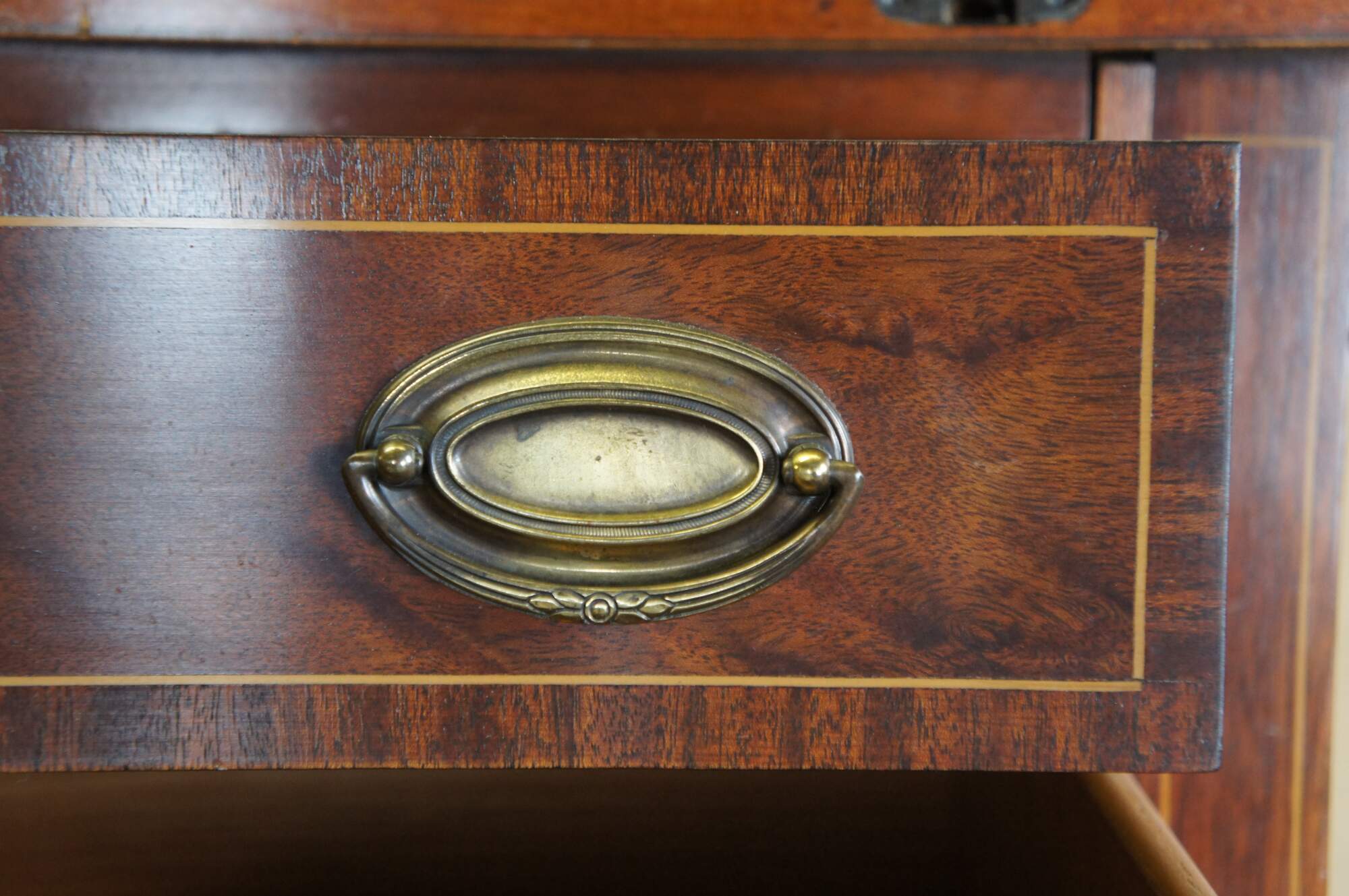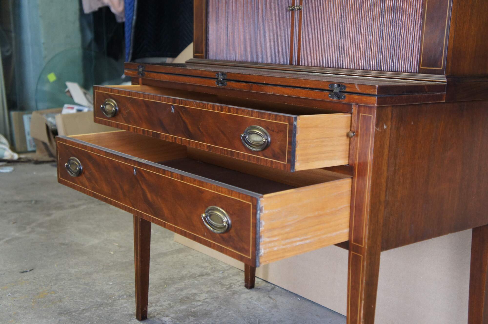 An exceptional vintage Hepplewhite-style secretary by Maddox, circa 1930s. This beautiful specimen is made from mahogany with an upper bookcase having double mullioned glass doors over a central compartment with tambour doors. The doors open to secretary storage with six pigeon holes set between six satinwood inlaid drawers, surmounted by a drop front desk. The desk surface is set over two dovetailed satinwood inlaid drawers and raised over square tapered legs. Bookcase shelves have plate grooves for china. Original label inside of drawer as well as along the backside.