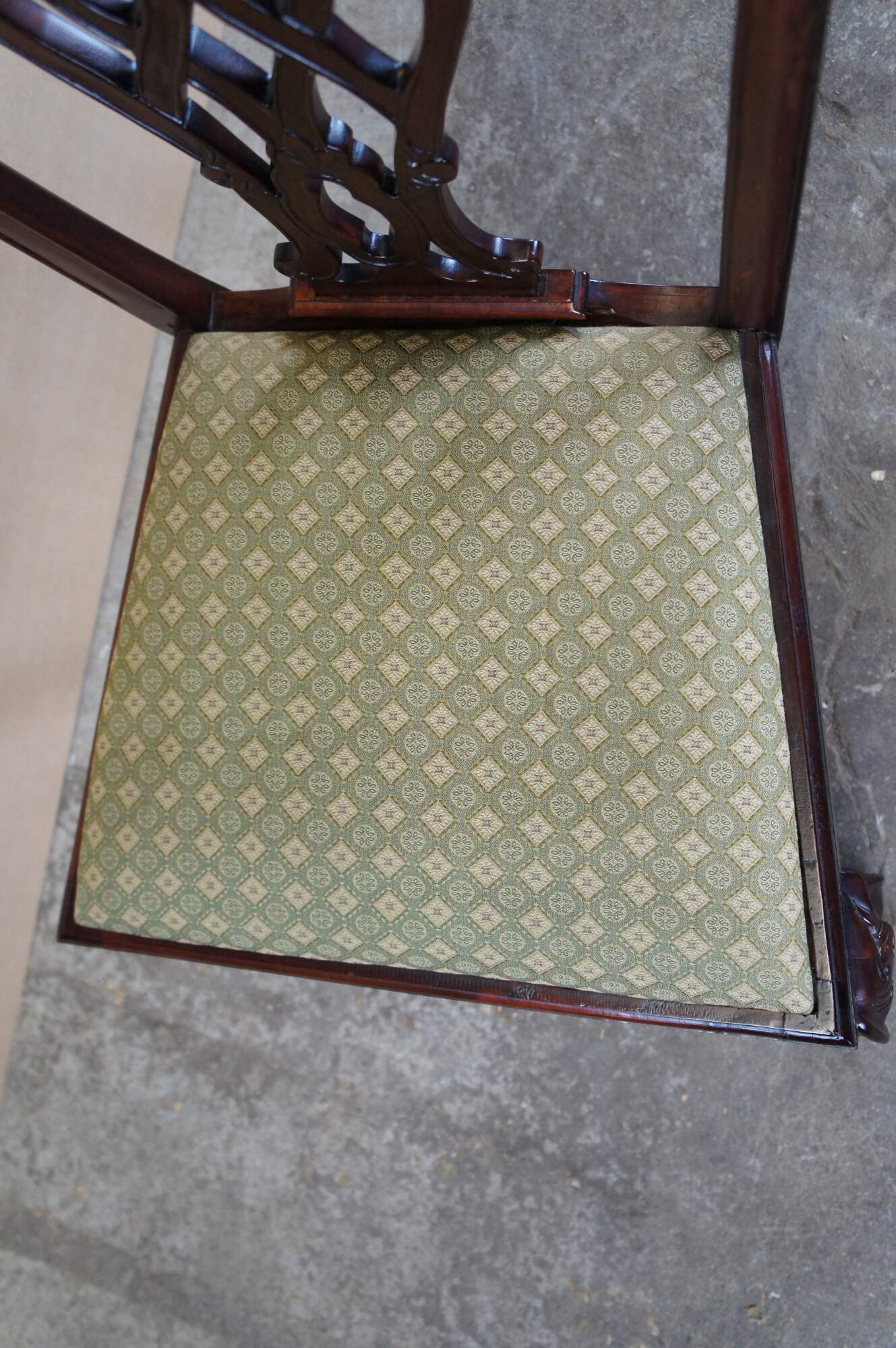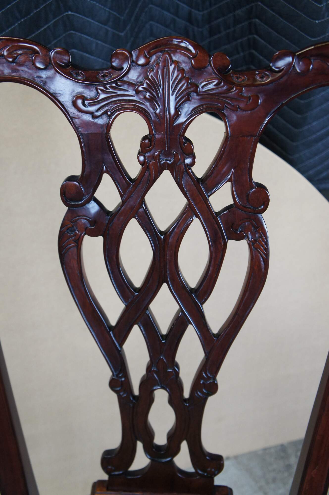 Set of 8 Chippendale style dining chairs, circa 2000s. Made from Indonesian Mahogany with an acanthus carved crest rail, interlaced back splat, geometric upholstered seat and cabriole legs leading to ball and claw feet.