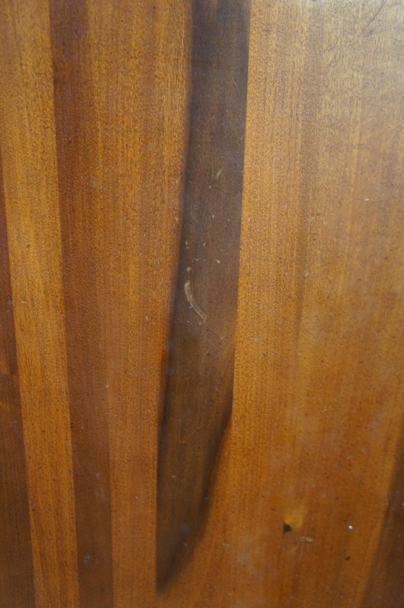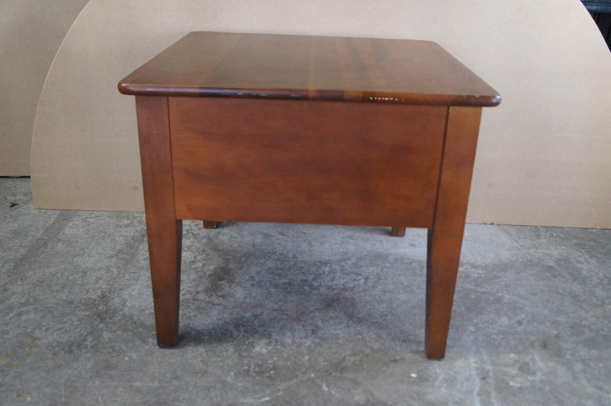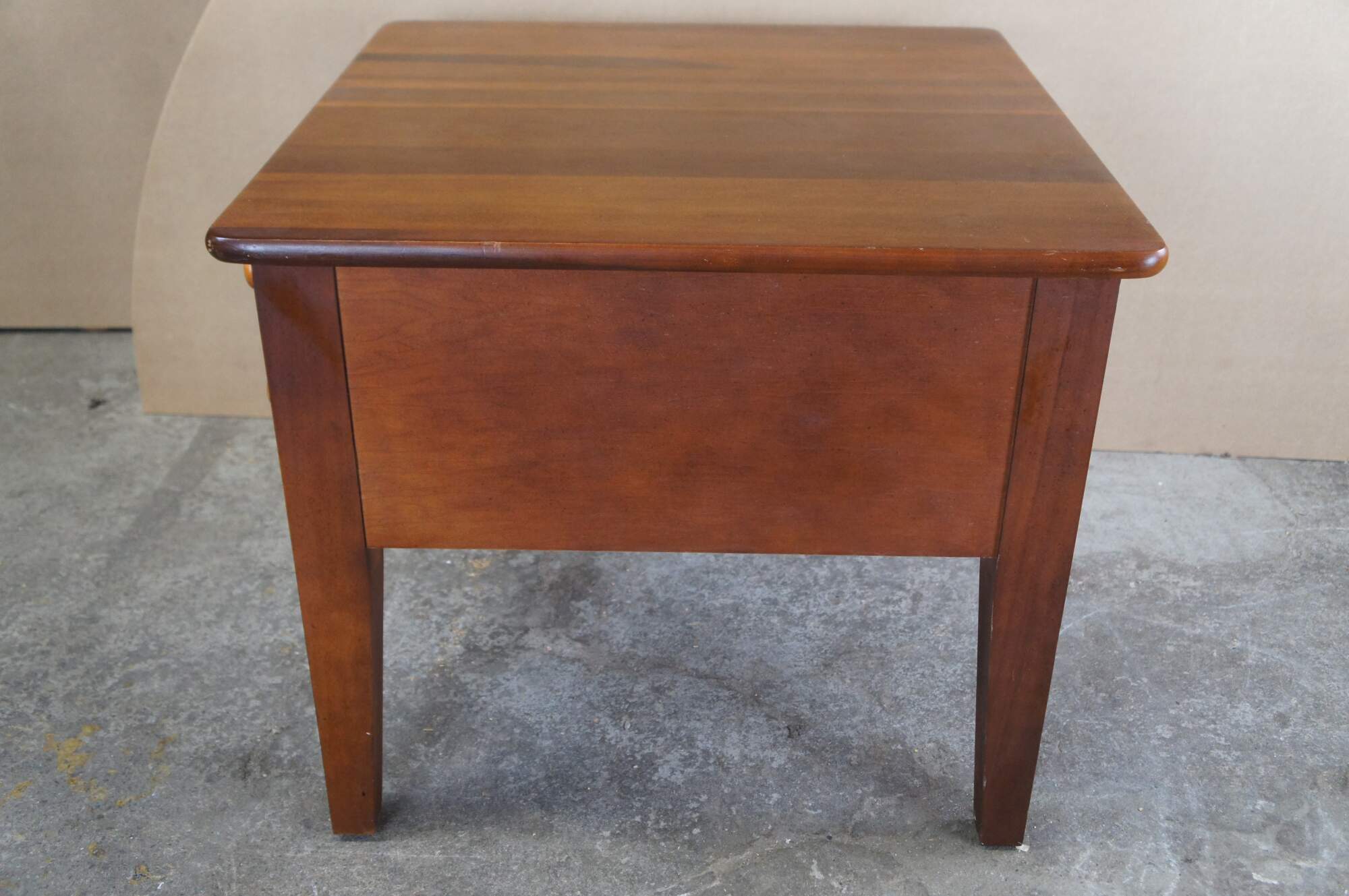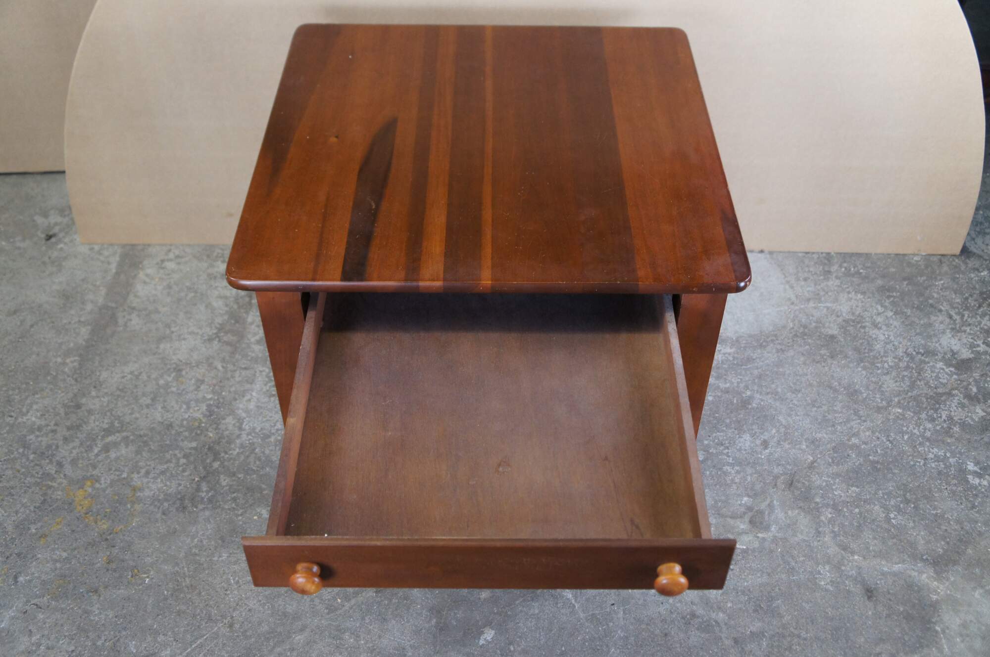 Vintage American Country Farmhouse Cherry Finished Bedside End Table. Features a rectangular frame with a large upper drawer over two smaller drawers. Lower apron is serpentine between square tapered legs.