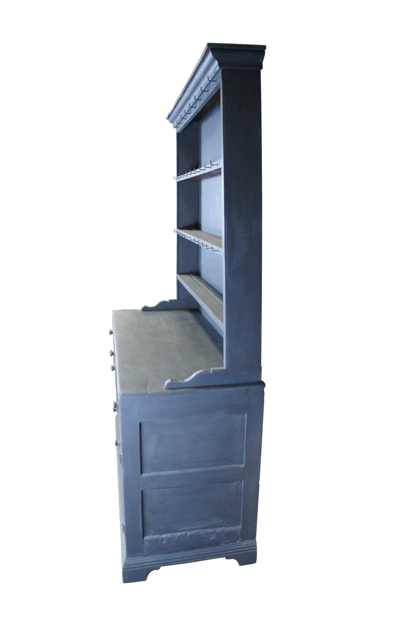 Late 18th century to early 19th century Welsh Dresser or pewter cupboard. Made from oak with a gray painted finish. Features an upper hutch or rack with three shelves and metal hooks for pans and utensils over a paneled base with two drawers and a lower cabinet with a shelf. The cabinet is supported by bracket feet. The hutch portion is a later 20th century addition to the piece. The base has an incredible patina and character. Mortise and tenon construction. Look at the interior of the lower cabinet to see the centuries-old boards along the bottom.