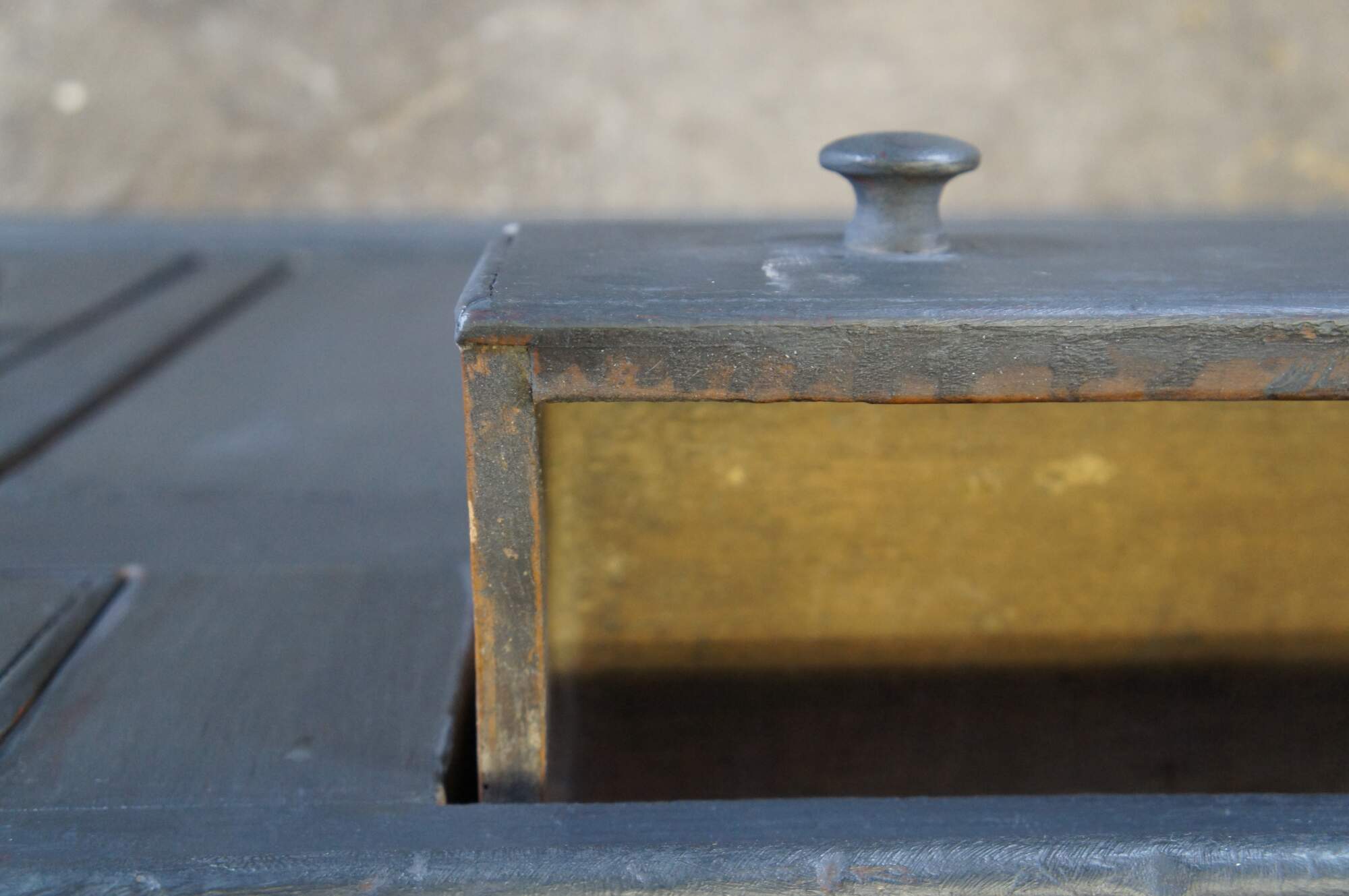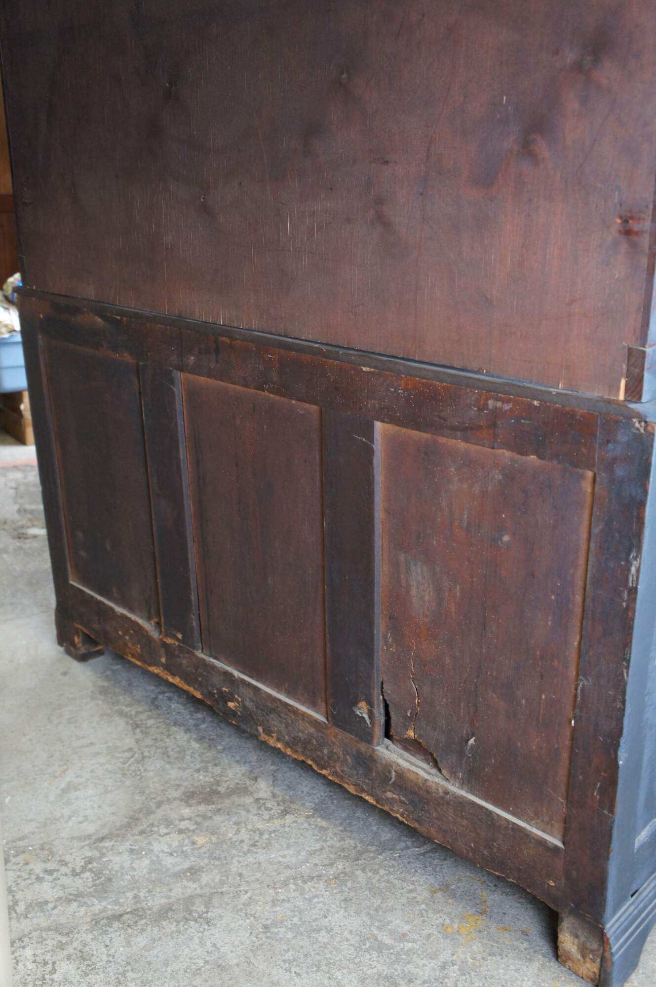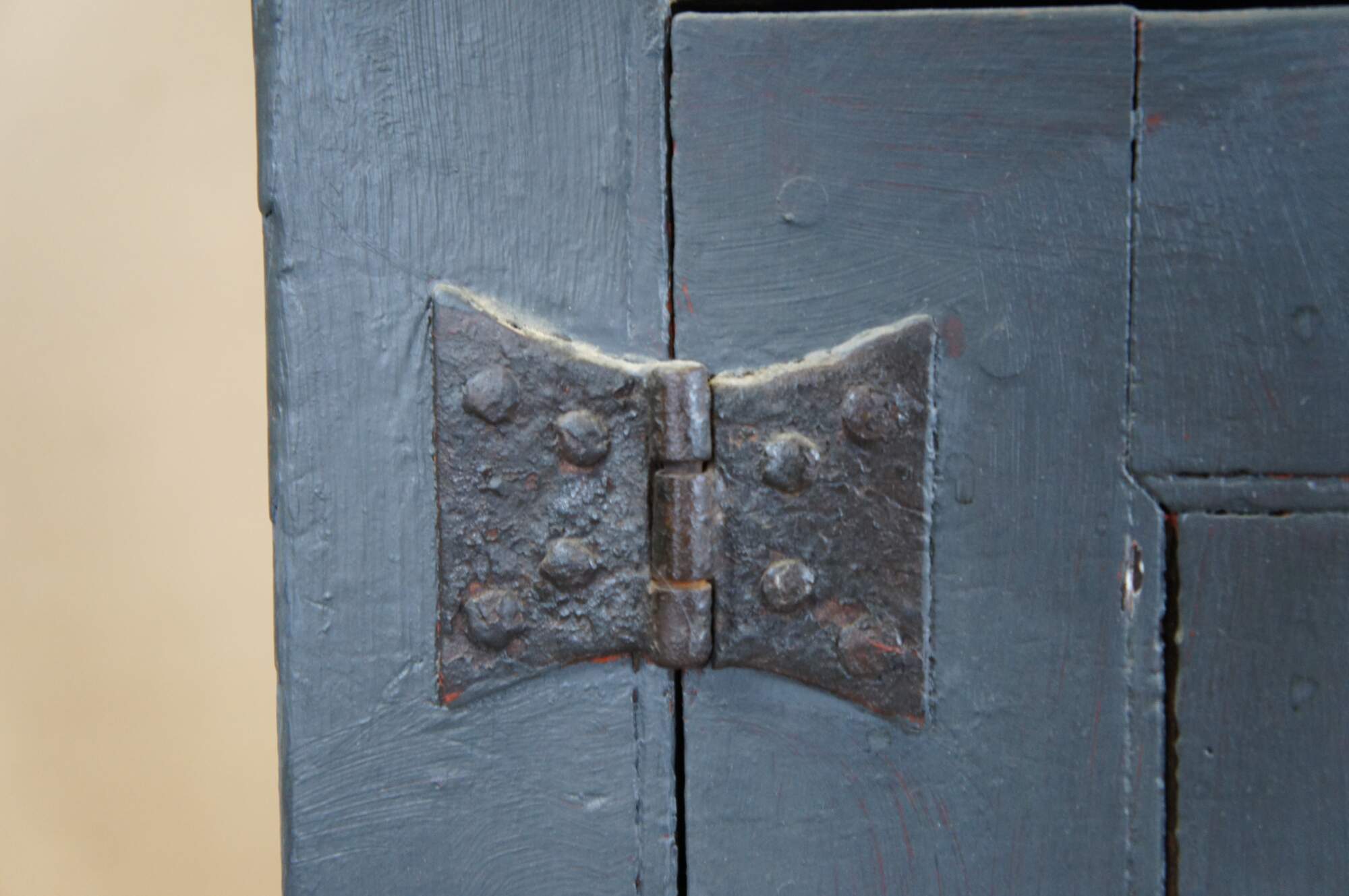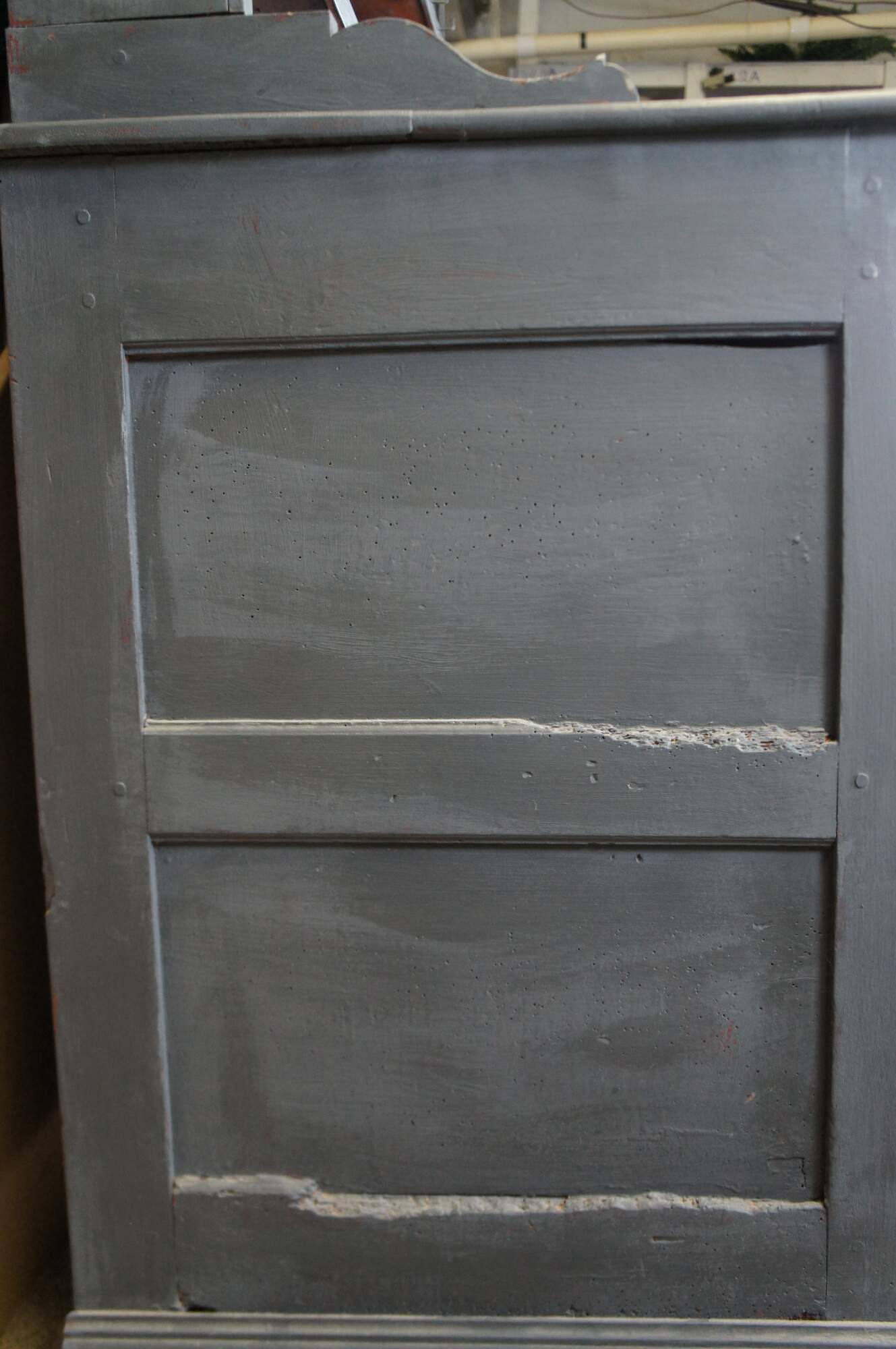 Fair; structurally solid, distressing, and age-related wear. Wormholes, marks, past repairs, and scuffs. One hook missing on the hutch.