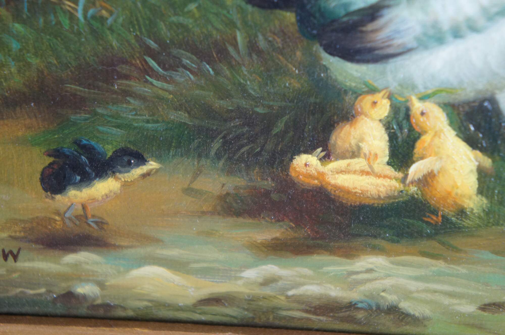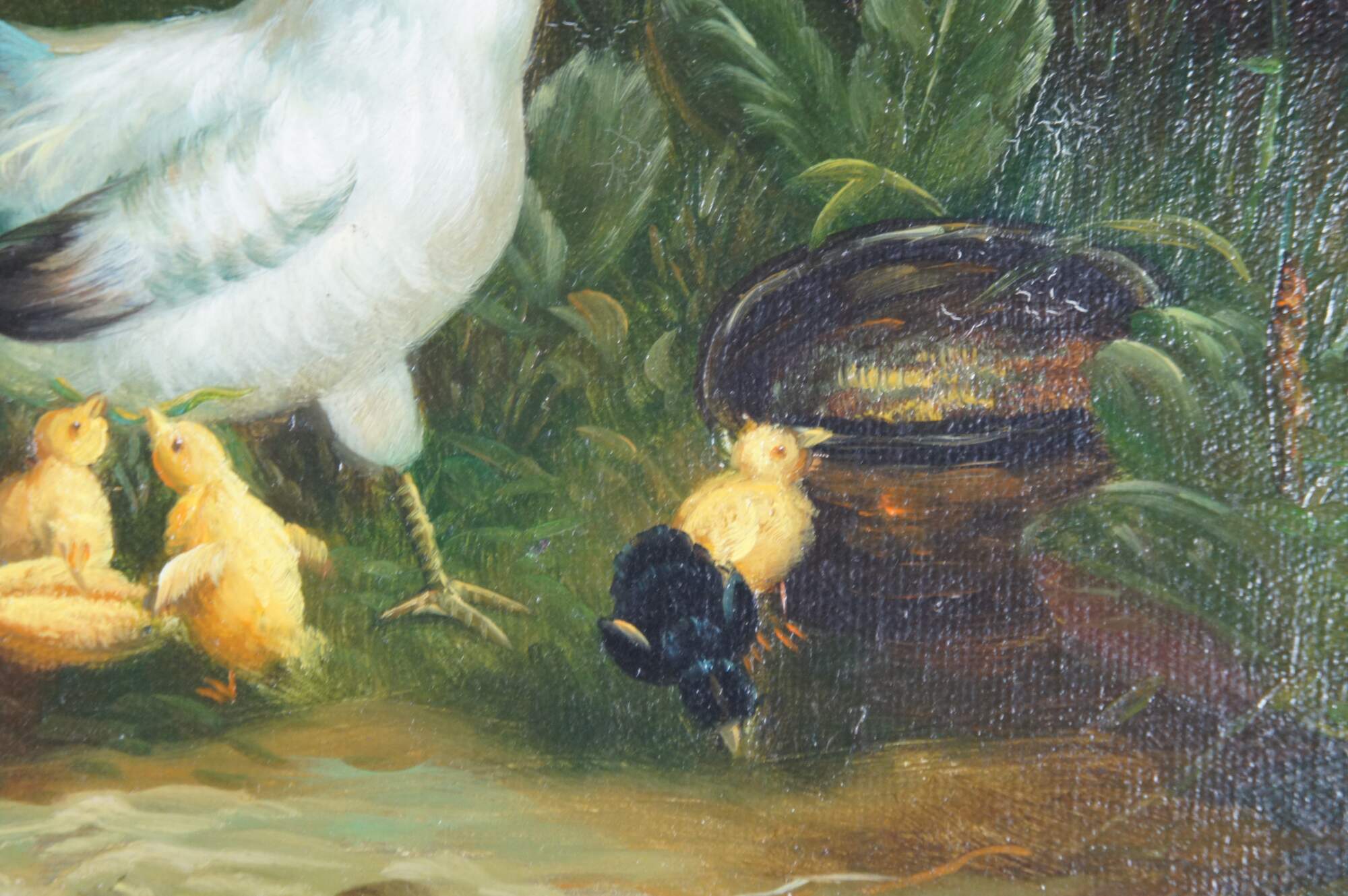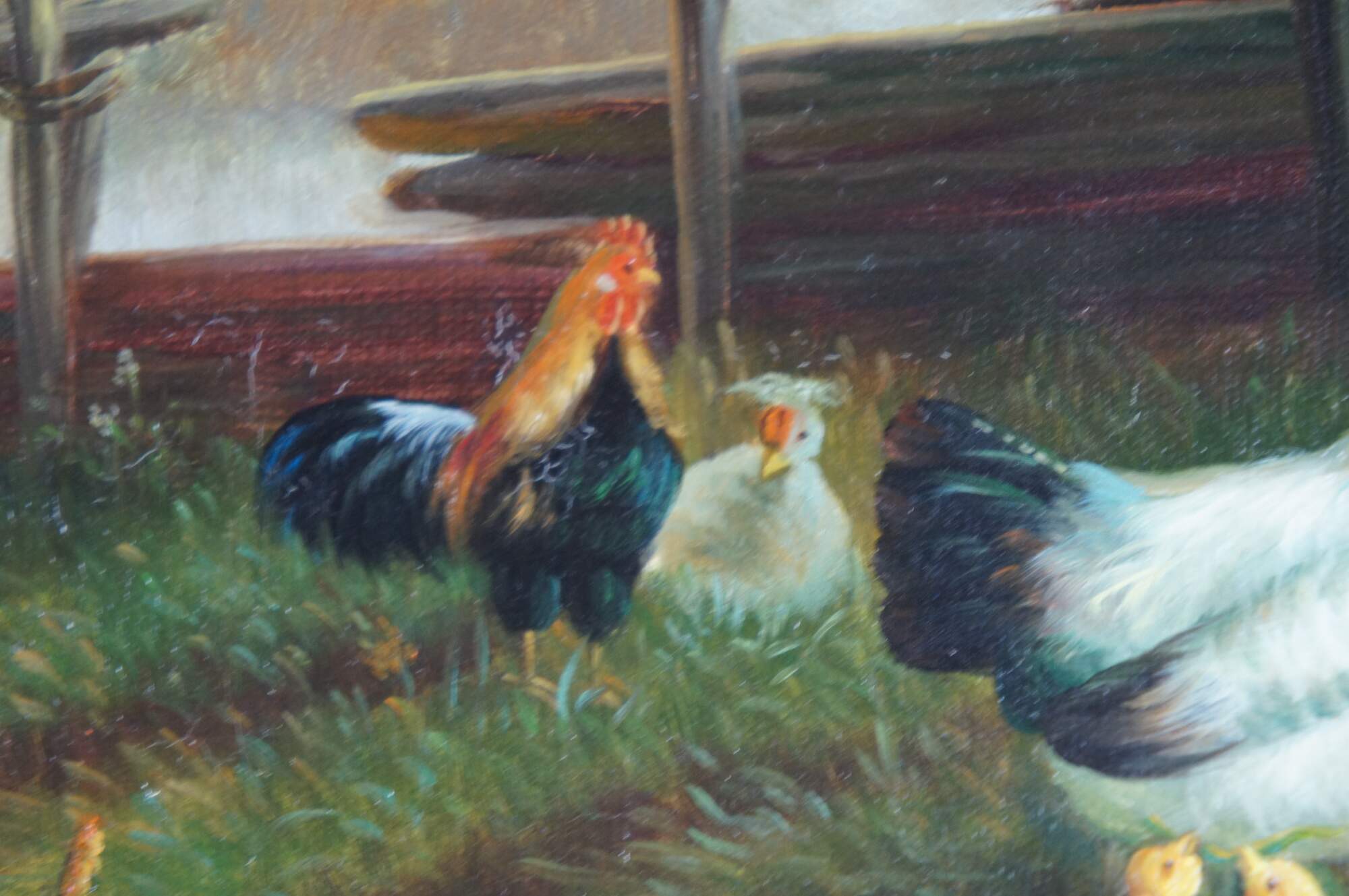 A farmhouse oil painting featuring roosters and chicks, circa the last quarter of the 20th century. Signed along the left side, G. Winslow. The oil is on canvas and ornately framed in wood with a gold finish and leaf border.