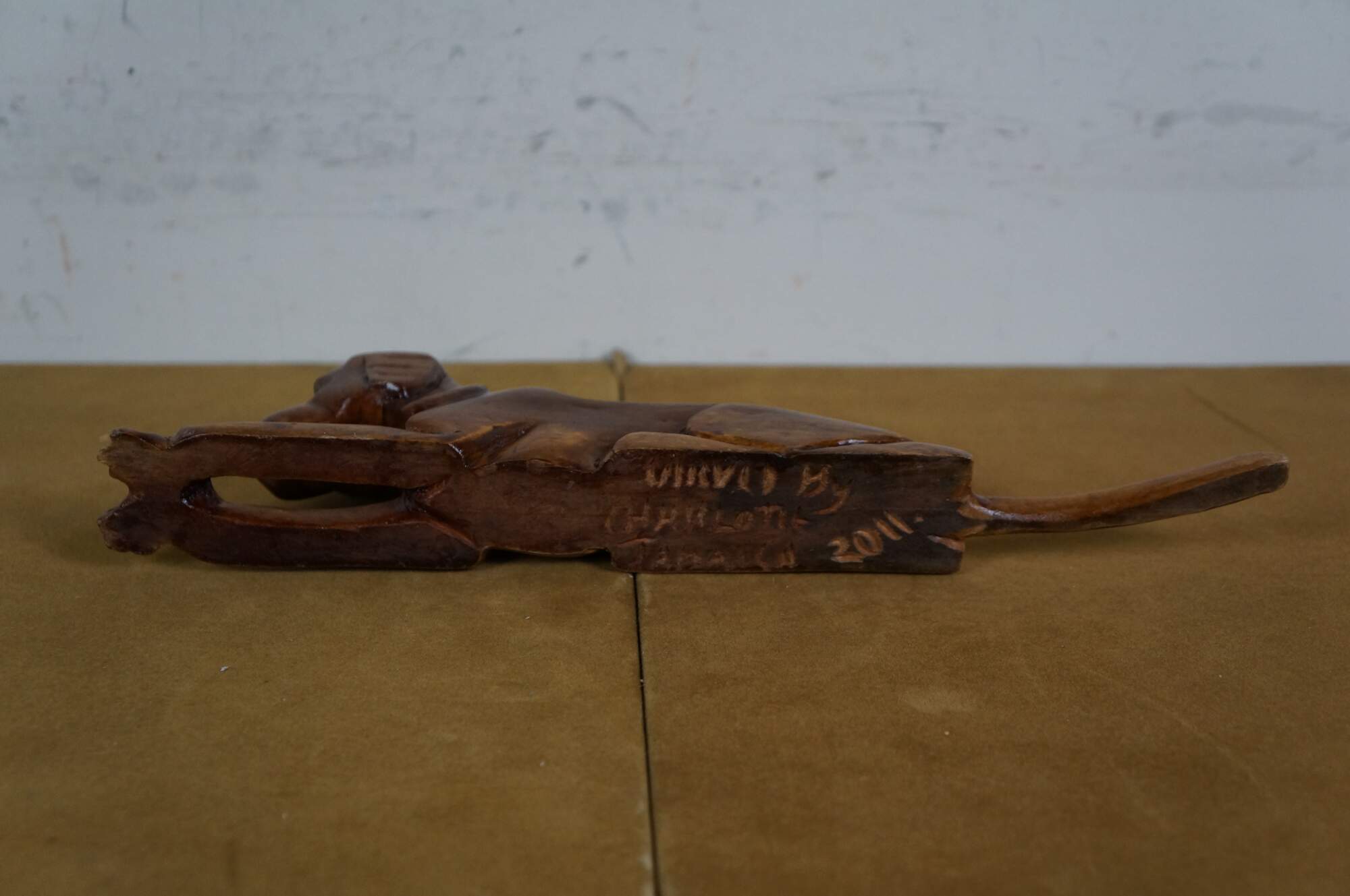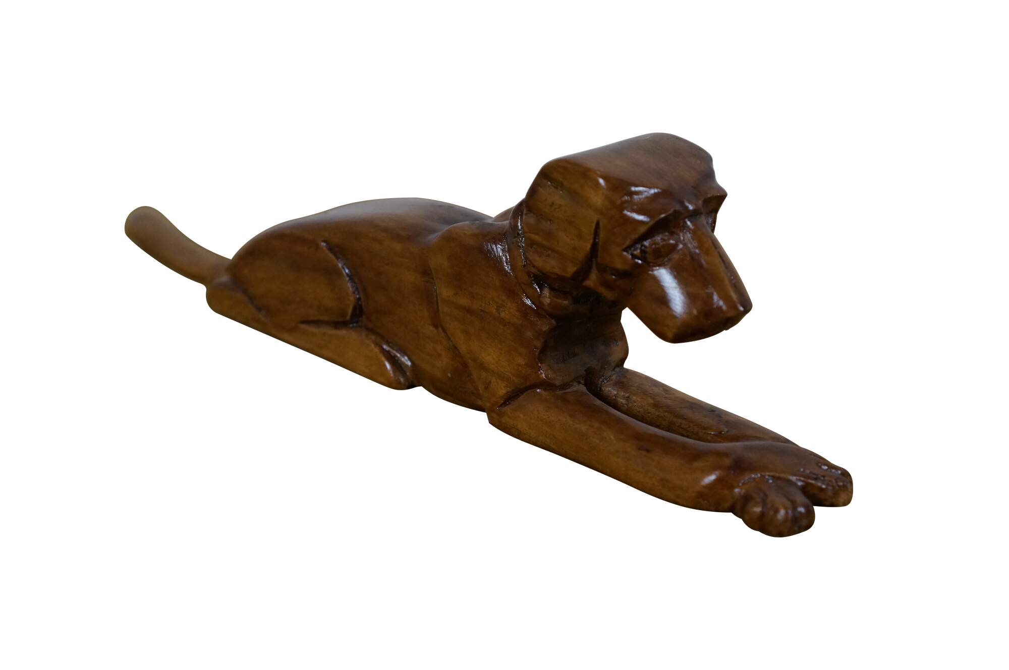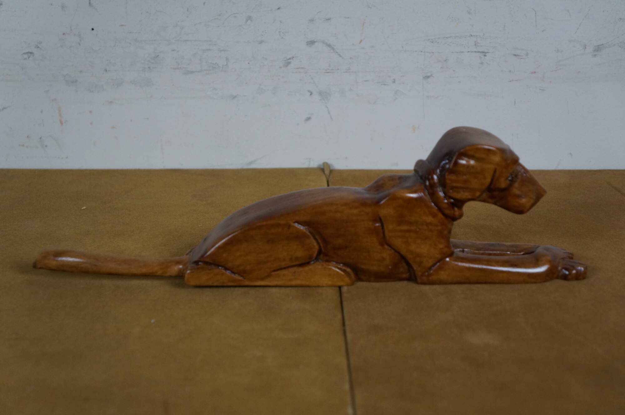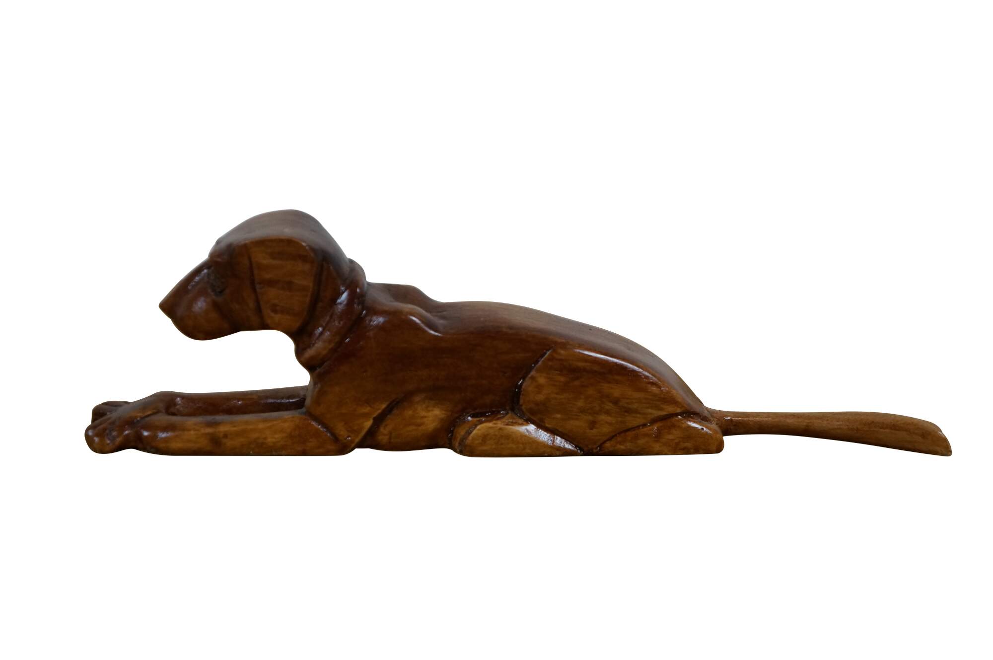 Hand carved hard wood figurine in the shape of reclinging hound dog. Signed "Carved by Charlotte, Jamaica, 2011.