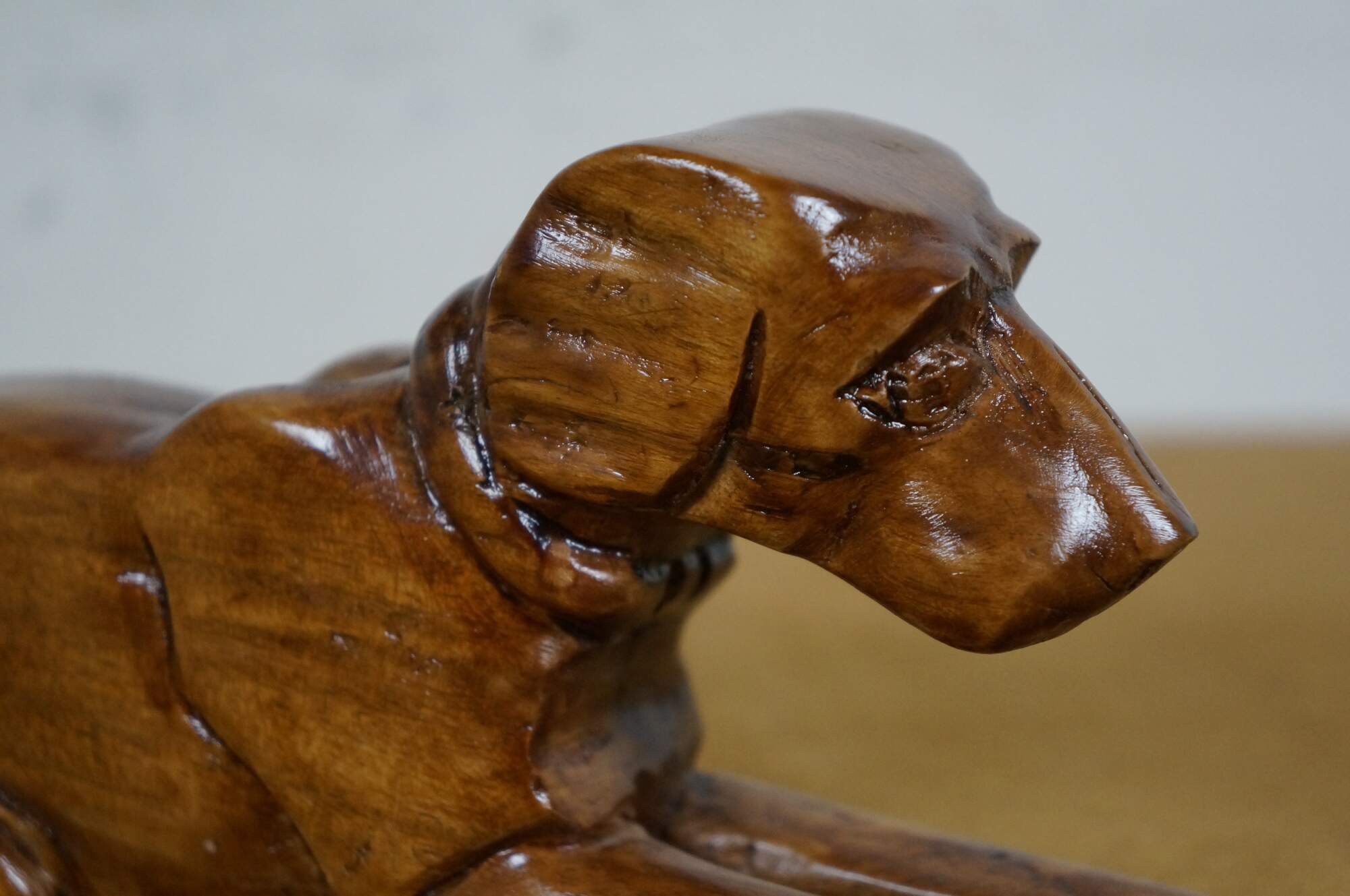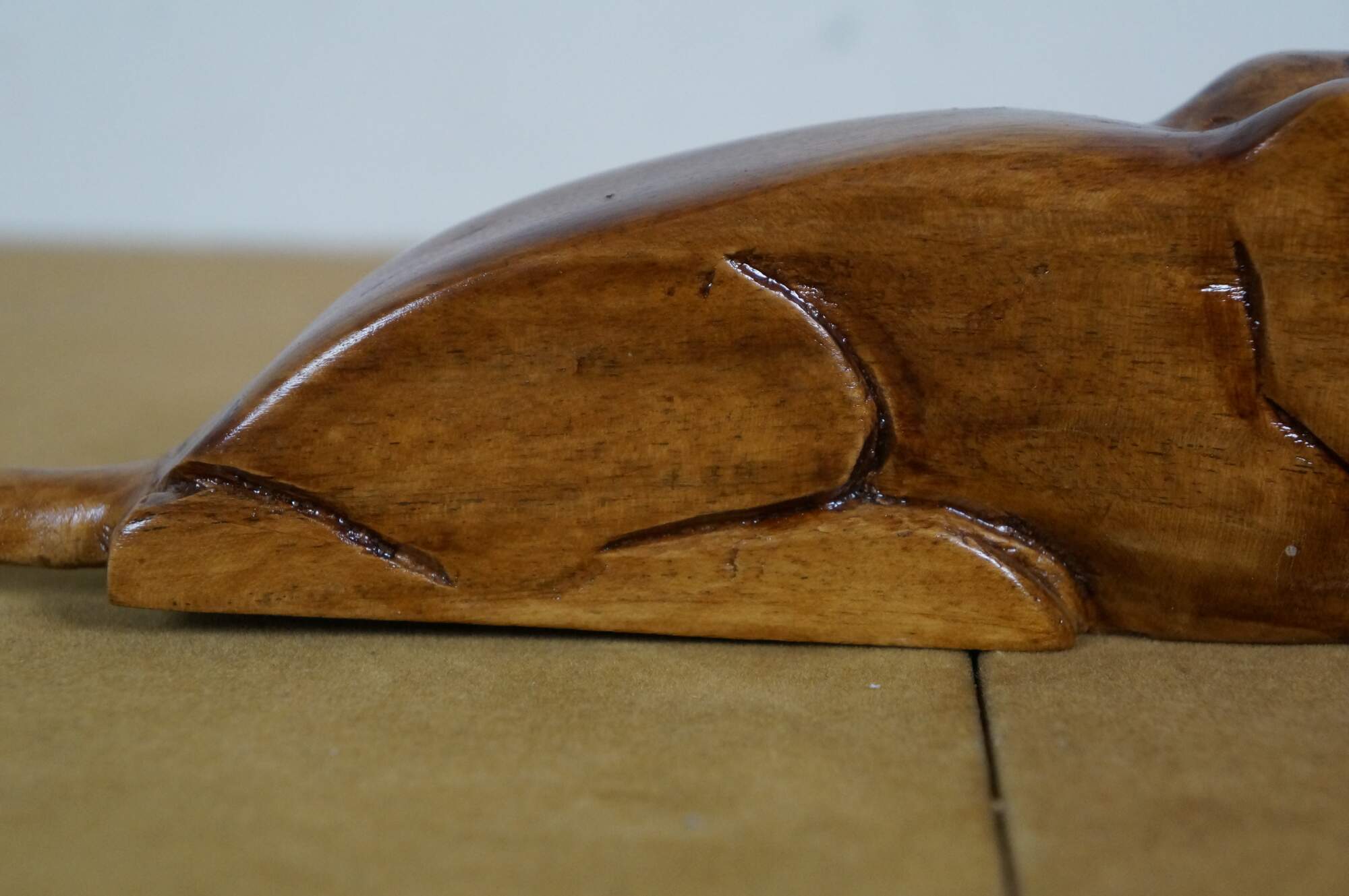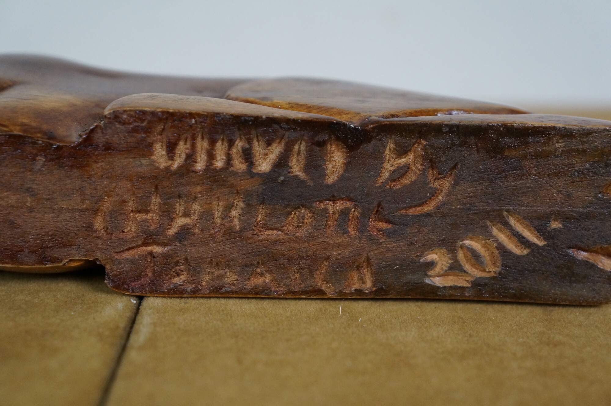 Hand carved hard wood figurine in the shape of reclinging hound dog. Signed "Carved by Charlotte, Jamaica, 2011.