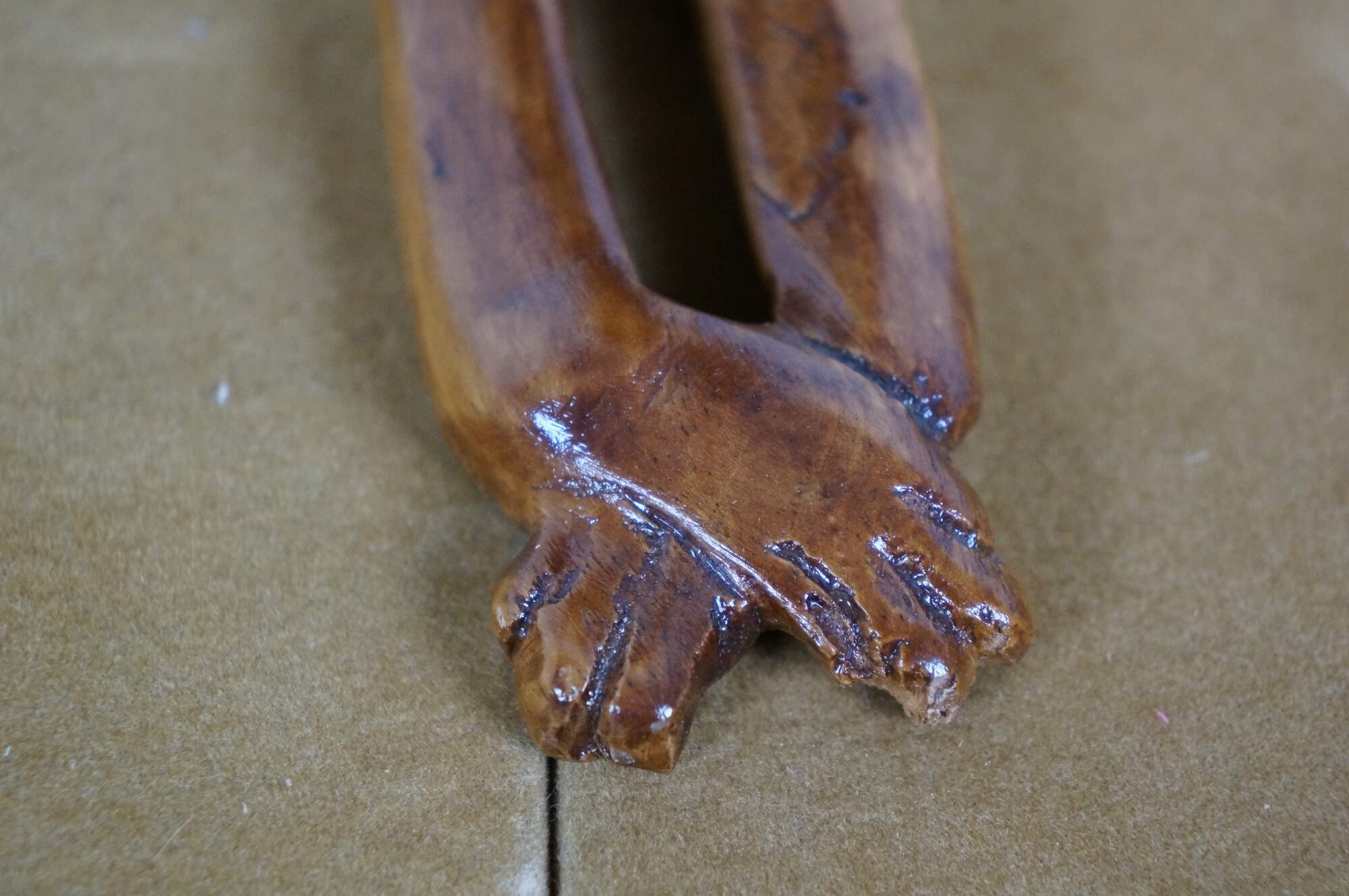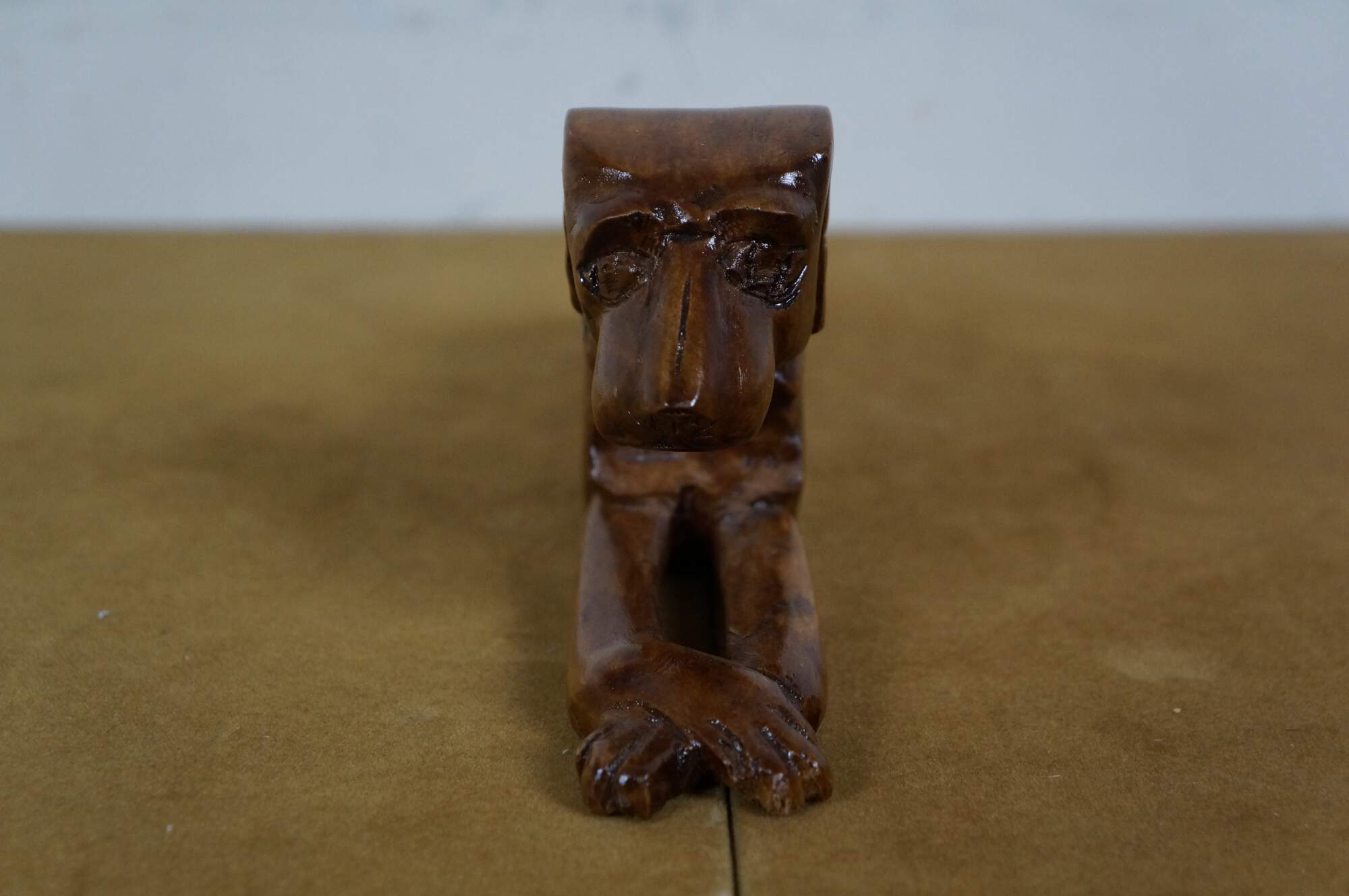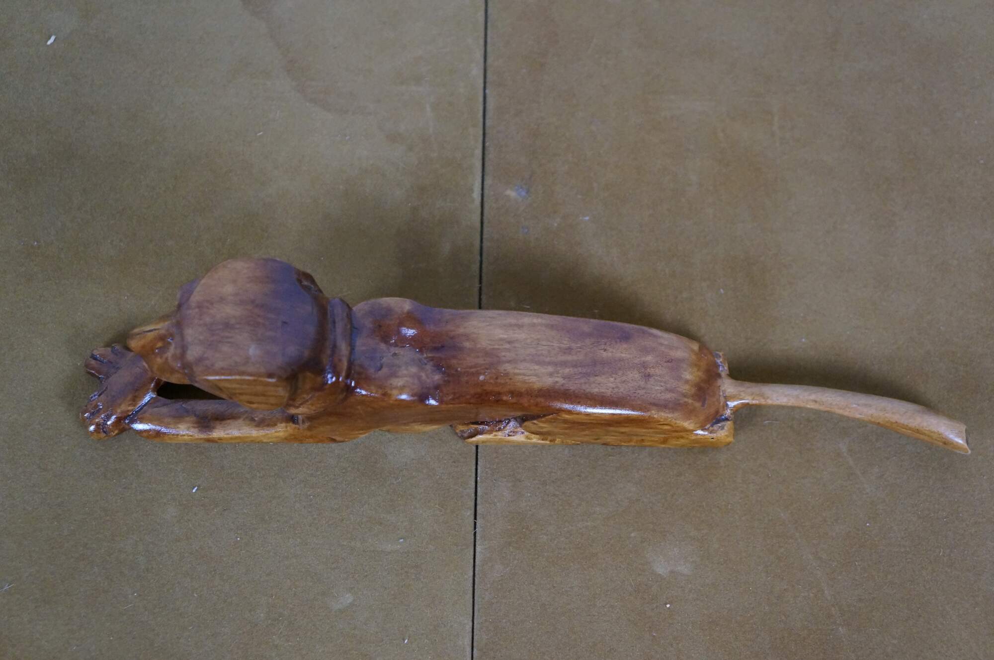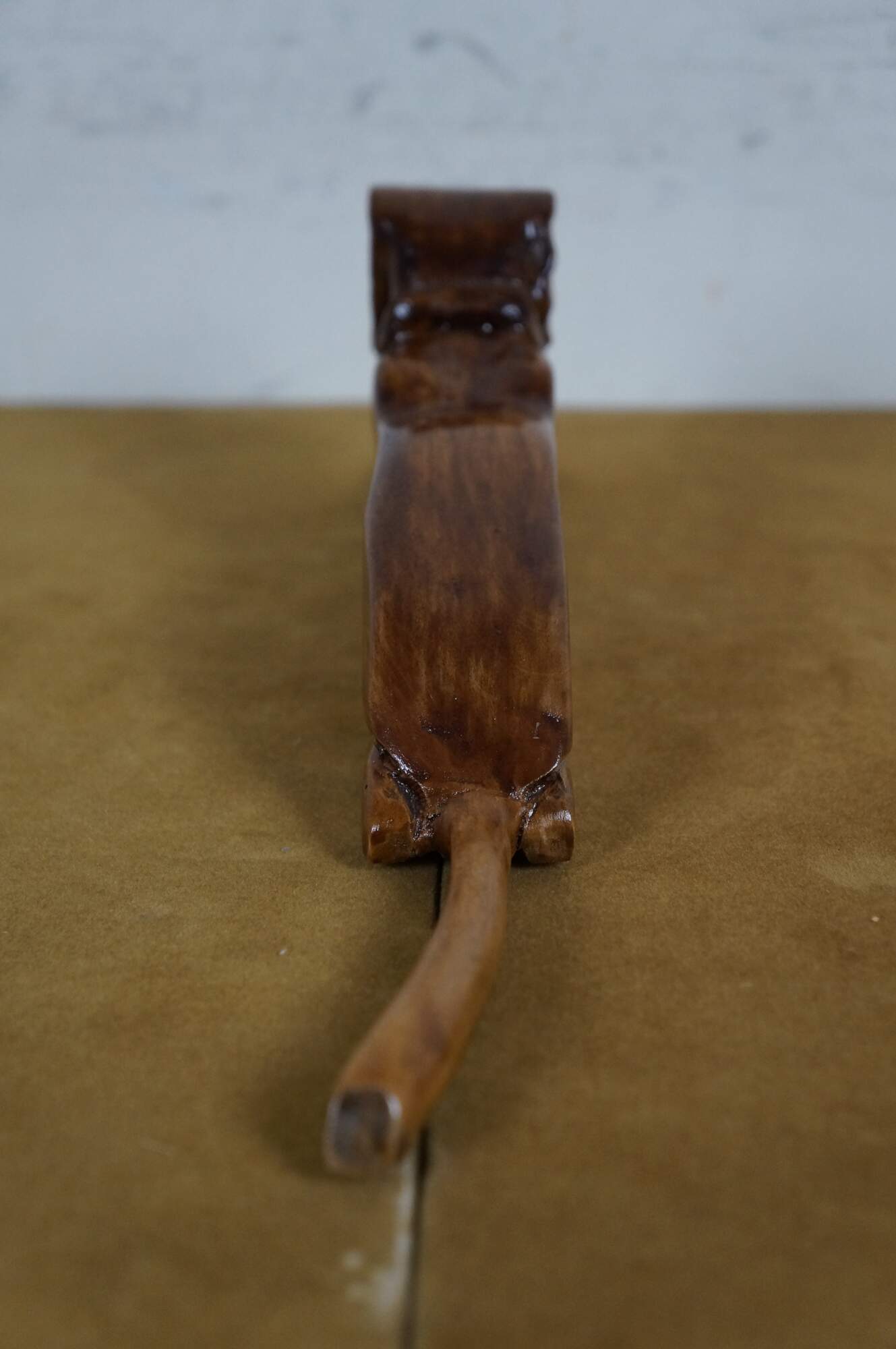 Hand carved hard wood figurine in the shape of reclinging hound dog. Signed "Carved by Charlotte, Jamaica, 2011.