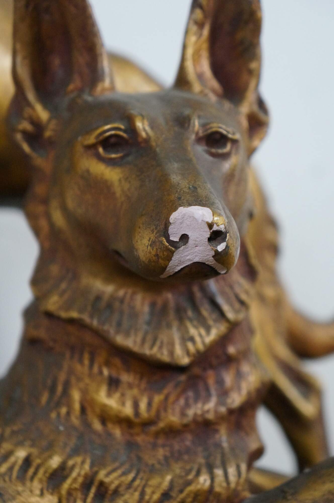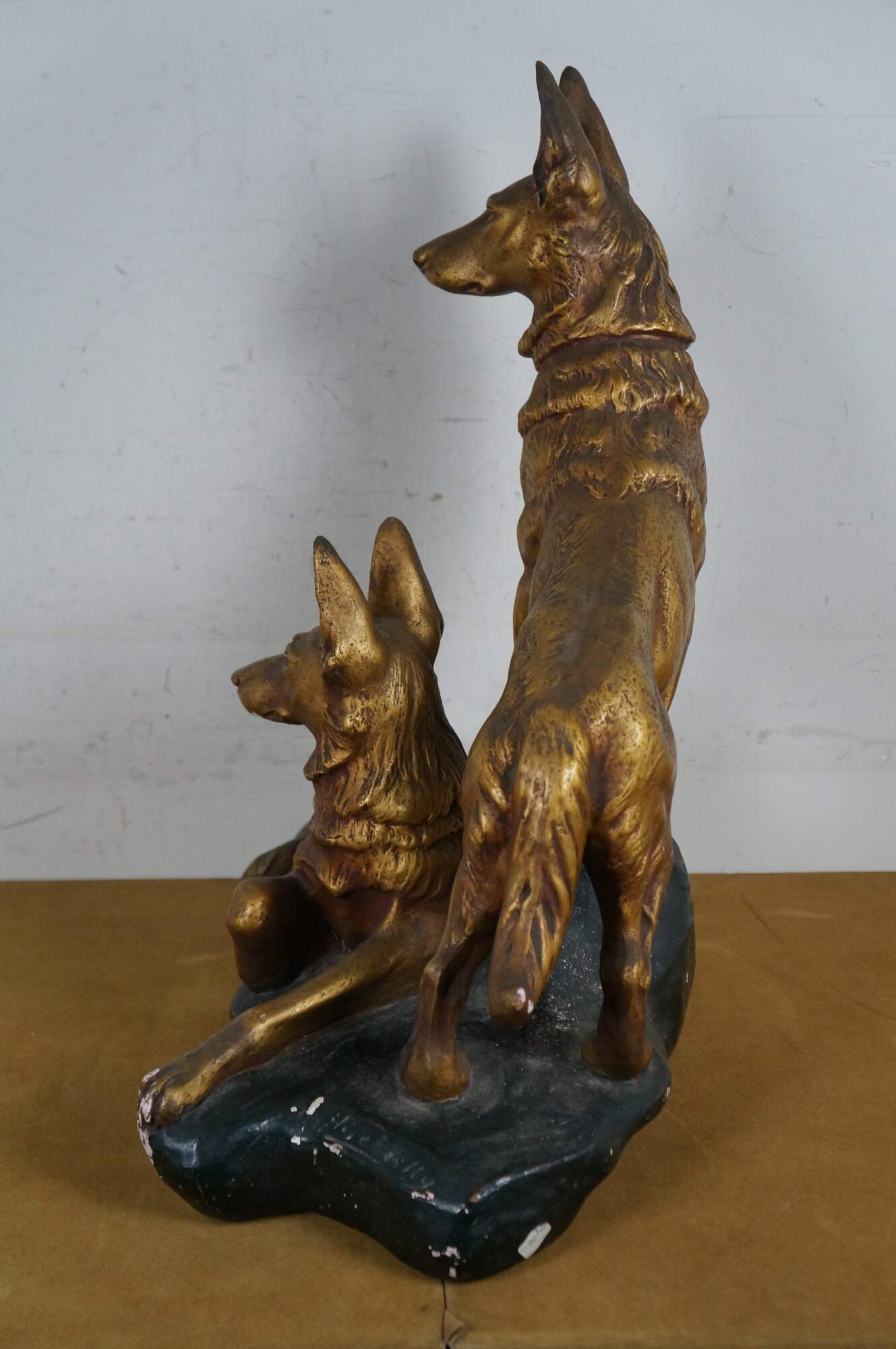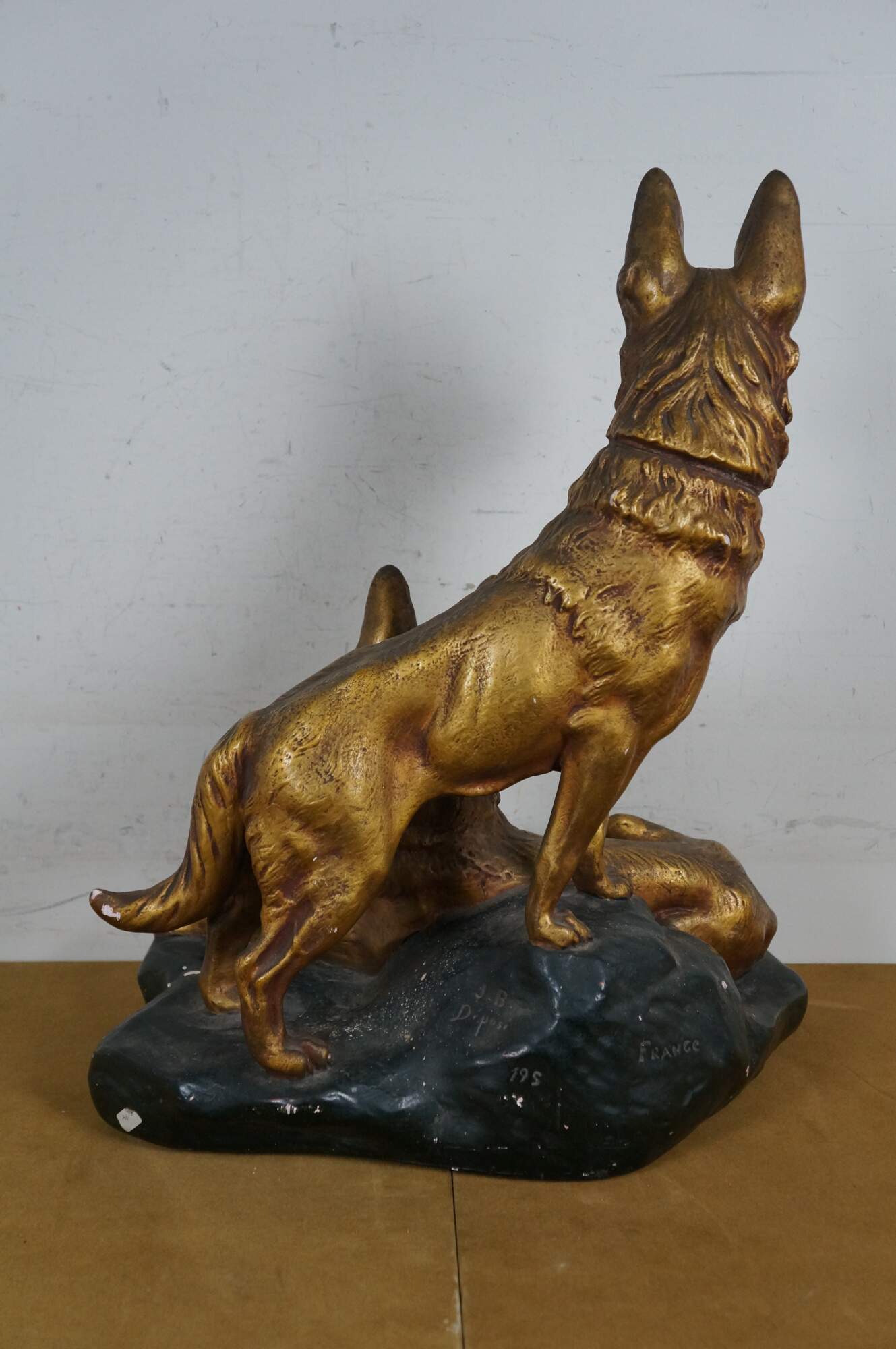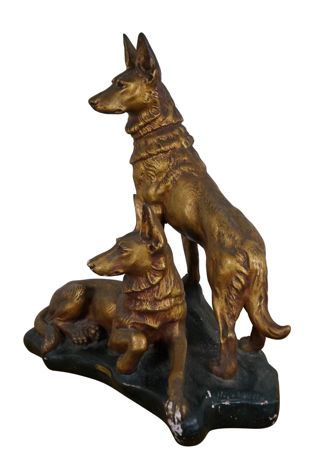 Vintage painted chalkware sculpture / statue depicting a pair of golden German Shepherds on a black stone shaped base, attributed to Aristide Petrilli. Brass plaque on front reads "Vigilance Par Petrilly." Marked "J.B. Depose 195 France" and "H. Petrilly" on side of base.