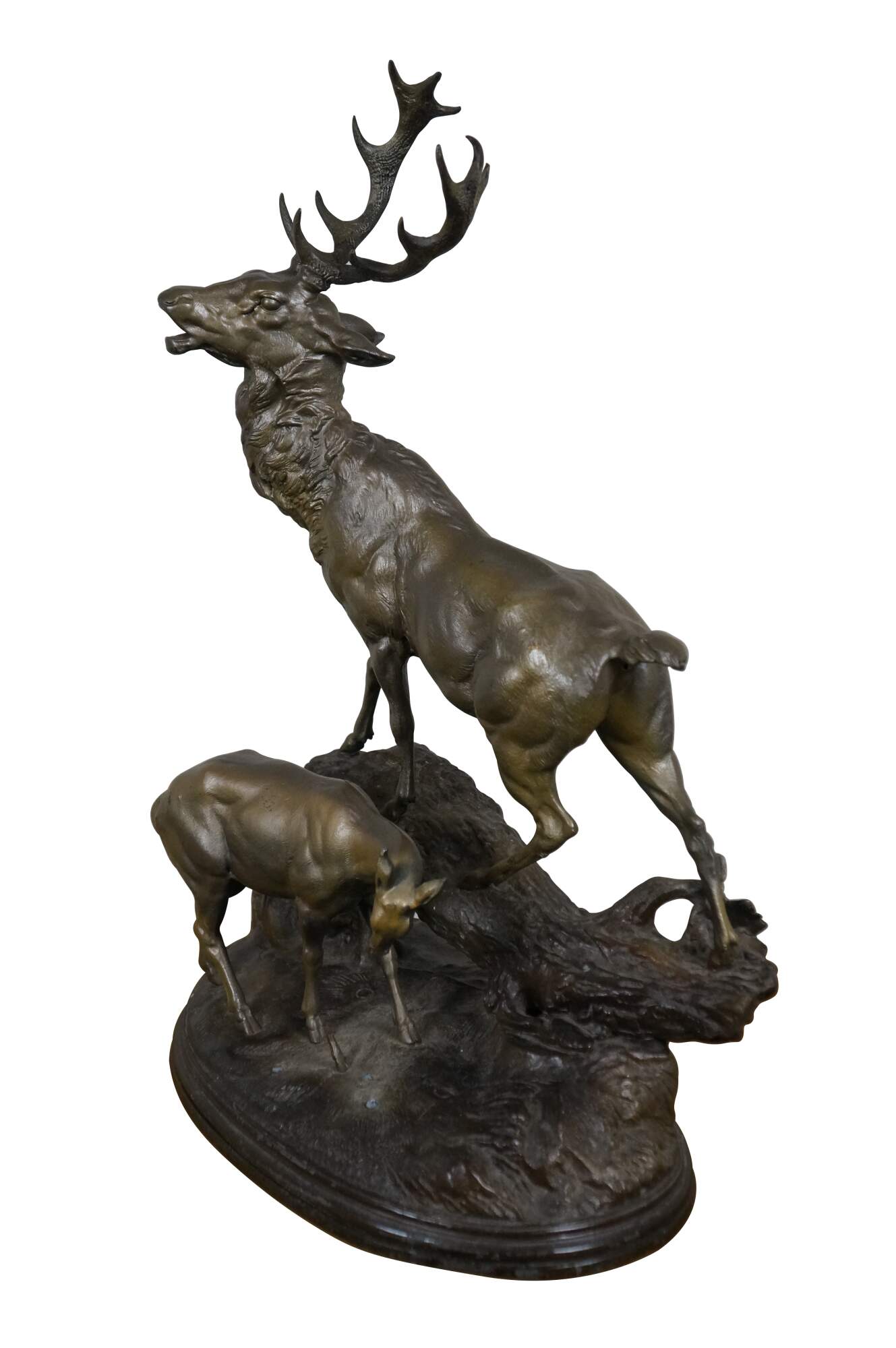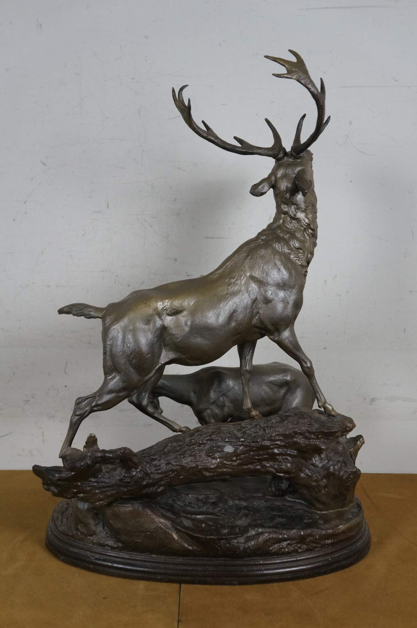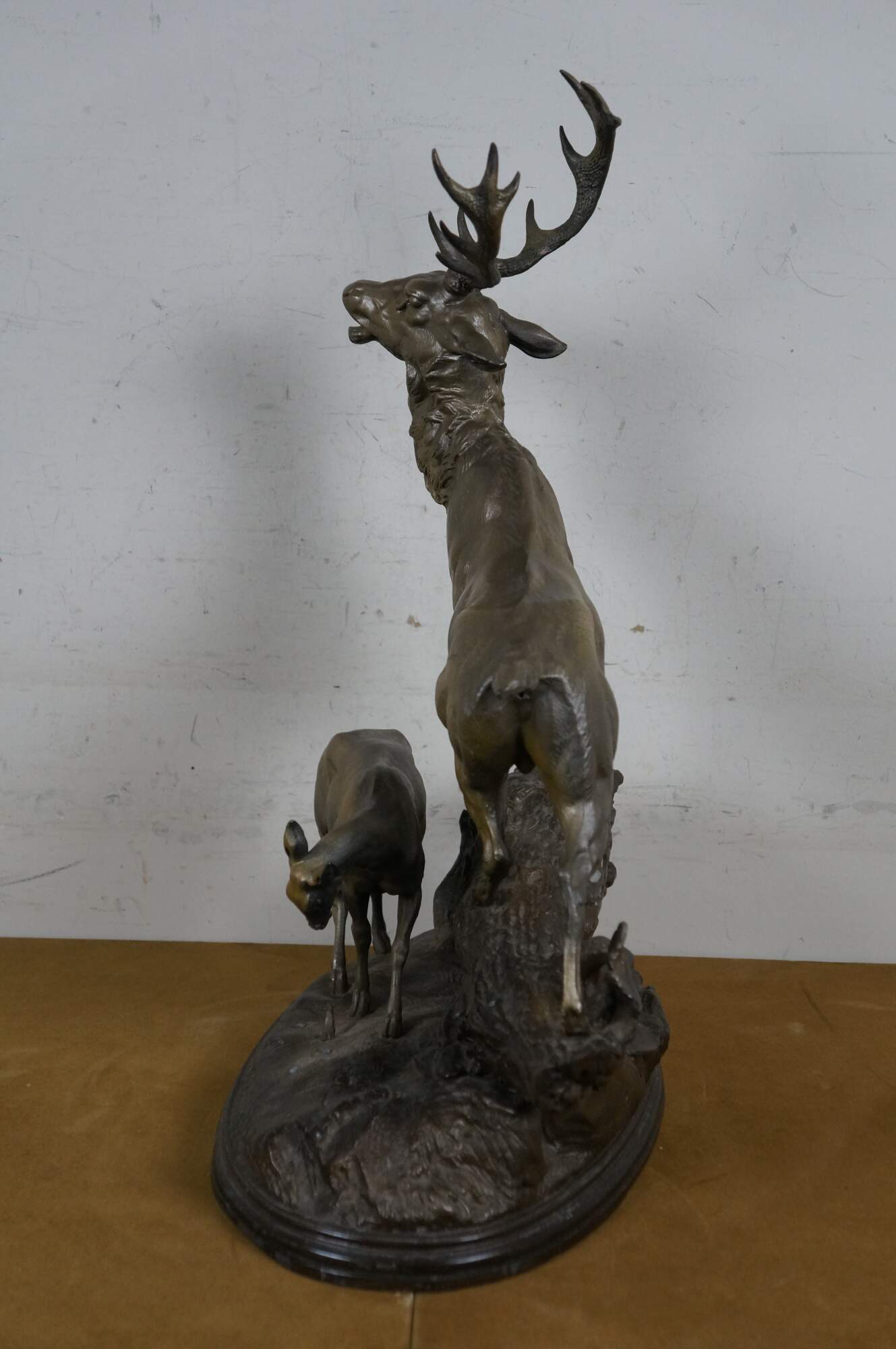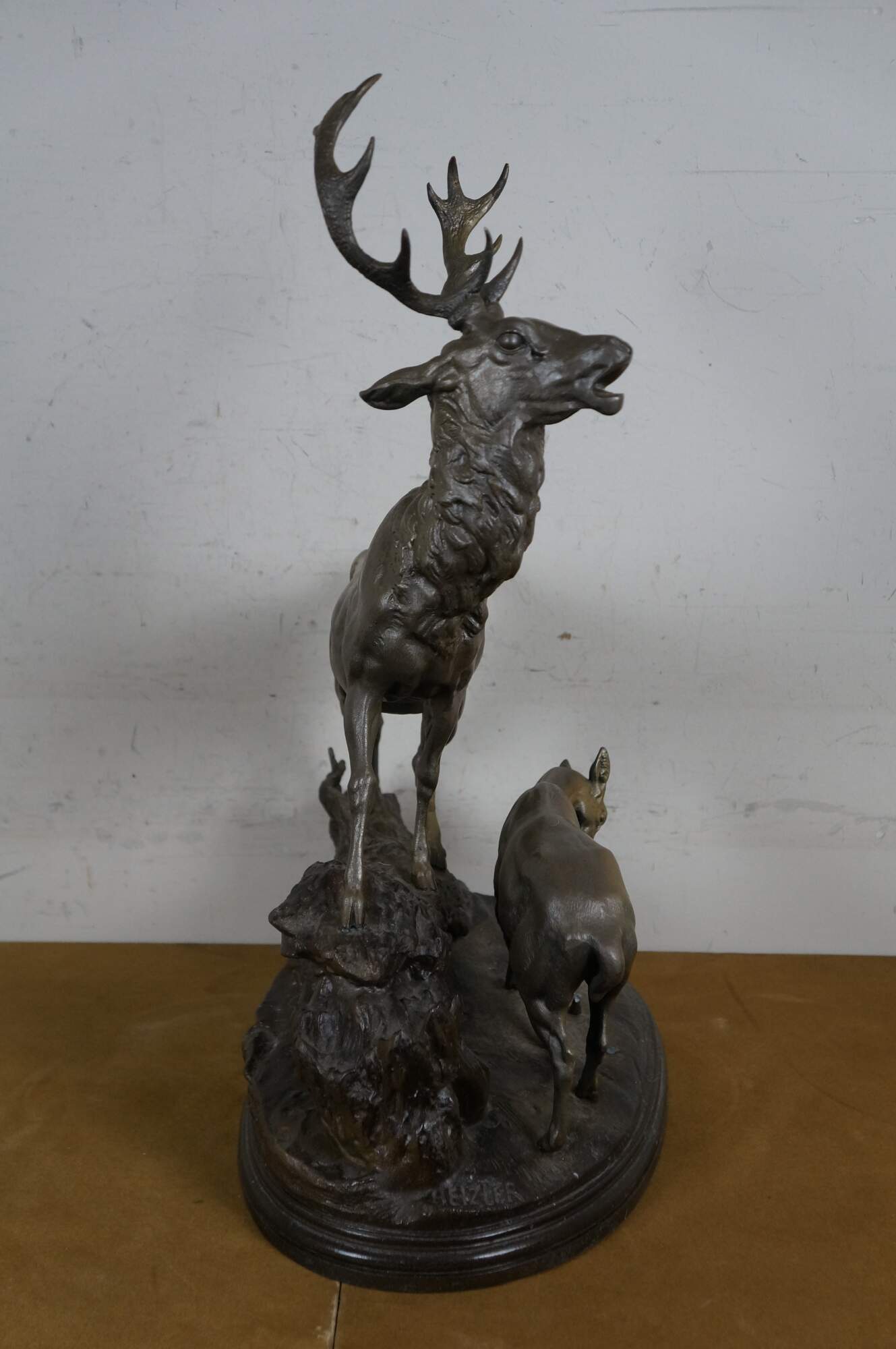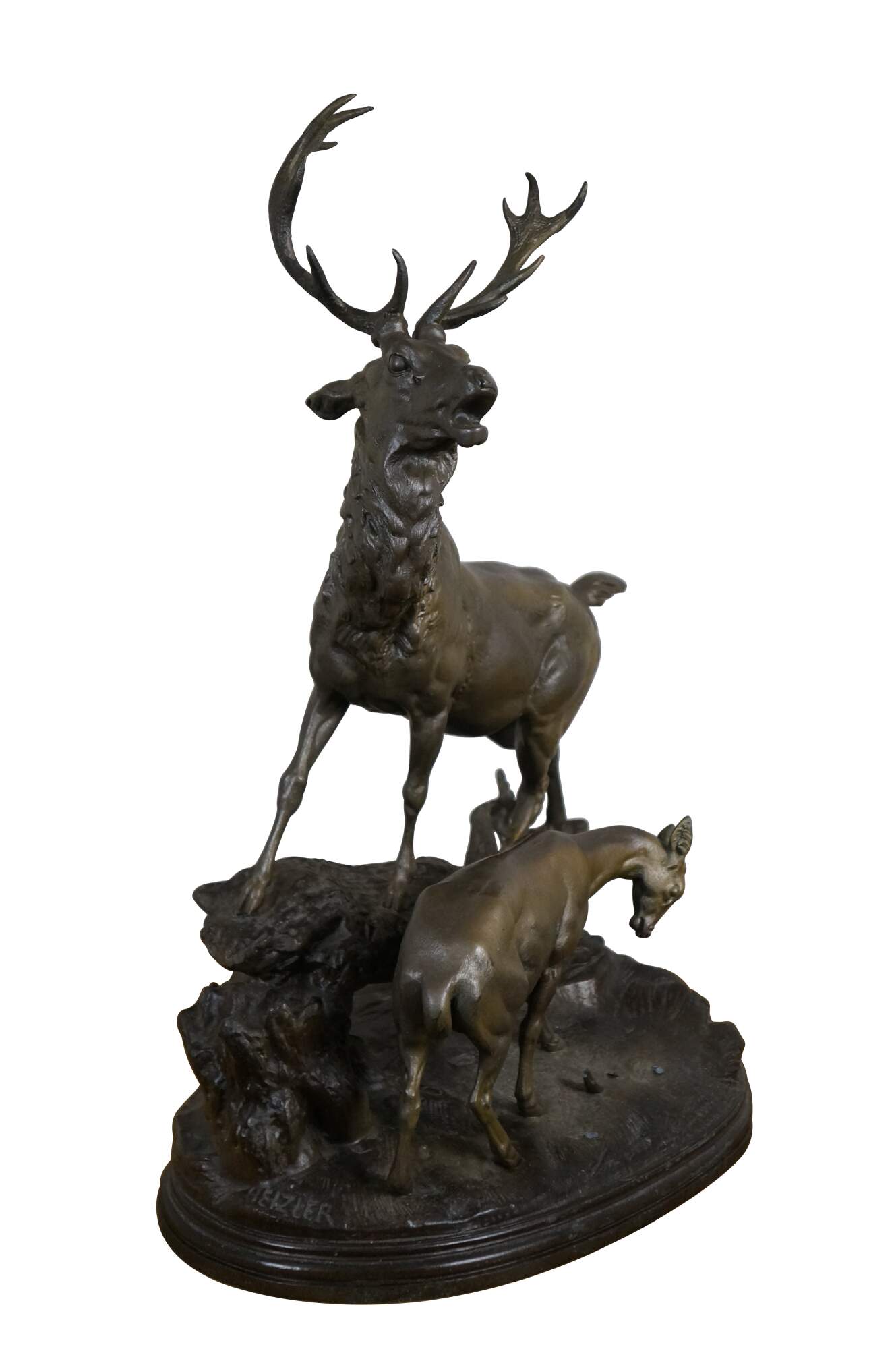 French cast metal sculpture depicting the Stag and his family / deer / elk after Hippolyte Heizler (1828-1871). Marked Heizler on side of base. Made in France.