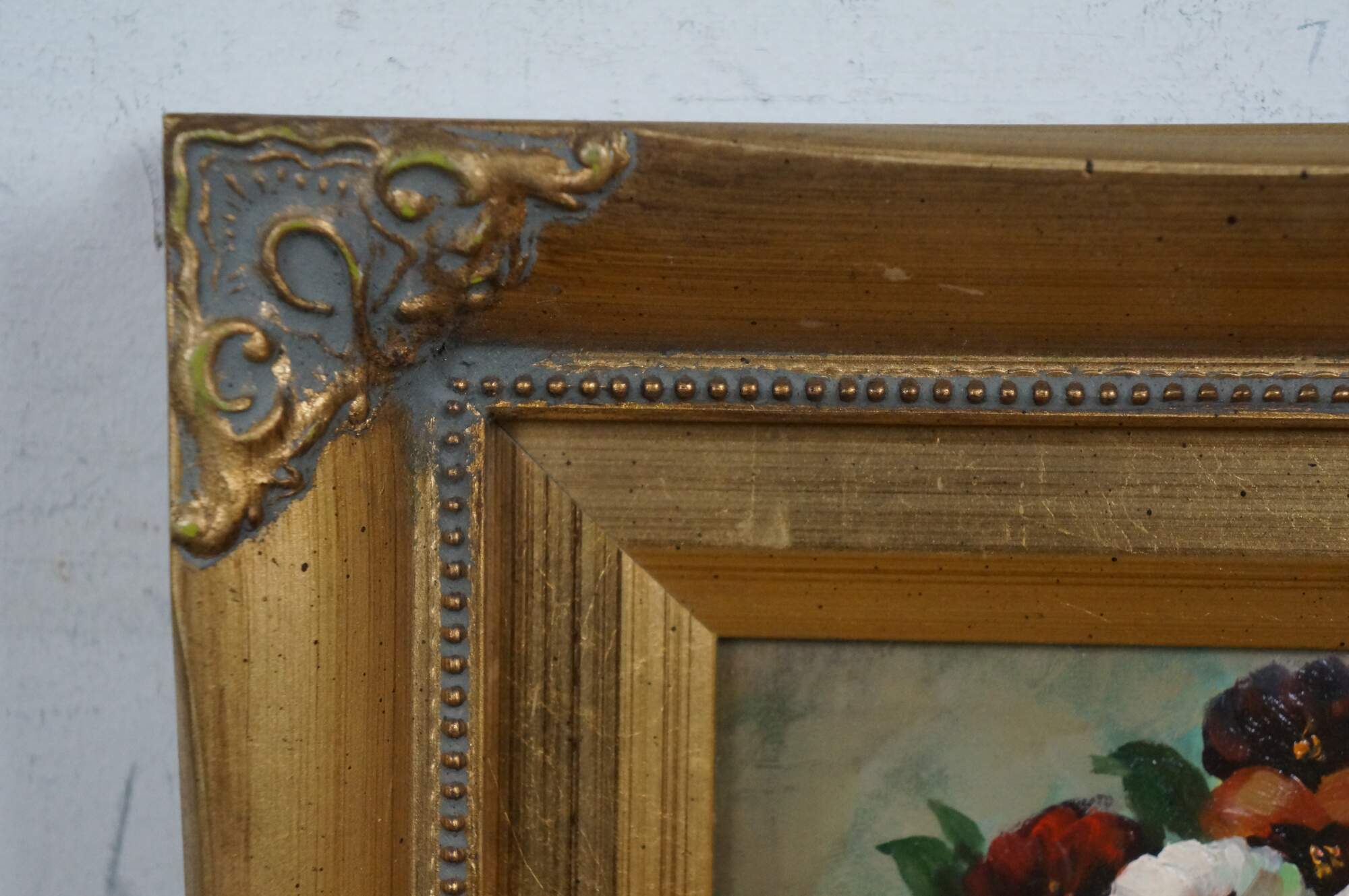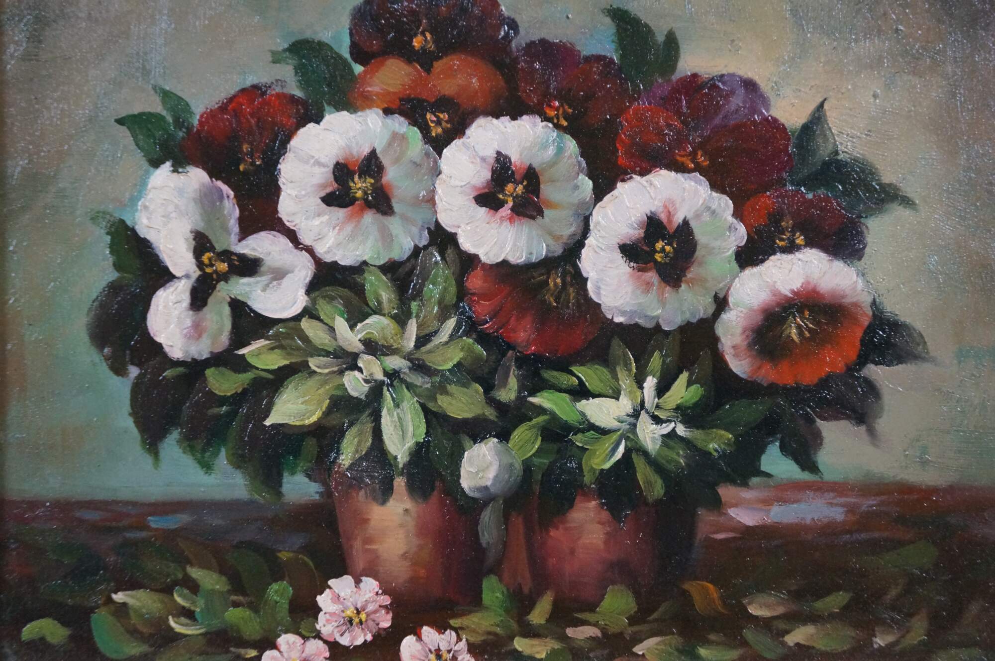 Late 20th century oil on board still life painting by Robert Grace depicting a pot full of white and red poppies. Beveled gilt wood frame with scalloped corners.