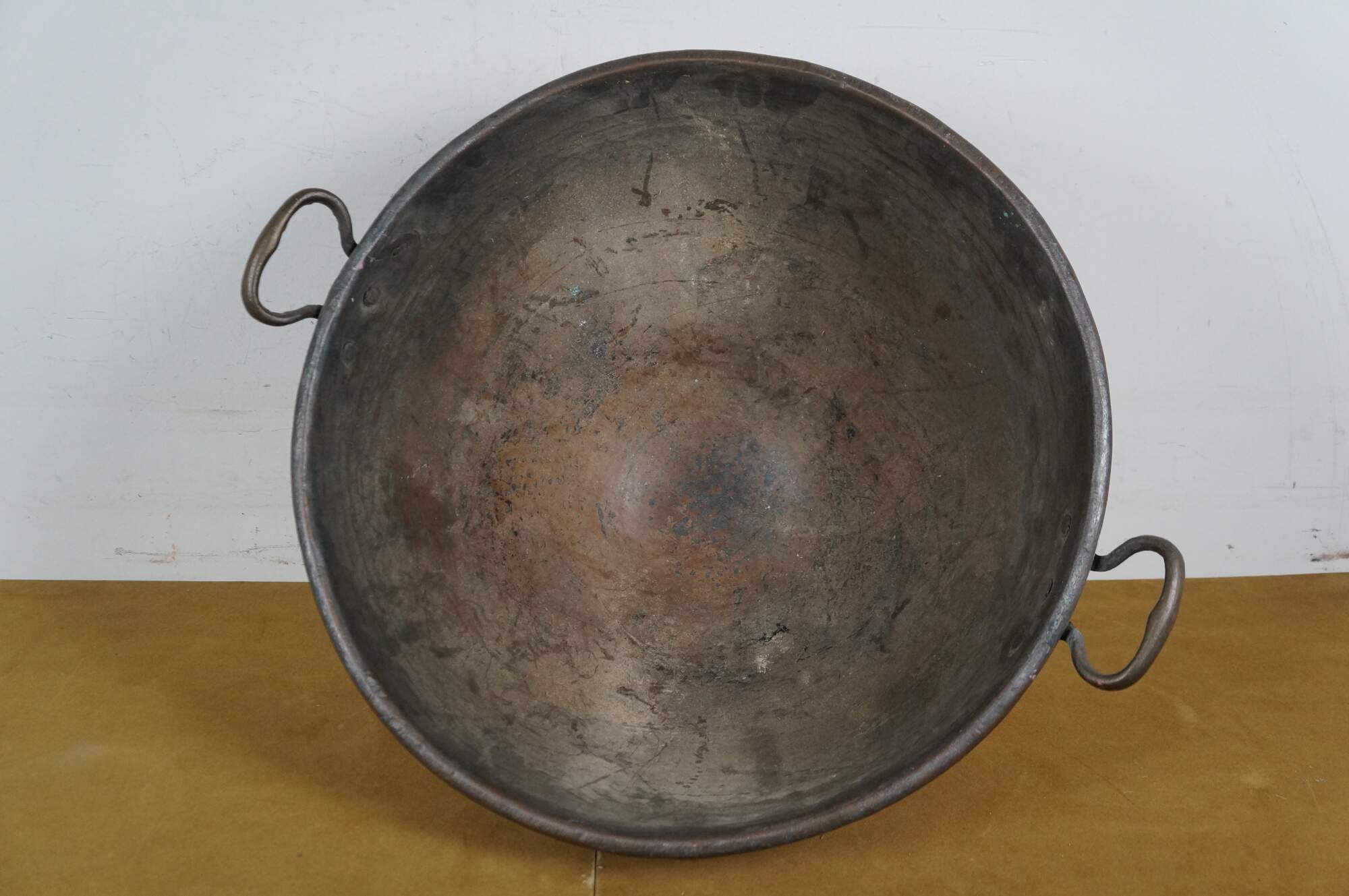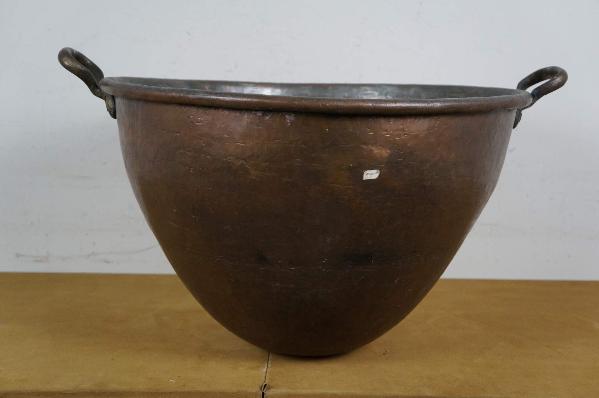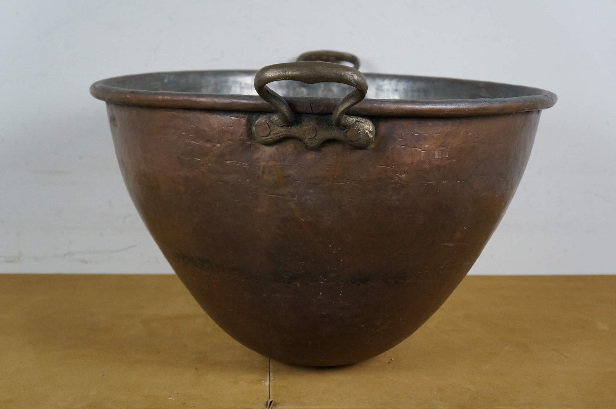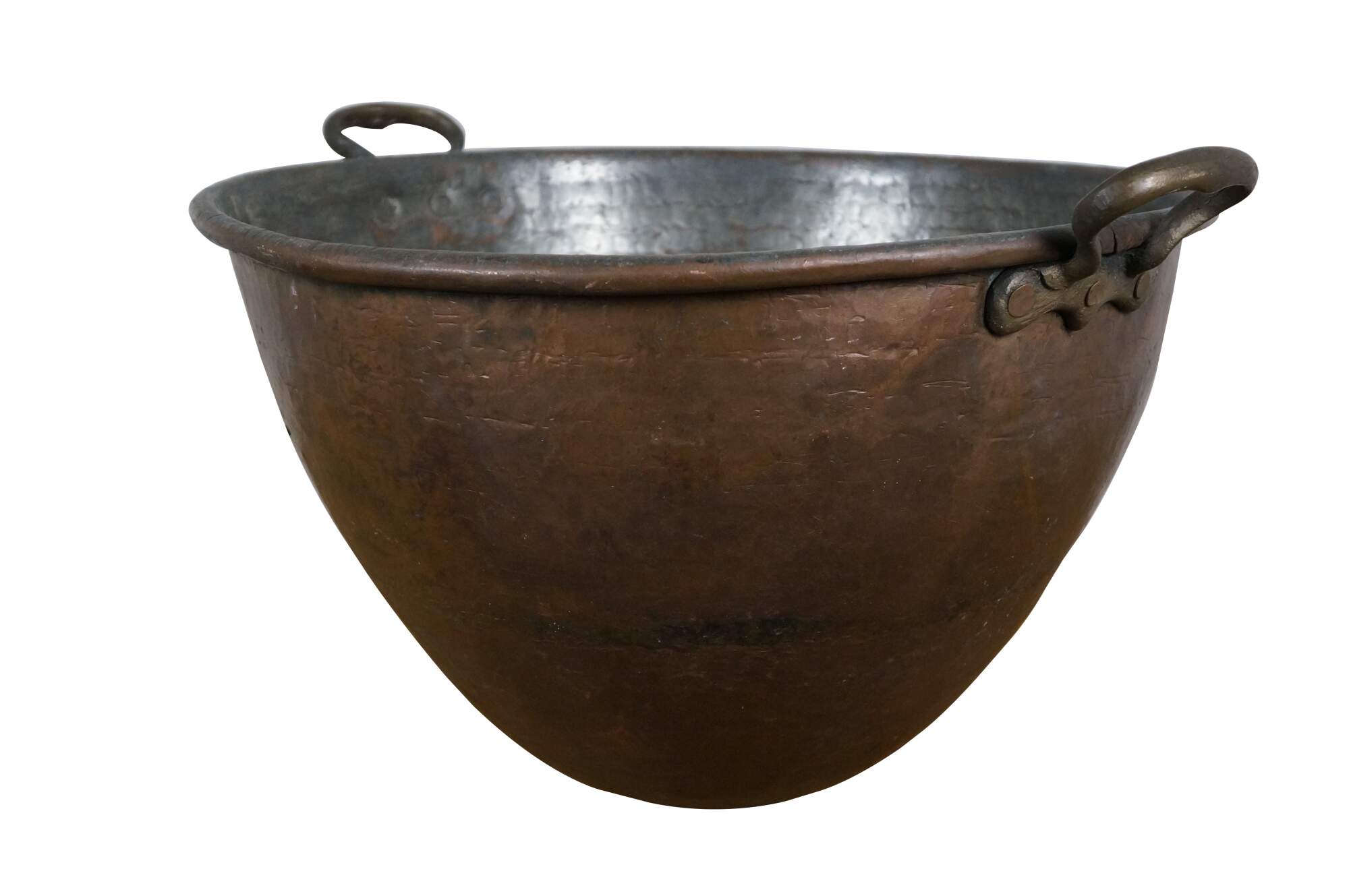 Large vintage 20th century hammered copper cauldron / cooking pot / candy kettle / fire pit featuring a tapered dovetailed body, rolled rim. and pair of fixed brass handles. Made in Turkey.