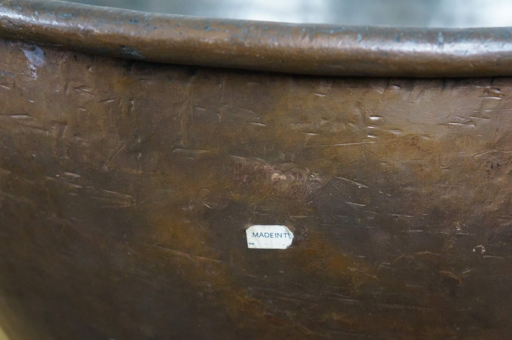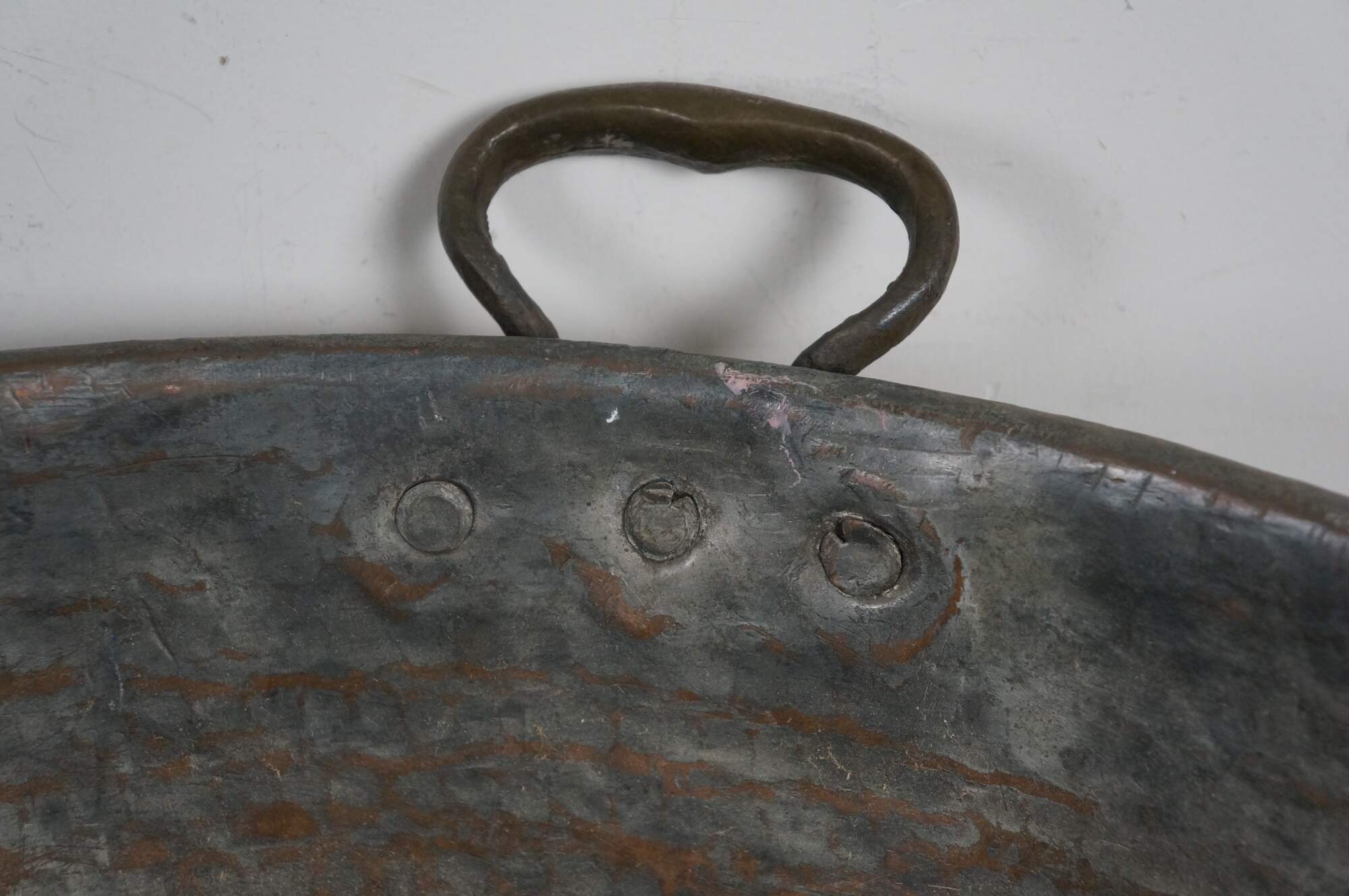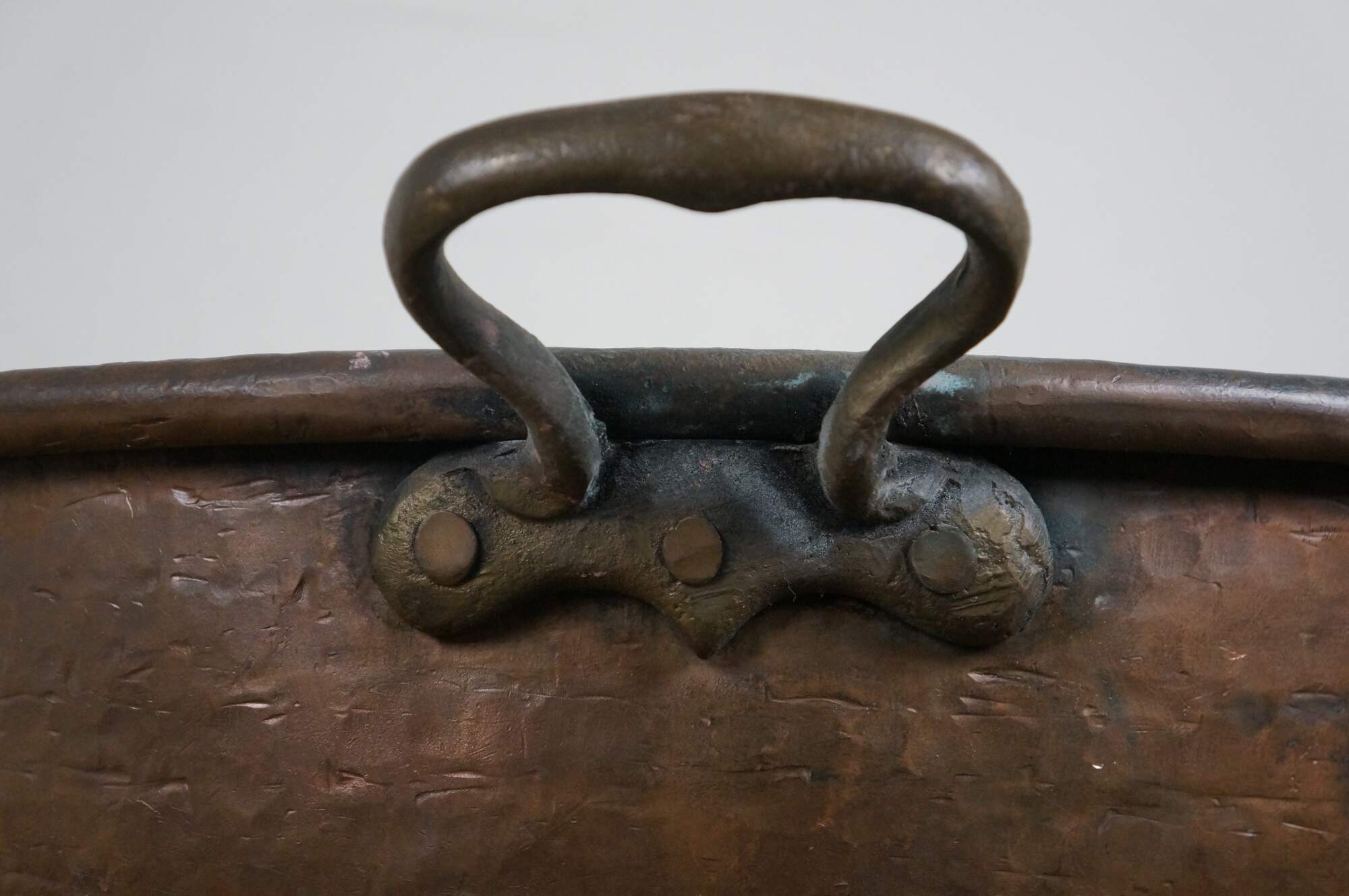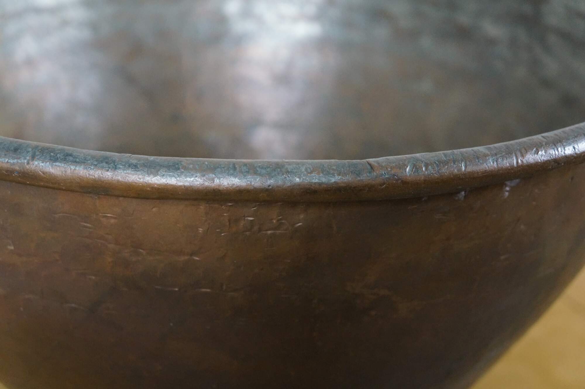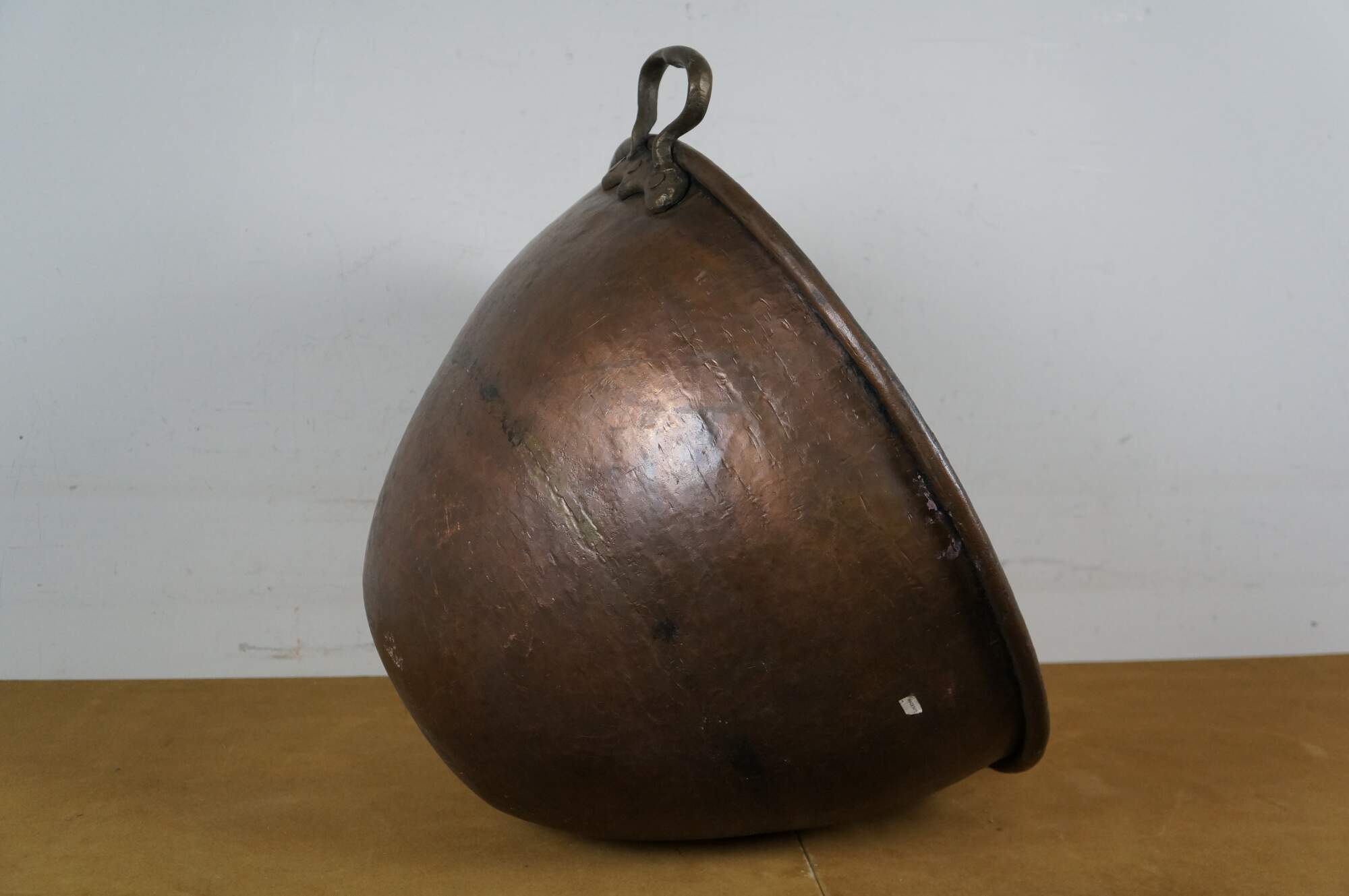 Large vintage 20th century hammered copper cauldron / cooking pot / candy kettle / fire pit featuring a tapered dovetailed body, rolled rim. and pair of fixed brass handles. Made in Turkey.