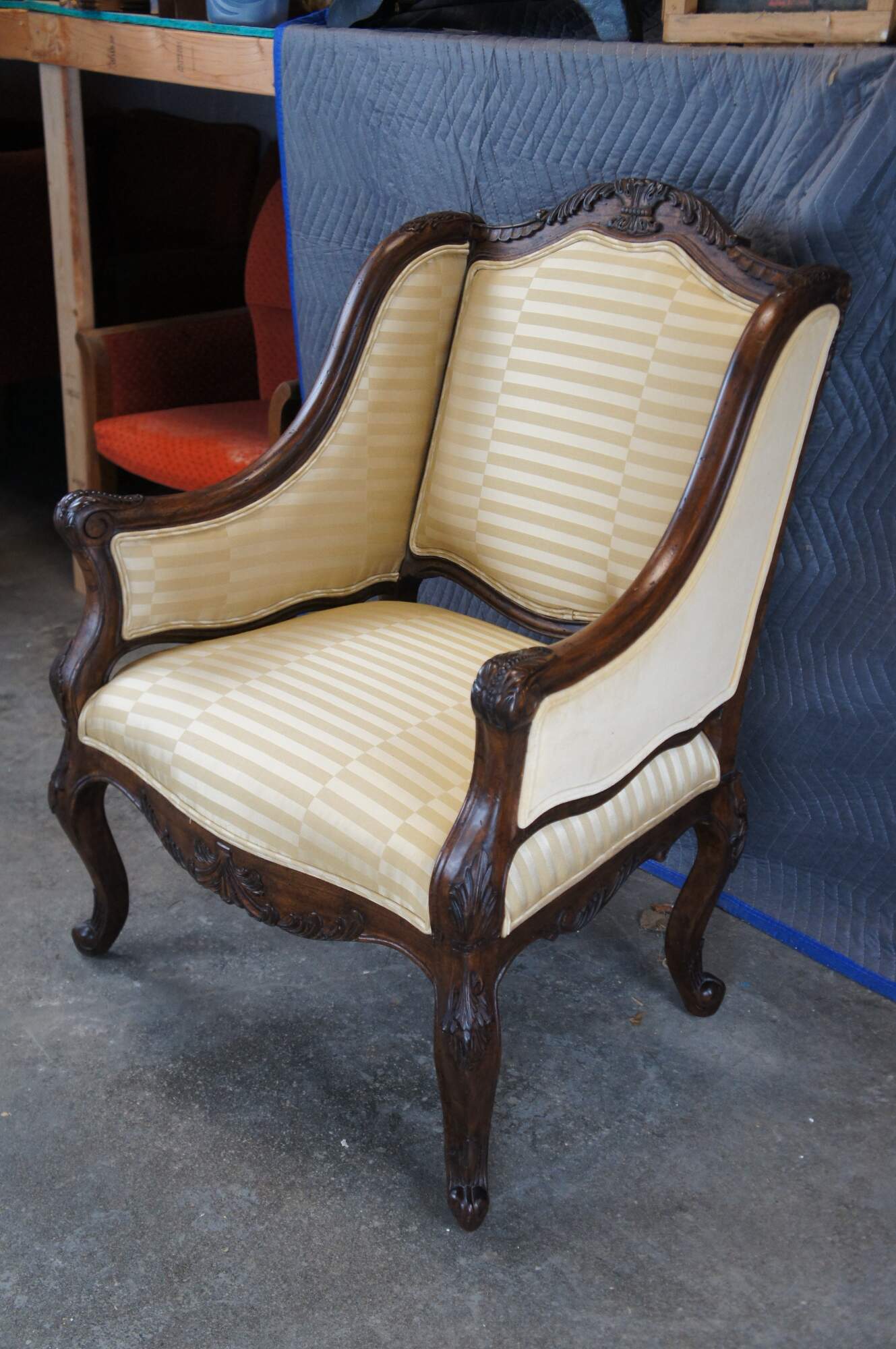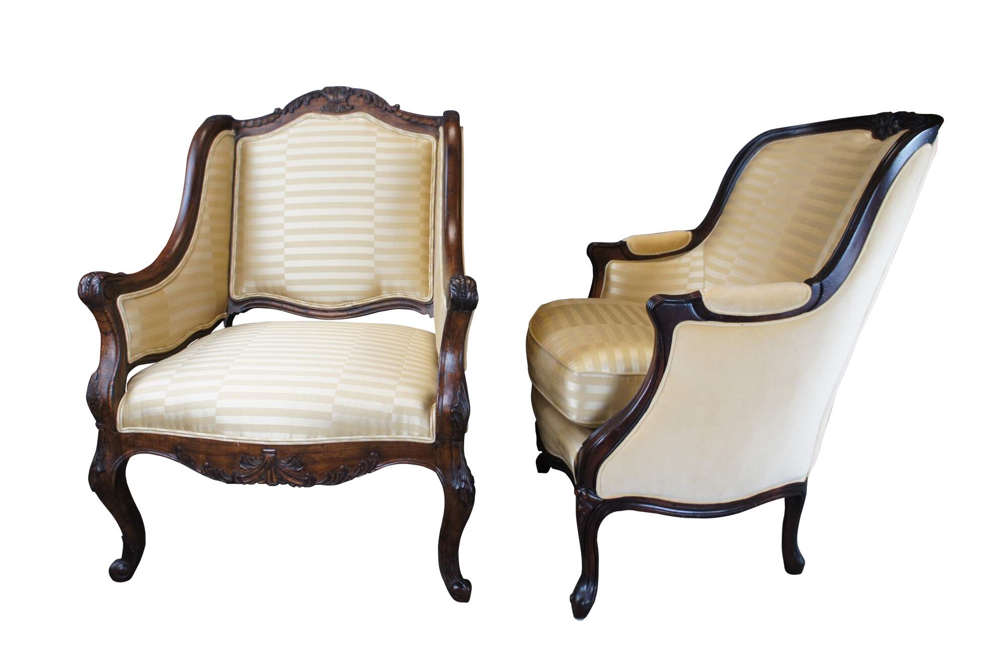 Vintage pair of arm chairs by Hancock & Moore's Balfour collection and John Richardss Alexander and Mary collection. Both chairs feature French Louis XVI styling and gold geometric stripe fabric. The Balfour club / lounge / library chair features a Bergere and fauteuil design with carved floral details. The Alexander and Mary armchair features carved acanthus accents and cabriole legs.
