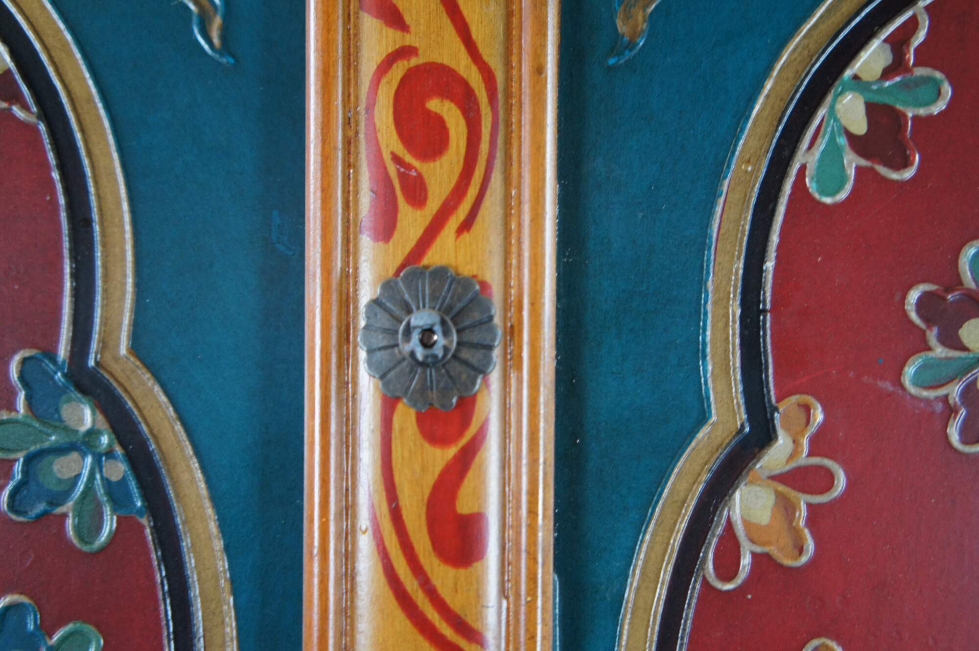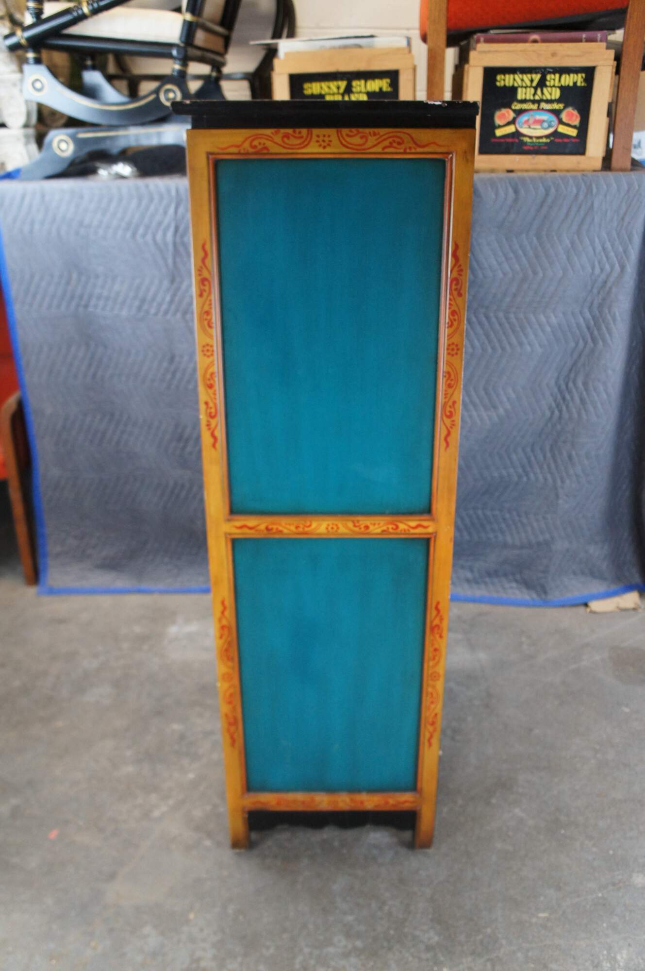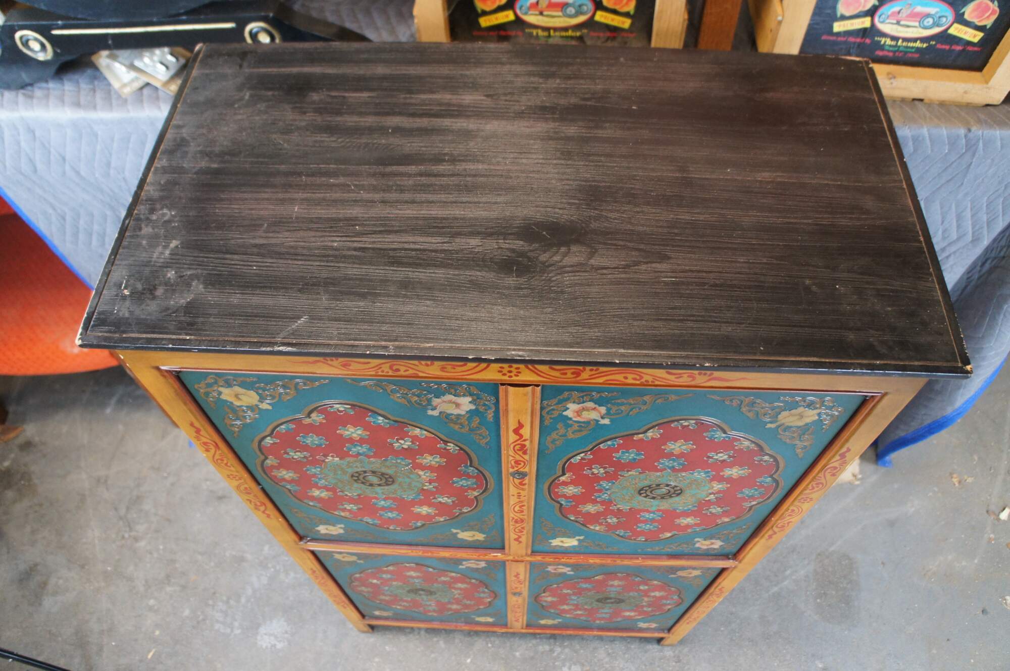 Vintage Moroccan/ Bohemian wine/ liquor/ bar cabinet featuring boho styling with vibrant turquoise, gold, red motif with embossed floral medallions. Cabinet opens to multiple cubbies and drawers with pull-out shelf and lower storage for up to 32 bottles. Could also be used as a linen press/ storage wardrobe.
