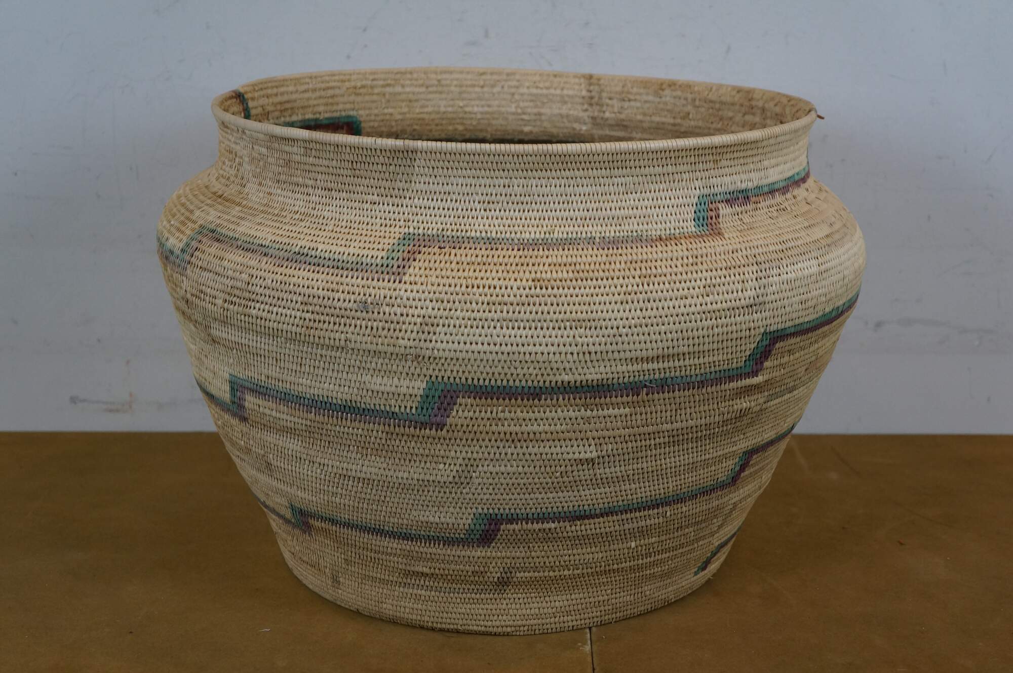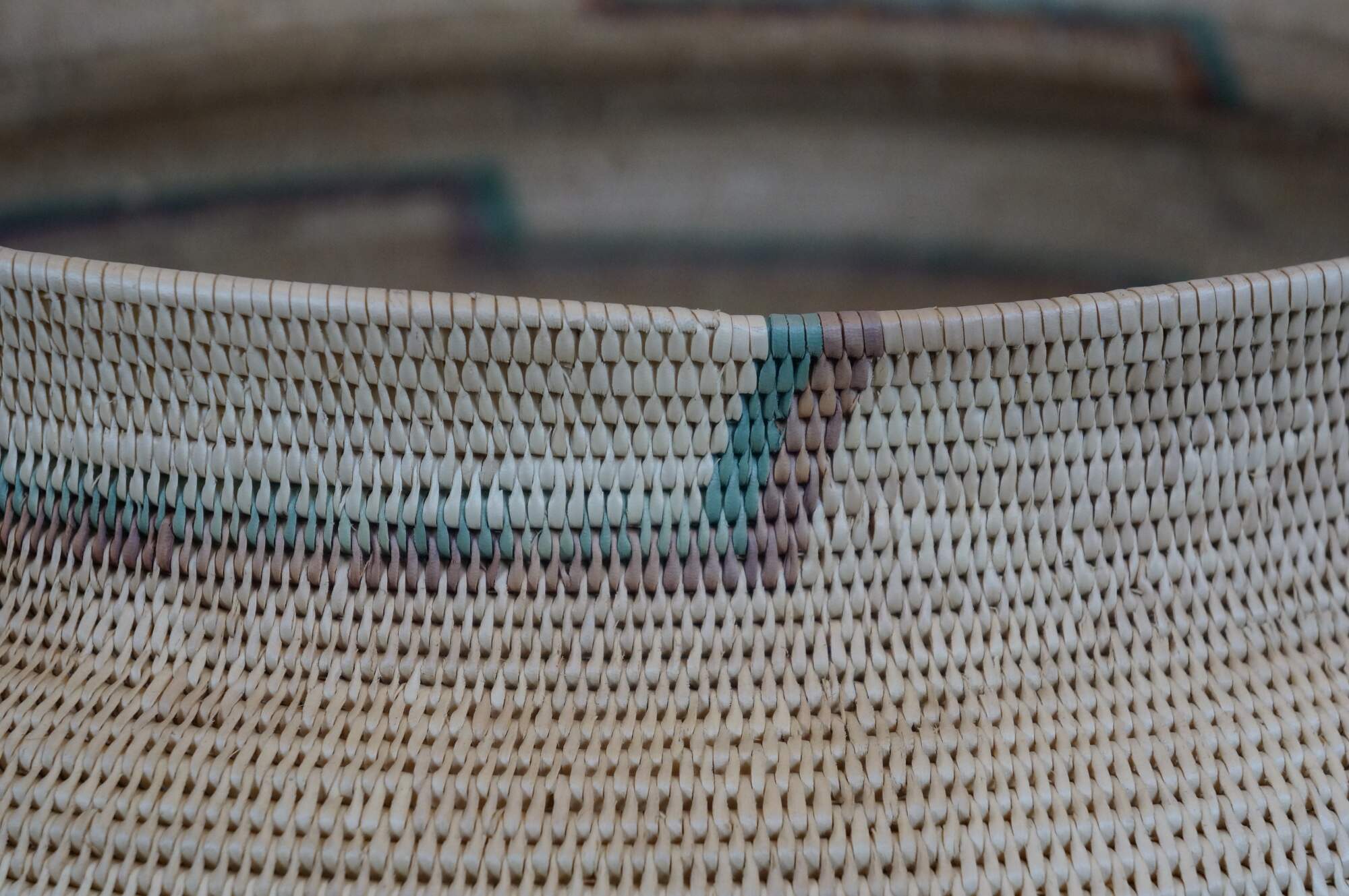 Late 20th century palm leaf basket vase / urn, hand woven in natural beige with a meandering stripe of purple and teal green. Attributed to Shalimar Collection.